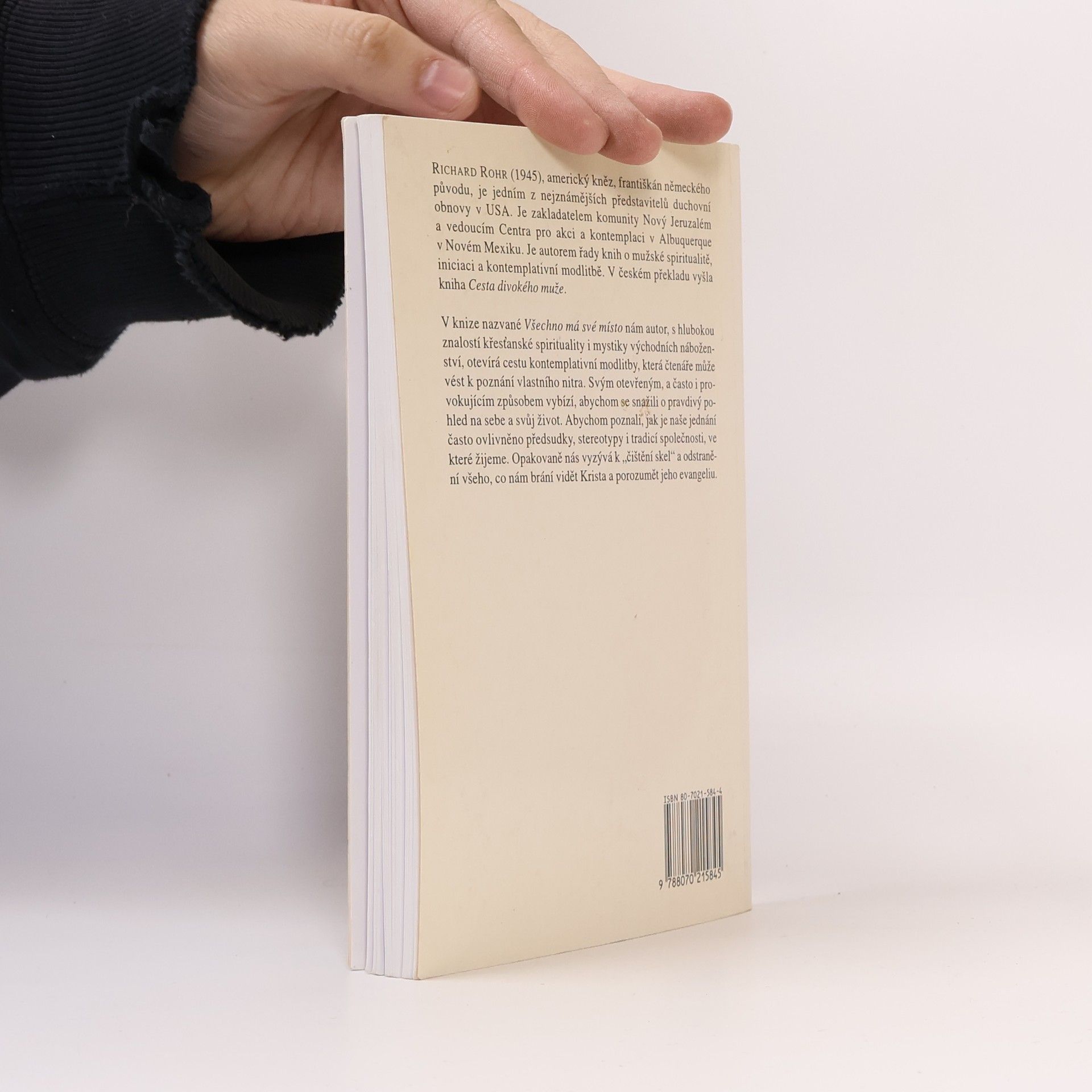 Americký kněz, františkán německého původu, Richard Rohr (1945) je jedním z nejznámějších představitelů duchovní obnovy v USA. Je zakladatelem komunity Nový Jeruzalém a vedoucím Centra pro akci a kontemplaci v Albuquerque v Novém Mexiku. Je autorem řady knih o mužské spiritualitě, iniciaci a kontemplativní modlitbě. V knize nazvané Všechno má své místo nám autor, s hlubokou znalostí křesťanské spirituality i mystiky východních náboženství, otevírá cestu kontemplativní modlitby, která nás může vést k poznání vlastního nitra. "Jsme skálopevně přesvědčeni o tom, čemu věříme, i když se tak často mýlíme." "Odmítáme svoji slabost a přeceňujeme svoji sílu. Děláme to všichni. Má to smysl. Proč dělat to, v čem jsme slabí, zvláště v první polovině života, kdy vítězit je tak důležité."