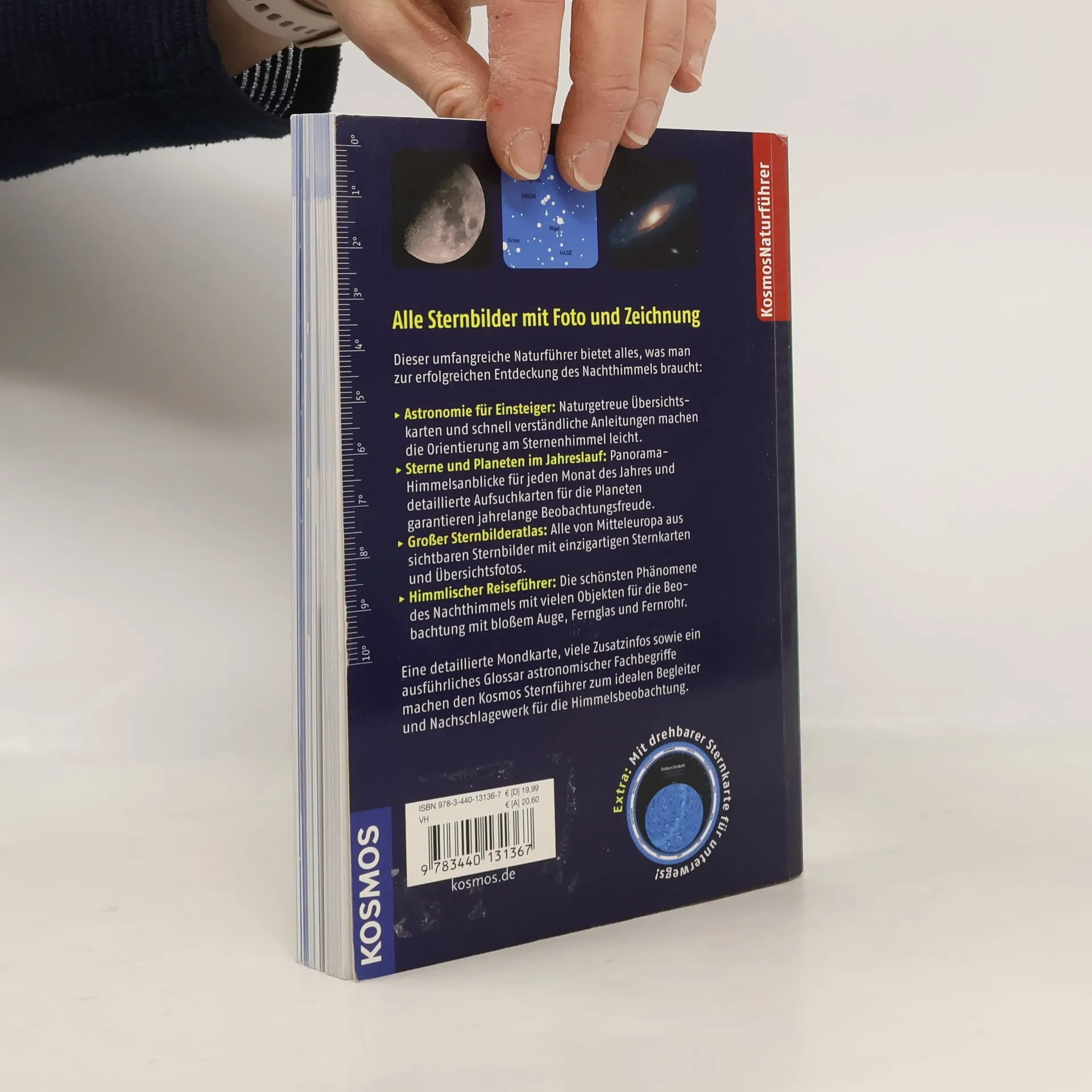 Dieser umfangreiche Naturführer bietet alles, was man zur erfolgreichen Entdeckung des Nachthimmels braucht: Naturgetreue Übersichtskarten und schnell verständliche Anleitungen machen die Orientierung am Sternenhimmel auch für Einsteiger leicht. Panorama-Himmelsanblicke für jeden Monat des Jahres und detaillierte Aufsuchkarten für die Planeten garantieren jahrelange Beobachtungsfreude. Im großen Sternbilderatlas werden alle von Mitteleuropa aus sichtbaren Sternbilder mit einzigartigen Sternkarten und Übersichtsfotos vorgestellt. Entdecken Sie in diesem himmlischen Reiseführer die schönsten Phänomene des Nachthimmels mit vielen Objekten für die Beobachtung mit bloßem Auge, Fernglas und Fernrohr. Eine detaillierte Mondkarte, viele Zusatzinfos sowie ein ausführliches Glossar astronomischer Fachbegriffe machen den Kosmos Sternführer zum idealen Begleiter und Nachschlagewerk für die Himmelsbeobachtung. Extra: Mit drehbarer Sternkarte für unterwegs!