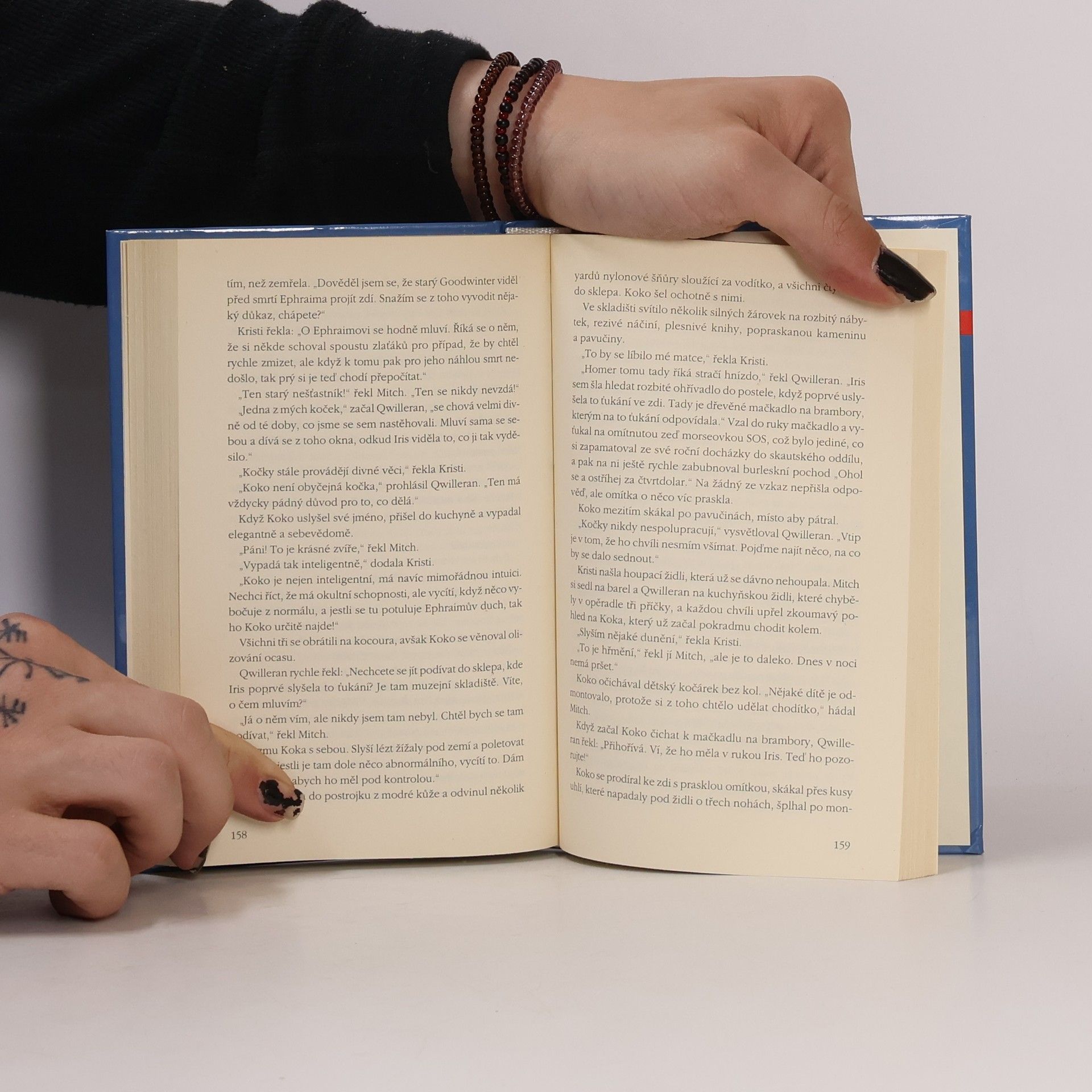 Ve starém venkovském domě plném starožitností se začnou ozývat prapodivné zvuky - vzdechy steny, křik a šramot. Znepokojená majitelka Iris Cobbová volá na pomoc Jima Qwillerana. Starý skeptik si ale dává načas, a když se konečně dostaví, je jeho laskavá bývalá hospodyně vyděšená k smrti. Ale kdo to má na svědomí? Nebo co? Qwilleran nasadí do akce své dvě siamské kočky - ještě že aspoň ty stojí všemi čtyřmi tlapkami pevně na zemi. Protože duchové, které Qwilleran nechtěně vyvolá, se ukážou jako mizerná banda a jen génius Kokova formátu se jim může dostat na kobylku a vyčenichat klíč k vraždě. Kočky jsou totiž stopaři z nejlepších...