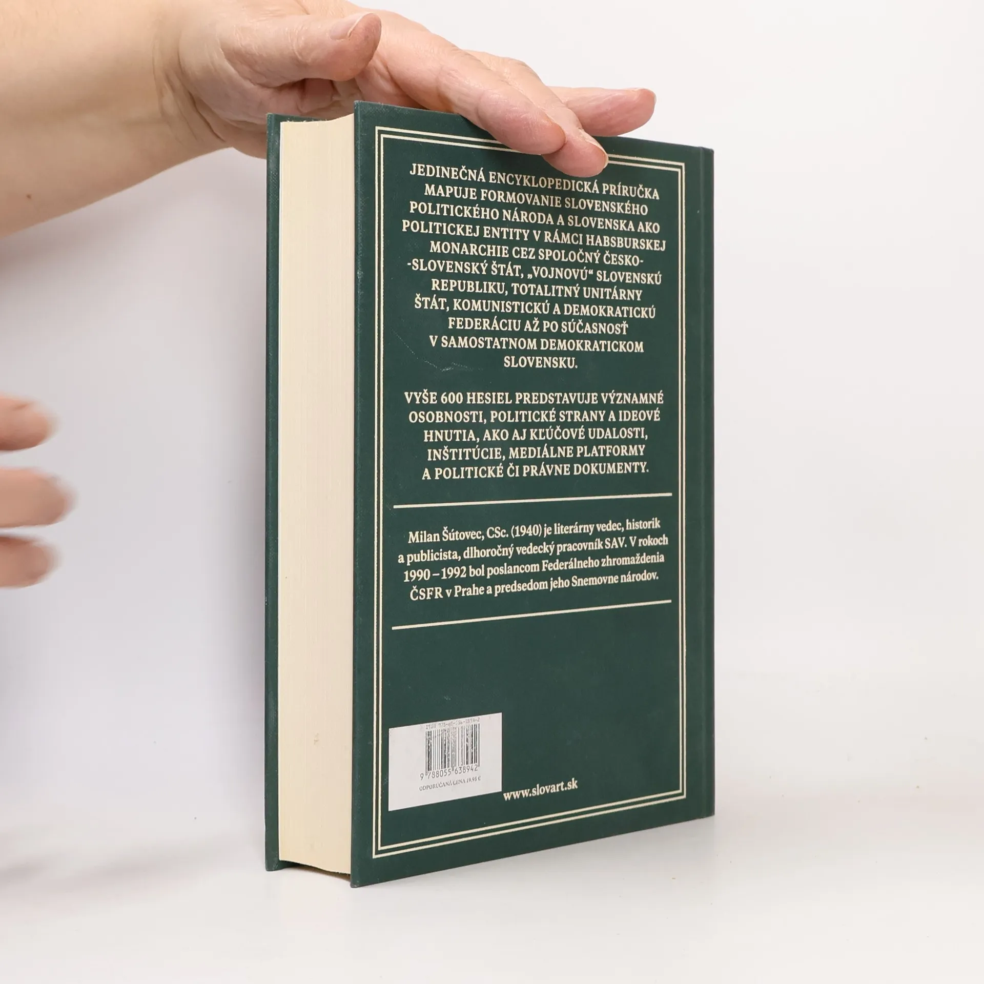 Aktéri, dokumenty, inštitúcie, politické strany, udalosti Jedinečná encyklopedická príručka mapuje politický život Slovákov od počiatkov formovania slovenského národa a jeho elít v rámci habsburskej monarchie cez spoločný česko-slovenský štát a „vojnovú“ Slovenskú republiku až po súčasnosť. Vyše 600 hesiel predstavuje významné osobnosti, kľúčové udalosti, inštitúcie, mediálne platformy politického života a myslenia (noviny, časopisy), politické a právne dokumenty, politické strany či ideové hnutia. Kniha je primárne určená najmä študentom spoločenských vied, práva či ekonomiky, adeptom politiky a verejného života, publicistom a pedagógom, dobre však poslúži všetkým záujemcom o prehĺbenie znalostí v oblasti slovenských dejín.