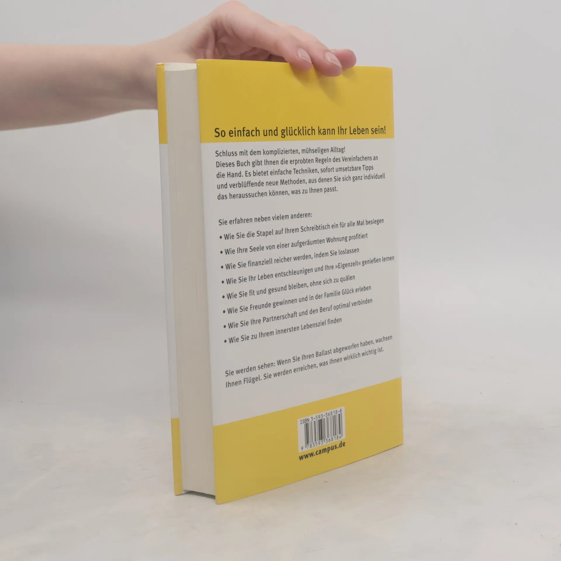 Die meisten Menschen leiden unter der Kompliziertheit des Lebens. simplify your life schafft Abhilfe, indem es jedem Leser die einfachen Regeln des Vereinfachens an die Hand gibt, mit denen er individuell und auf seine Bedürfnisse zugeschnitten sein Leben gestalten kann. Der simplify-Prozess ist ein spannender und einzigartiger Weg in sieben Etappen, an dessen Ende ein glückliches und zufriedenes Leben steht. Die Reise verläuft dabei vom Äußeren zum Inneren. Man beginnt mit dem Aufräumen und Vereinfachen des Schreibtischs, der Organisation der Zeit, gelangt zu den sozialen Beziehungen und Partnerschaften und bringt seine Geldangelegenheiten in Ordnung. Schließlich führt der simplify-Prozess weiter zum Körper und der Gesundheit und endet bei der zentralen Frage nach dem Selbst und dem Sinn des Lebens. Wie eine Raupe, die die Flügel des Schmetterlings als Anlage schon in sich trägt, wird der Leser den Weg zur Mitte - seinem Ich - und zum Wesentlichen finden. Am Ende, wenn er alle sieben Wege durchlaufen und sämtlichen Ballast abgeworfen hat, wachsen ihm Flügel und er kann endlich das erreichen, was ihm wirklich wichtig ist.