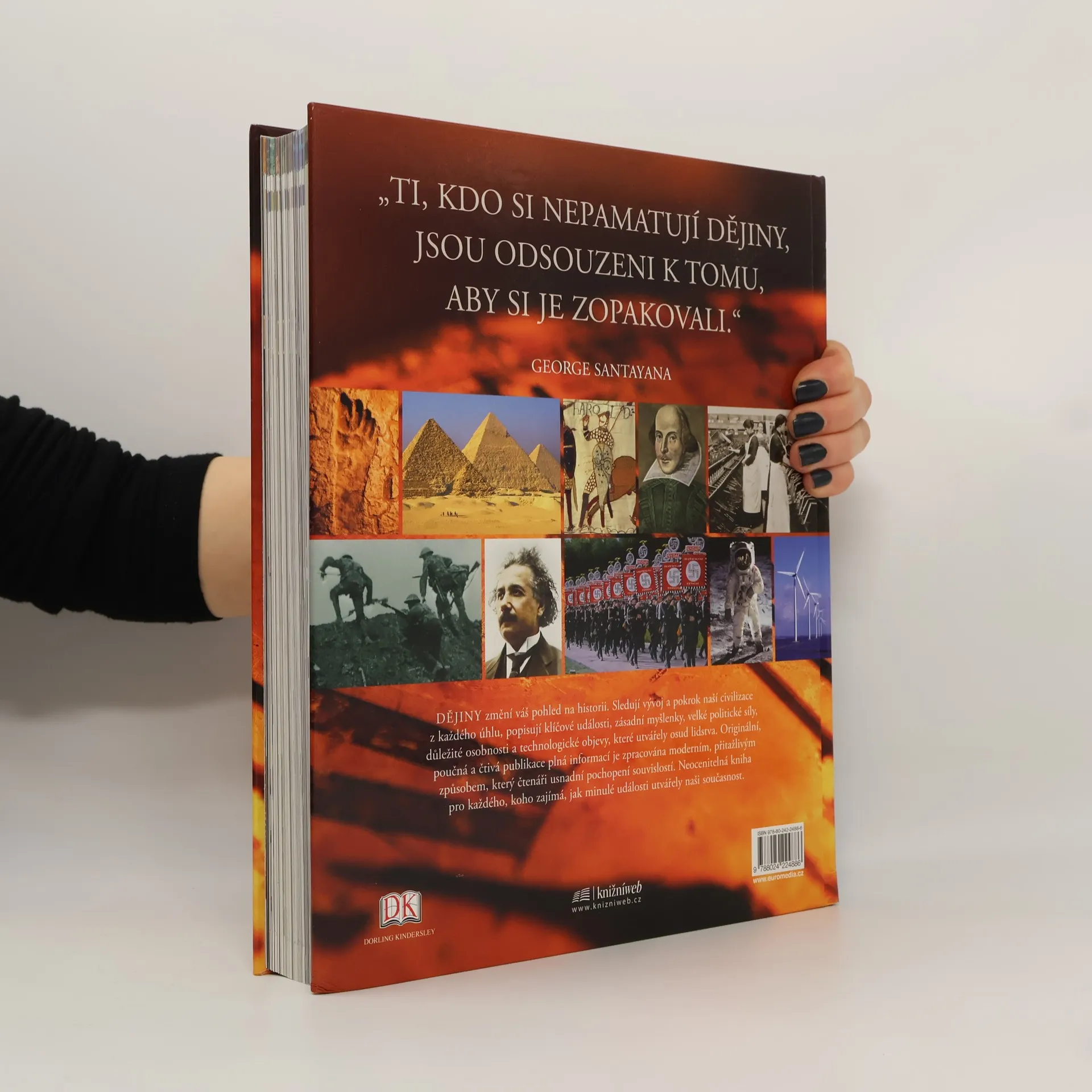 V řadě velkých encyklopedických publikací Zvíře, Člověk, Země atd. představujeme velkoryse pojatý svazek věnovaný dějinám lidstva, od prapočátku po současnost. Texty fundovaných odborníků s bohatým obrazovým doprovodem provázejí čtenáře dlouhým příběhem světových dějin a seznamují ho s významnými událostmi, politickými změnami, válečnými střety atd. Tato kniha však není jen o událostech, které předurčily podobu moderního světa a utvořily identitu nás samotných. Nemenší pozornost je věnována také světu idejí. Jsou zde zkoumány takové fenomény, jako je demokracie, myšlenka evoluce či globalizace. Naleznete zde také biografické medailonky nejvlivnějších osob světových dějin od faraona Ramesse II. až po Martina Luthera Kinga. A na své si přijde i milovník vědy a techniky. Setká se zde s klíčovými inovacemi, vynálezy, vědeckými objevy a teoriemi, které ovlivnily lidské působení na Zemi; od prvního užívání ohně a zpracování kovů až po internet a od DNA až po globální oteplování. Díky působivým fotografiím, mapkám, časovým osám, křížovým odkazům a dalším pomůckám se v knize čtenář snadno zorientuje a Dějiny pro něj budou nejen cennou příručkou, ale i výtvarně působivou obrazovou publikací.