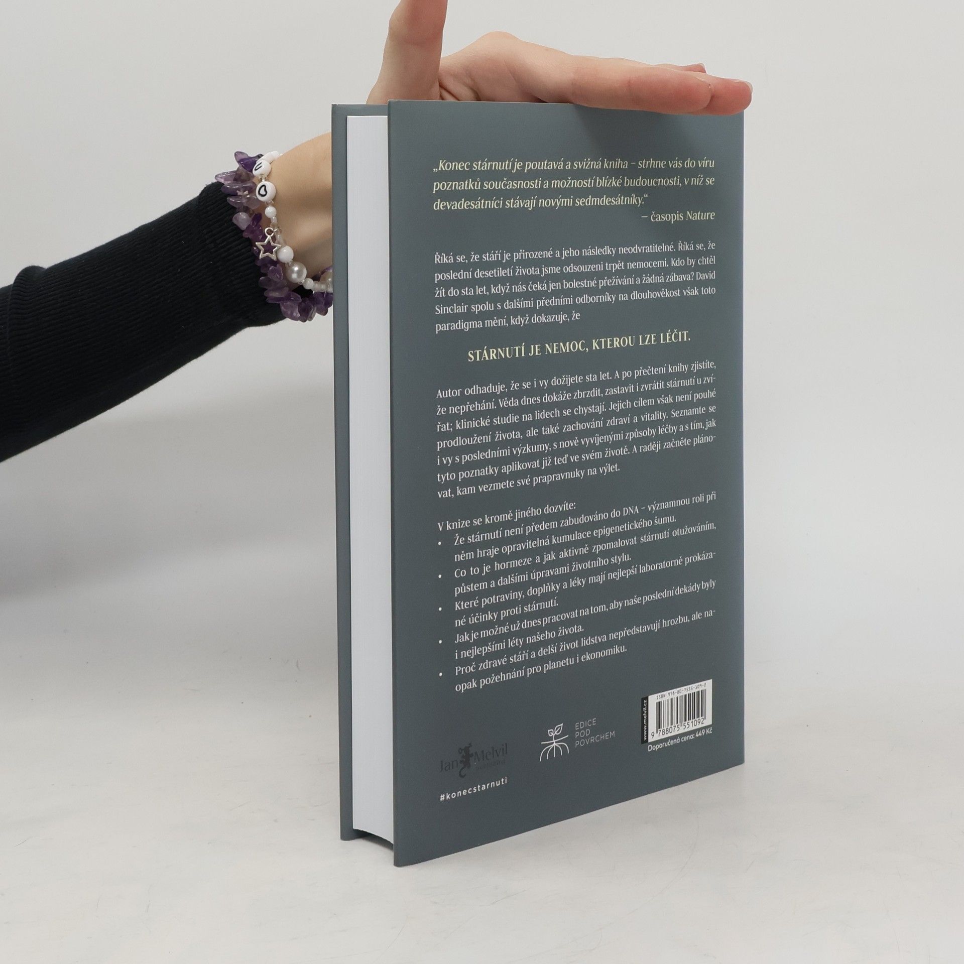 Říká se, že stáří je přirozené a jeho následky neodvratitelné. Říká se, že poslední desetiletí života jsme odsouzeni trpět nemocemi. Kdo by chtěl žít do sta let, když nás čeká jen bolestné přežívání a žádná zábava? David Sinclair spolu s dalšími předními odborníky na dlouhověkost však toto paradigma mění, když dokazuje, že STÁRNUTÍ JE NEMOC, KTEROU LZE LÉČIT. Autor odhaduje, že se i vy dožijete sta let. A po přečtení knihy zjistíte, že nepřehání. Věda dnes dokáže zbrzdit zastavit i zvrátit stárnutí zvířat, klinické studie na lidech se chystají. Jejich cílem však není pouhé prodloužení života, ale také zachování zdraví a vitality. Seznamte se i vy s posledními výzkumy, s nově vyvíjenými způsoby léčby a s tím, jak tyto poznatky aplikovat již teď ve svém životě. A raději začněte plánovat, kam vezmete své prapravnuky na výlet. V knize se mimo jiné dozvíte - Že stárnutí není předem zabudováno do DNA – významnou roli při něm hraje opravitelná kumulace epigenetického šumu. - Co je to hormeze a jak aktivně zpomalovat stárnutí otužováním, půstem a dalšími úpravami životního stylu. - Které potraviny, doplňky a léky mají nejlepší laboratorně prokázané účinky proti stárnutí. - Jak je možné už dnes pracovat na tom, aby naše poslední dekády byly i nejlepšími léty našeho života. - Proč zdravé stáří a delší život lidstva nepředstavují hrozbu, ale naopak požehnání pro planetu i ekonomiku.