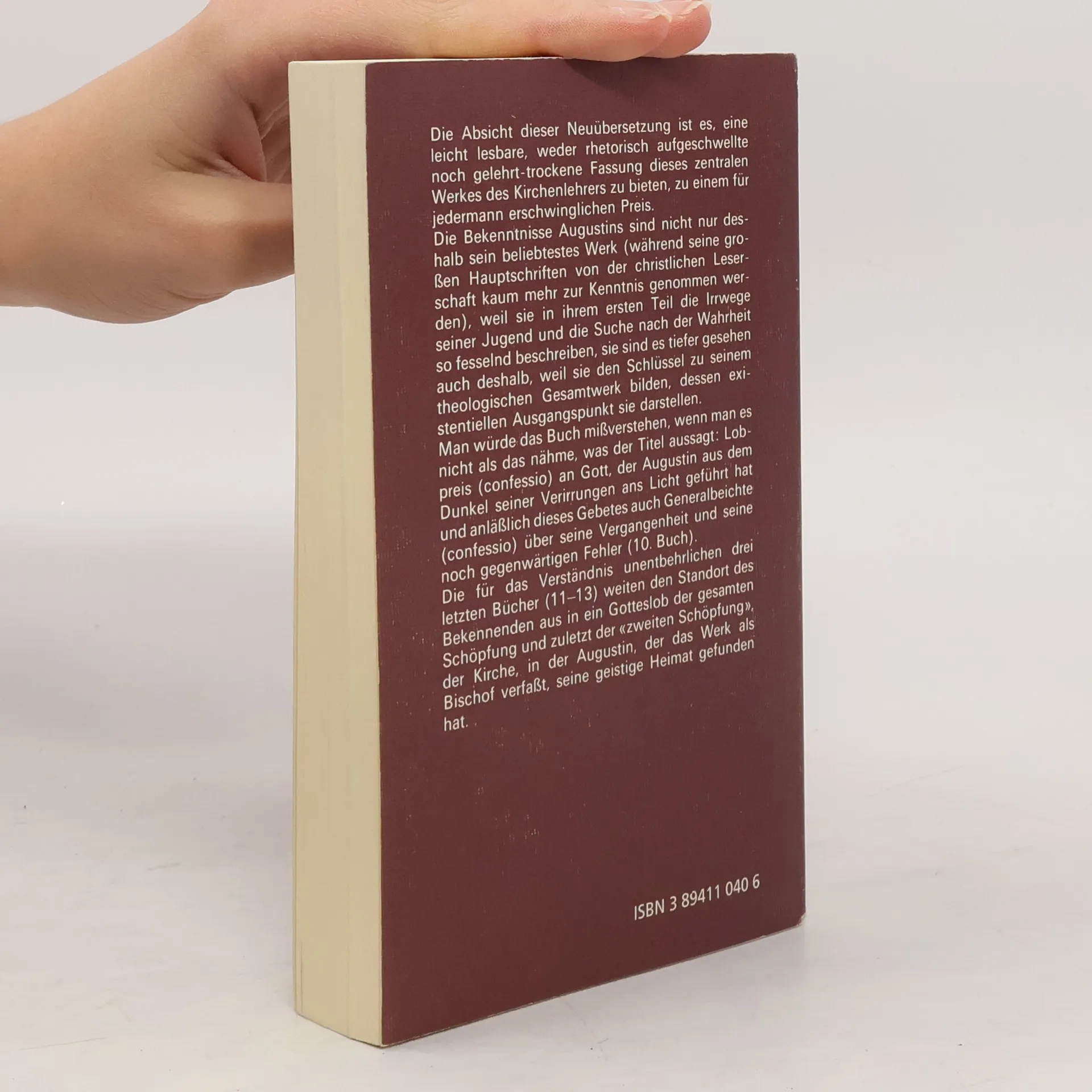Auf der Höhe seines Lebens, um 397/98, schreibt Augustinus die Bekenntnisse . Jede literarische Selbstdarstellung, von Petrarca über Montaigne und Rousseau bis in die Gegenwart, fußt bewußt oder unbewußt auf diesem großen Vorbild. Unzählige haben in den von Augustinus beschriebenen Verirrungen die eigenen Schwächen und Verfehlungen erkannt und sich so in diesem Buch wiedergefunden. Höhepunkt von Augustinus' Autobiographie ist die Geschichte der eigenen Bekehrung. Mit stilistischer und rhetorischer Meisterschaft beschreibt Augustinus die Versuche des Menschen, sich von Gott zu lösen und den Weg des eigenen Selbst zu gehen, und seine dabei immer wiederkehrende Erfahrung, daß er sich einer göttlichen Fügung beugen muß, daß er – wie Augustinus sagt – von Gott umschlossen ist.
