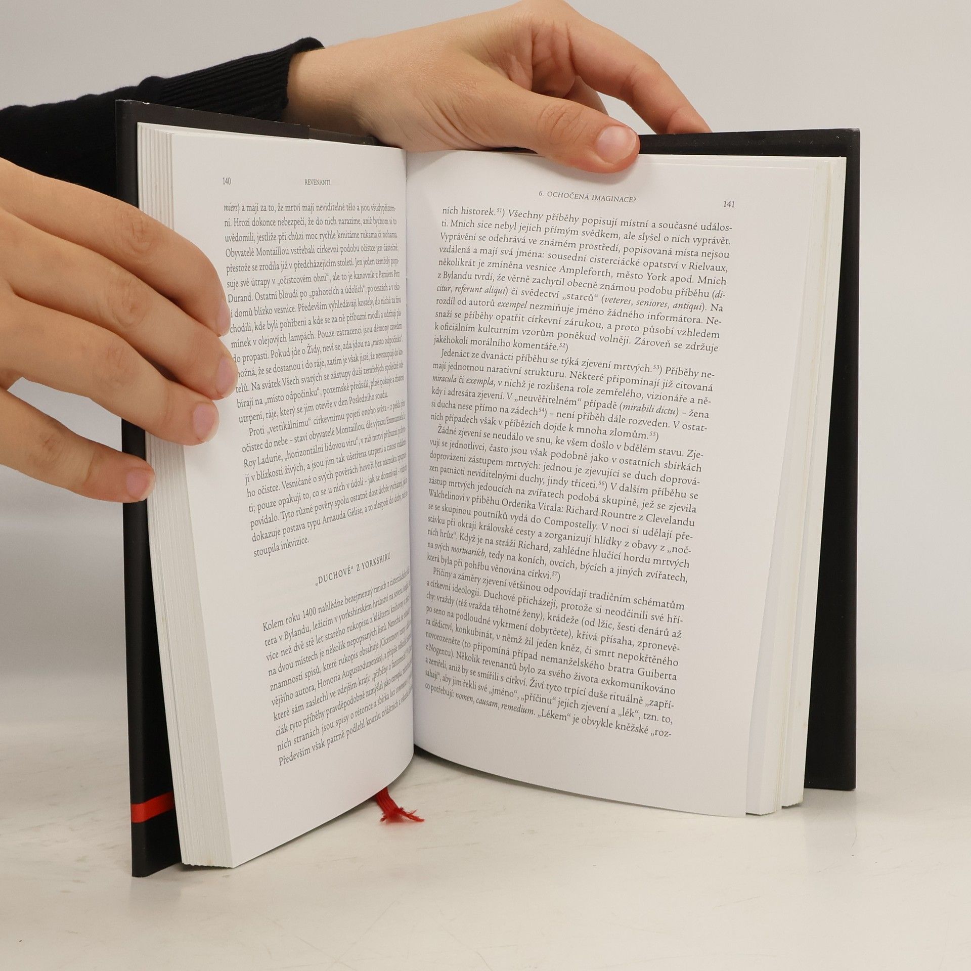 Život a smrt představují ve středověku kategorie, jež od sebe nejsou tak striktně rozděleny, jako je tomu v současnosti. Kniha předního francouzského medievalisty velice poutavým způsobem odhaluje právě onu provázanost těchto dvou světů a jejich odraz v dobové středověké mentalitě. Hlavními hrdiny Schmittovy práce jsou revenanti, navrátilci ze záhrobí, lidé kteří zemřeli i nezemřeli, kteří se vrací ze světa duchů, aby strašili věřící, nabádali je ke křesťanskému životu bez hříchu, sdělovali jim „božská“ či „ďábelská“ poselství a vytvářeli kulturní ovzduší, v němž jsou hranice mezi oním a jsoucím světem téměř neznatelné. Díky odborné erudici a díky vytěžení jak psaných, tak i ikonografických pramenů, patří tato kniha ke klasice moderní medievalistiky.