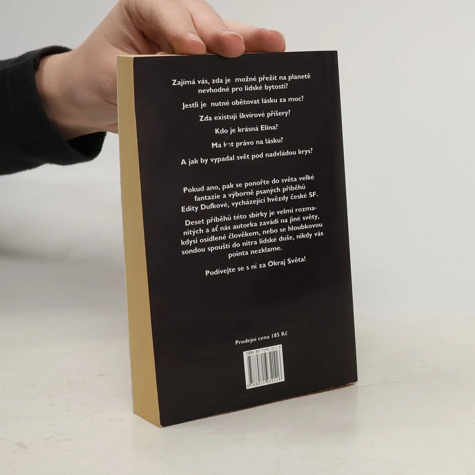 Zajímá vás, zda je možné přežít na planetě nevhodné pro lidské bytosti? Jestli je nutné obětovat lásku za moc? Zda existují škvírové příšery? Kdo je krásná Elina? Má kat právo na lásku? A jak by vypadal svět pod nadvládou krys? Pokud ano, pak se ponořte do světa velké fantazie a výborně psaných příběhů Edity Dufkové, vycházející hvězdy české SF. Jedenáct příběhů této sbírky je velmi rozmanitých a ať nás autorka zavádí na jiné světy, kdysi obydlené člověkem, nebo se hloubkovou sondou spouští do nitra lidské duše, nikdy vás pointa nezklame. Podívejte se s ní za Okraj Světa! Povídky: - Spálení a hořící - Nebudeš mutantem! - Propadlé světy - Škvírové příšery - Kamir - Vymítání andělů - Věc Elina - Křížové hřeby - Za okraj Světa - O mrtvém koni - Nezvrácené osudy