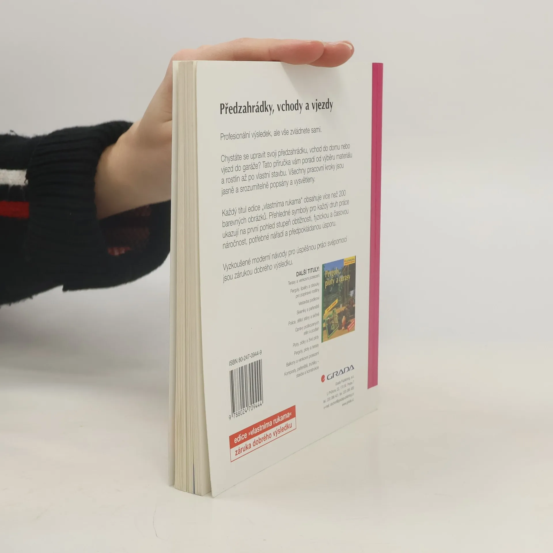 Chystáte se upravit svoji předzahrádku, vchod do domu nebo vjezd do garáže? Tato příručka vám poradí od výběru materiálu a rostlin až po vlastní stavbu. Všechny pracovní kroky jsou jasně a srozumitelně popsány a vysvětleny. Získáte informace o nejvhodnějších materiálech, nejlepších postupech a nejvhodnějším osazení vaší předzahrádky. Na jednotlivých projektech pak uvidíte, jak získáte krásnou travnatou cestu, kryté parkovací místo, branku i vchod do domu obrostlé růžemi, jak vydláždit vjezd do garáže, jak se zbavit únavného pletí použitím ekonologické textilie, naučíte se postavit masivní žulové schody nebo spirálový bylinkový záhon. Každý titul edice „vlastníma rukama“ obsahuje více než 200 barevných obrázků. Přehledné symboly pro každý druh práce ukazují na první pohled stupeň obtížnosti, fyzickou a časovou náročnost, potřebné nářadí a předpokládanou úsporu. Vyzkoušené moderní návody pro úspěšnou práci svépomocí jsou zárukou dobrého výsledku.