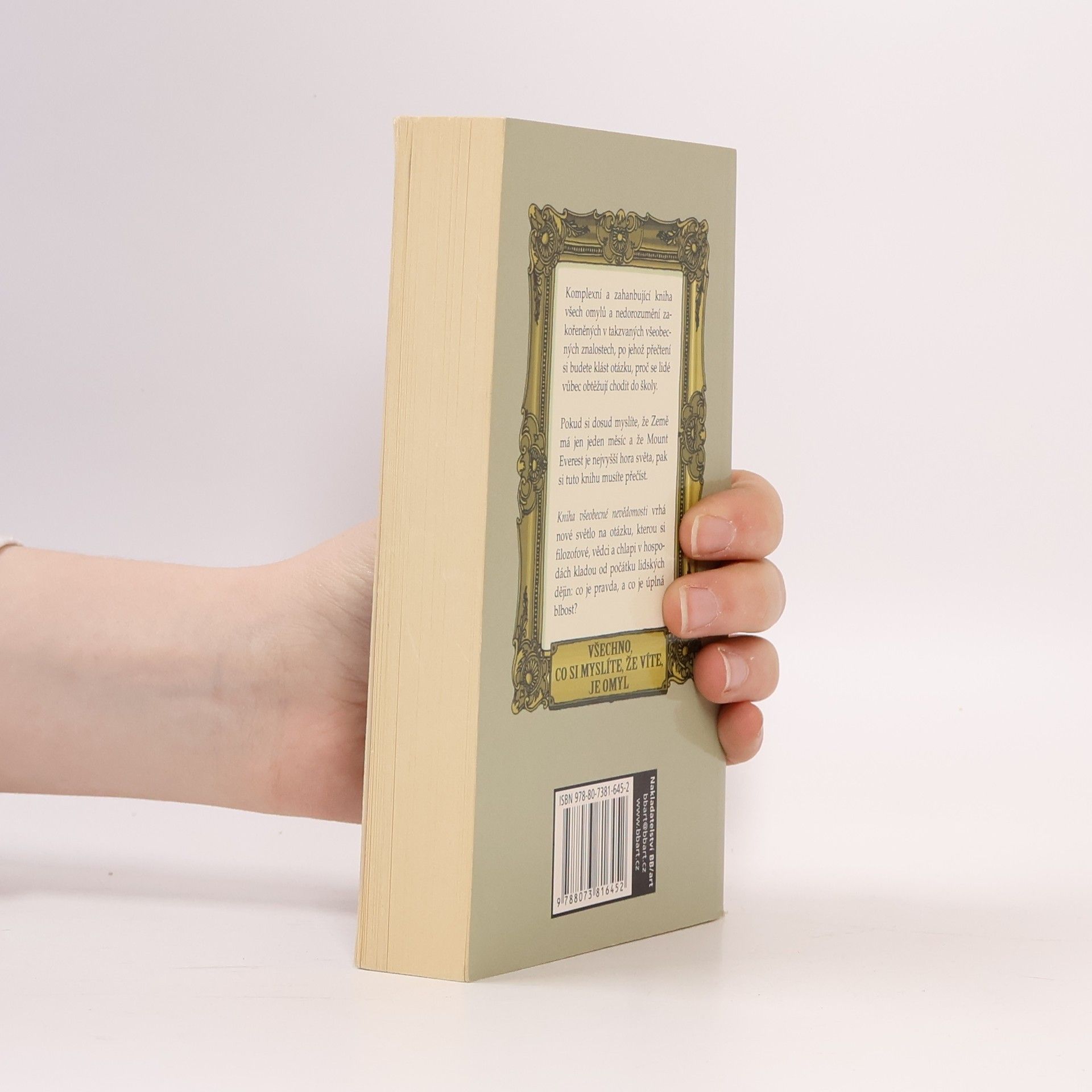 Pokud si dosud myslíte, že Země má jen jeden měsíc a že Mount Everest je nejvyšší hora světa, pak si tuto knihu musíte přečíst. A to bezodkladně. Kniha všeobecné nevědomosti vrhá nové světlo na otázku, kterou si filozofové, vědci a chlapi v hospodách kladou od počátku lidských dějin: co je pravda, a co je úplná blbost? Thomas Edison prohlásil, že toho o čemkoli víme méně než miliontinu procenta; Mark Twain se domníval, že dokonalé zvládnutí samotné matematiky by trvalo osm milionů let; Woody Allen řekl, že zatímco někteří pijí plnými doušky z řeky moudrosti, jiní pouze kloktají. Po přečtení této knihy si budete připadat velmi malí a velmi hloupí. Země má sedm měsíců. Každý člověk má čtyři nozdry. Parní stroj vynalezli ve starověkém Řecku. Bangkok není hlavní město Thajska. Svišti mají na svědomí život více než miliardy lidí. V Sluneční soustavě je 80 000 planet. Světlo je neviditelné. Všechno, co si myslíte, že víte, je omyl.