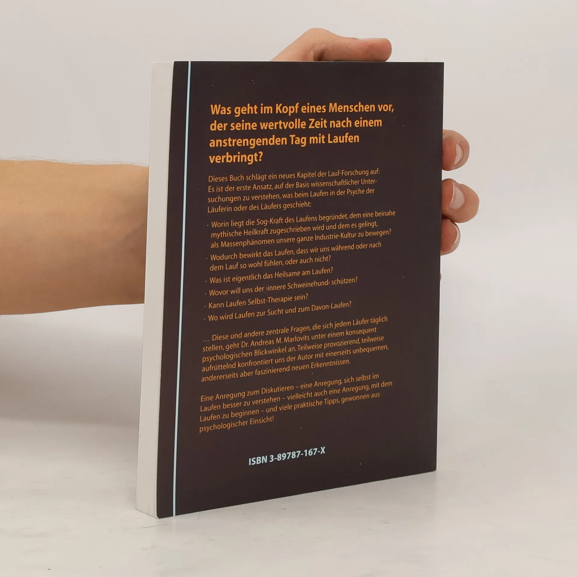 Was geht im Kopf eines Menschen vor, der seine wertvolle Zeit nach einem anstrengenden Tag mit Laufen verbringt? Dieses Buch schlägt ein neues Kapitel der Lauf-Forschung auf: Es ist der erste Ansatz, auf der Basis wissenschaftlicher Untersuchungen zu verstehen, was beim Laufen in der Psyche der Läuferin oder des Läufers geschieht: Worin liegt die Sog-Kraft des Laufens begründet, dem eine beinahe mythische Heilkraft zugeschrieben wird und dem es gelingt, als Massenphänomen unsere ganze Industrie-Kultur zu bewegen? Wodurch bewirkt das Laufen, dass wir uns während oder nach dem Lauf so wohl fühlen, oder auch nicht? Was ist eigentlich das Heilsame am Laufen? Wovor will uns der ›innere Schweinehund‹ schützen? Kann Laufen Selbst-Therapie sein? Wo wird Laufen zur Sucht und zum Davon-Laufen? … Diese und andere zentrale Fragen, die sich jedem Läufer täglich stellen, geht Dr. Andreas M. Marlovits unter einem konsequent psychologischen Blickwinkel an. Teilweise provozierend, teilweise aufrüttelnd konfrontiert uns der Autor mit einerseits unbequemen, andererseits aber faszinierend neuen Erkenntnissen. Eine Anregung zum Diskutieren – eine Anregung, sich selbst im Laufen besser zu verstehen – vielleicht auch eine Anregung, mit dem Laufen zu beginnen – und viele praktische Tipps, gewonnen aus psychologischer Einsicht!