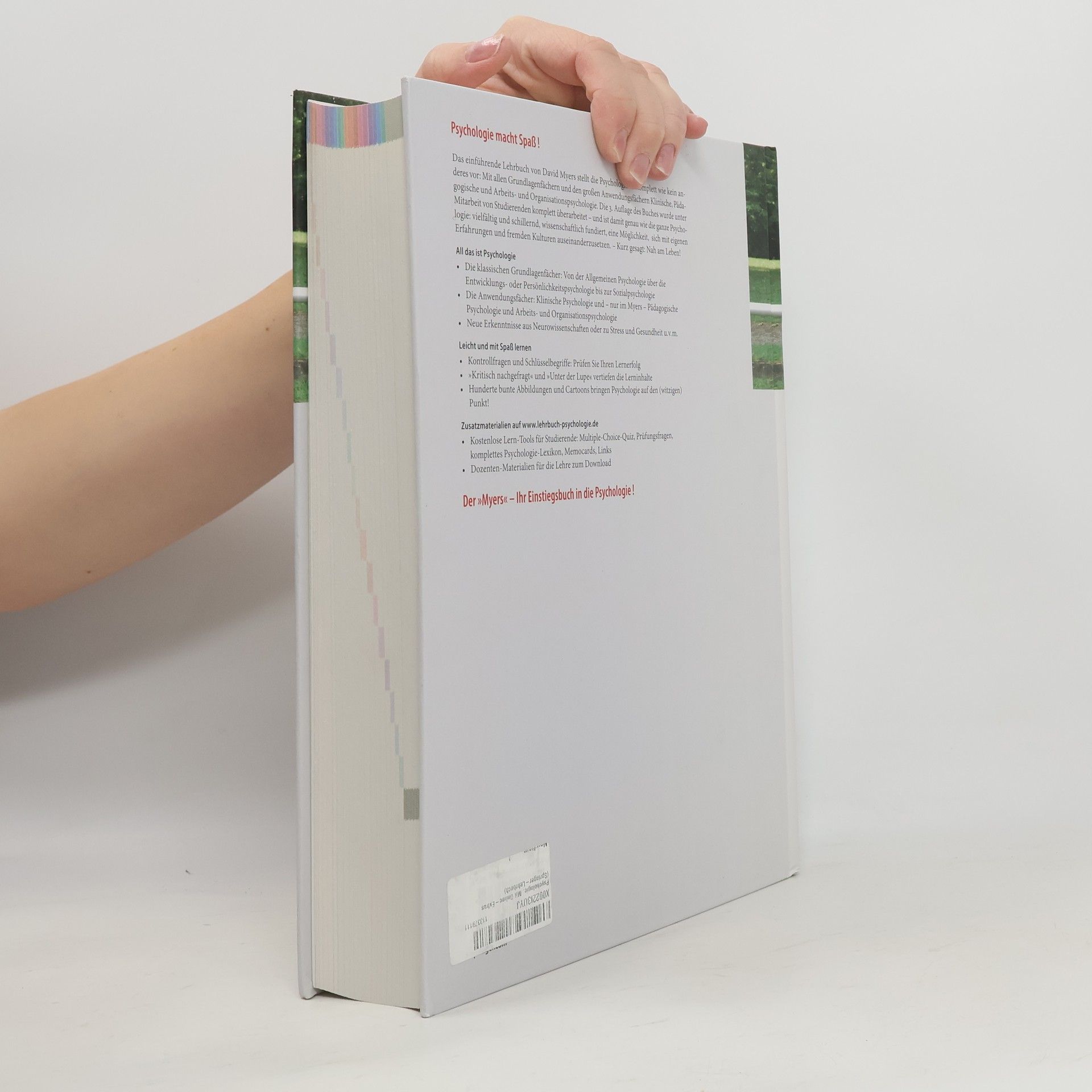 Die Psychologie – vielfältig und schillernd: Ein Fach mit spannenden Teilgebieten und kontroversen Diskussionen, eine fundierte Wissenschaft, eine Möglichkeit, sich mit eigenen Erfahrungen und fremden Kulturen auseinanderzusetzen – nah am Leben! Das einführende Lehrbuch von David Myers stellt das Fach so komplett wie kein anderes vor: alle Grundlagenfächer und die 3 großen Anwendungsfächer Klinische, Pädagogische und Arbeits- und Organisationspsychologie. Die 3. Auflage wurde - unter Mitarbeit von Studierenden - komplett überarbeitet. Leicht lernen: Mit leicht verständlichen, unterhaltsamen Kapiteln, klaren Definitionen, „bunten“ Exkursen, Zusammenfassungen und Prüfungsfragen am Kapitelende. Mit interaktiver Lernwebsite und umfangreichem Zusatzmaterial. Und mit Spaß: Über 900 bunte Abbildungen und Cartoons bringen Psychologie auf den (witzigen) Punkt! Psychologisch denken: Durch zahlreiche Leitfragen, Denkanstöße und Übungen zeigt Myers, wie das Wissen angewendet wird, wo Psychologie im Alltag zu erfahren ist. Ob Sie Psychologie studieren oder zu denen gehören, die schon immer wissen wollten: Was sagen eigentlich die Psychologen dazu? – Der MYERS ist Ihr Einstiegsbuch in die Psychologie!