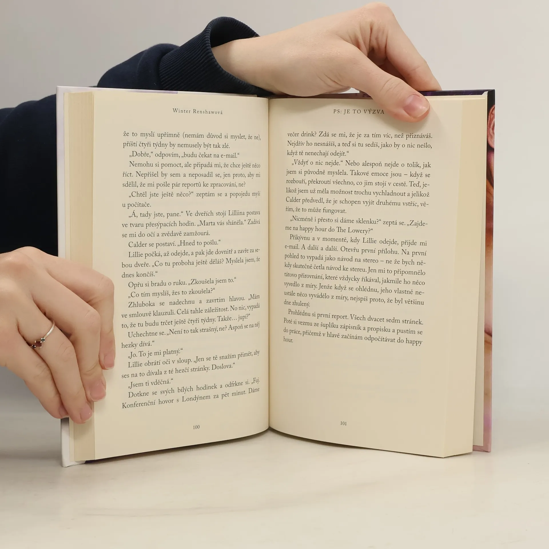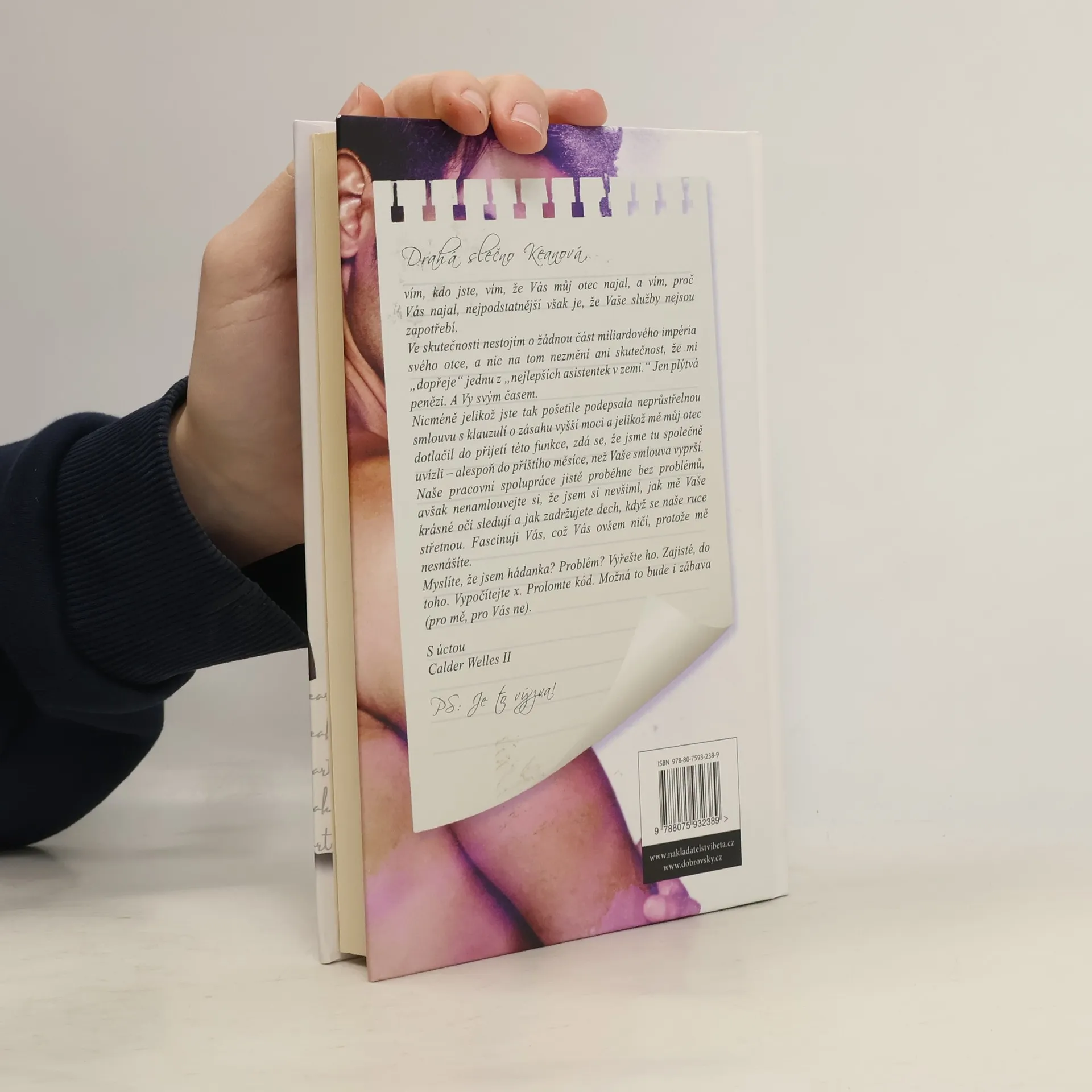 Drahá slečno Keanová, dříve, než tato směšná domluva započne, dovolte mi, abych se dostatečně jasně vyjádřil: vím, kdo jste, vím, že Vás můj otec najal, a vím, proč Vás najal, nejpodstatnější však je, že Vaše služby nejsou zapotřebí. Ve skutečnosti nestojím o žádnou část miliardového impéria svého otce, a nic na tom nezmění ani skutečnost, že mi „dopřeje“ jednu z „nejlepších asistentek v zemi.“ Jen plýtvá penězi. A Vy svým časem. Nicméně jelikož jste tak pošetile podepsala neprůstřelnou smlouvu s klauzulí o zásahu vyšší moci a jelikož mě můj otec dotlačil do přijetí této funkce, zdá se, že jsme tu společně uvízli – alespoň do příštího měsíce, než Vaše smlouva vyprší. Naše spolupráce ve WellesTechu by měla proběhnout relativně bez problémů, avšak nenamlouvejte si, že jsem si nevšimnul toho, jak mě Vaše krásné oči sledují nebo jak zadržujete dech, když se naše ruce střetnou. Fascinuji Vás, což Vás ničí, protože se mnou stěží dokážete vydržet v jedné místnosti. Máte mě za problém, který stojí za vyřešení? Za nerozluštitelnou hádanku? Zajisté, do toho. Vypočítejte x. Prolomte kód. Možná to bude i legrace (ale pouze pro mě, pro Vás ne). S úctou Calder Welles II PS: Je to výzva!