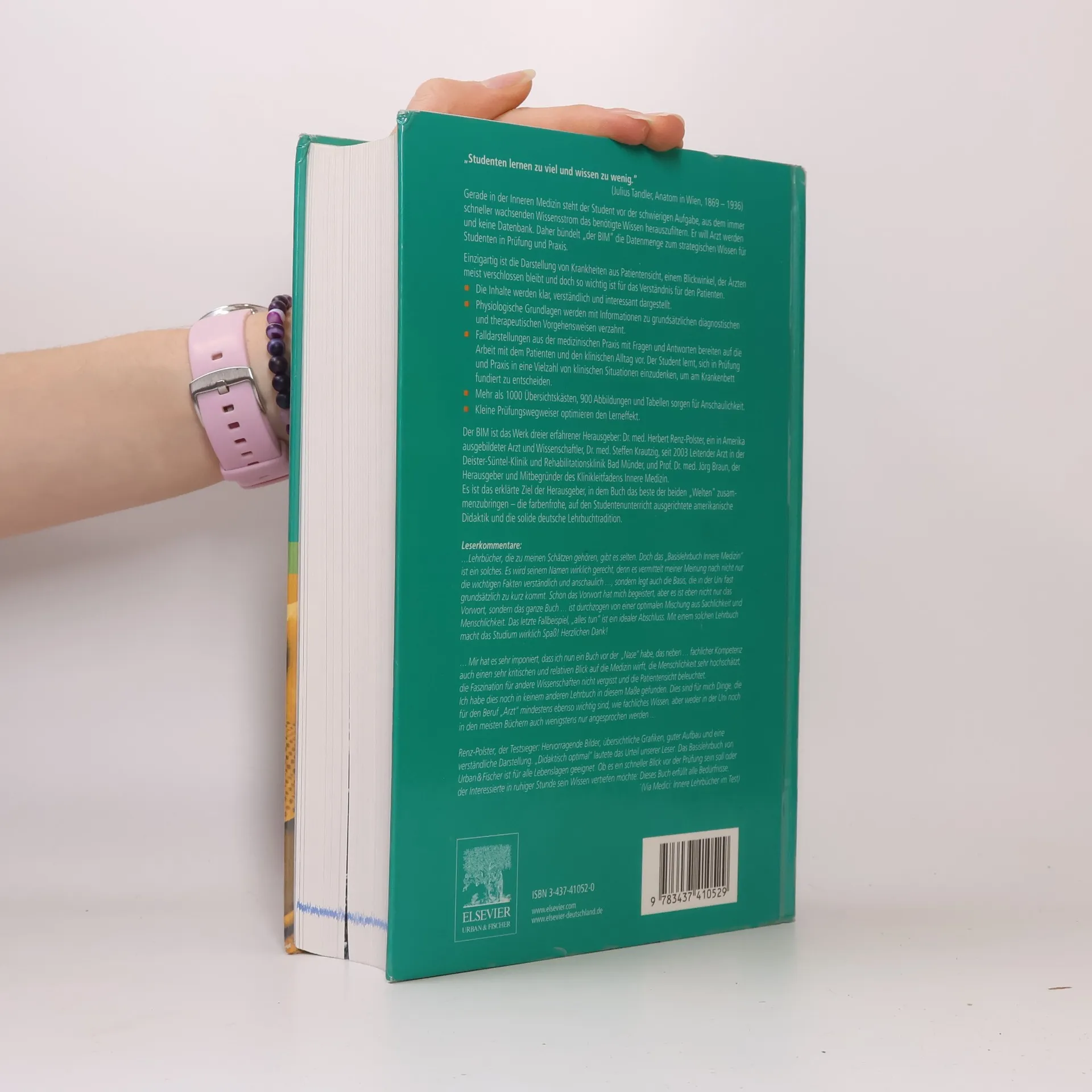 „BIM“ bündelt die gigantische Datenmenge der Inneren Medizin zu strategischem Wissen. Die Inhalte sind so interessant dargestellt, dass sie sich leicht einprägen. Einzigartig ist die Darstellung von Krankheiten aus Patientensicht, einem Blickwinkel, der Ärzten meist verschlossen bleibt und doch so wichtig ist für das Verständnis für den Patienten. BIM vermittelt Basiswissen BIM legt den Fokus auf Praxiswissen Die Inhalte sind nach klinischer Relevanz gewichtet und strukturiert Leicht zu lesen: Die Texte sind klar und journalistisch formuliert BIM verknüpft wie kein anderes Lehrbuch die farbenfrohe, auf Studentenbedürfnisse ausgerichtete amerikanische Didaktik mit solider deutscher Lehrbuchtradition