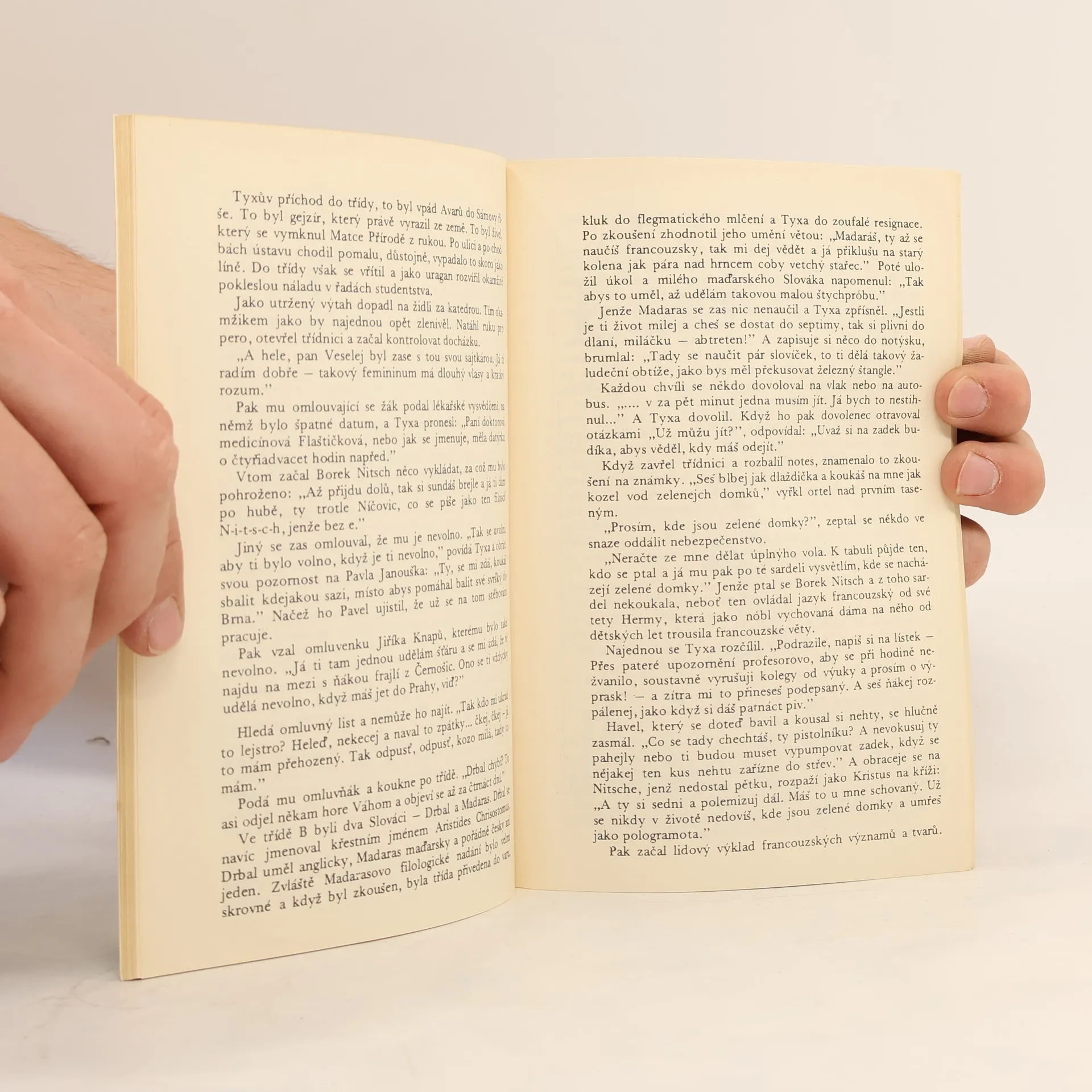 Typický studentský humor, zachycený formou autorových vzpomínek na gymnaziální léta odráží i politické a společenské události doby (válka, rok 1948). Humor v lavicích i za katedrou, ve které se odrážejí i politické a společenské události pohnuté doby.