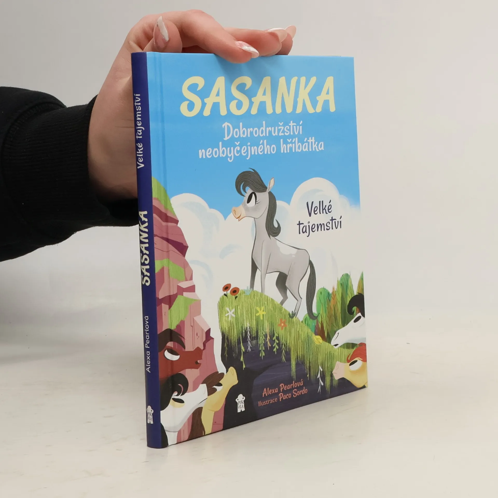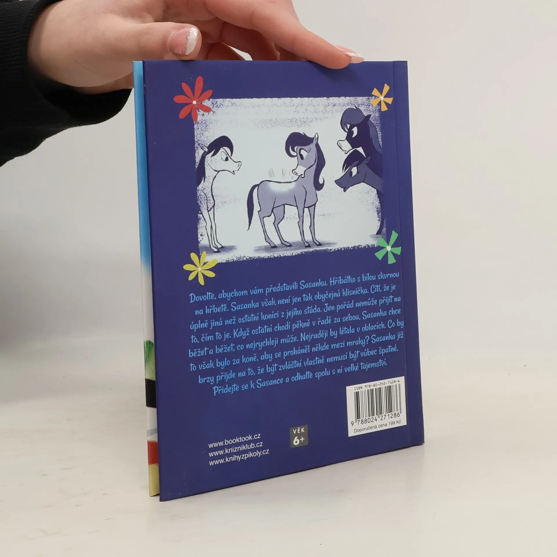 Seznamte se se Sasankou. Hříbátkem se zvláštní bílou skvrnou na hřbetě. Sasanka však není jen tak obyčejná klisnička. Cítí, že je úplně jiná, než ostatní koníci z jejího stáda. Jen pořád nemůže přijít na to, čím to je. Když ostatní chodí pěkně v řadě za sebou, Sasanka chce běžet a běžet, co nejrychleji může. Nejraději by létala v oblacích. Co by to však bylo za koně, aby se proháněl někde mezi mraky? Sasanka již brzy přijde na to, že být zvláštní vlastně nemusí být vůbec špatné. Přidejte se k Sasance a rozlouskněte spolu s ní velké tajemství.