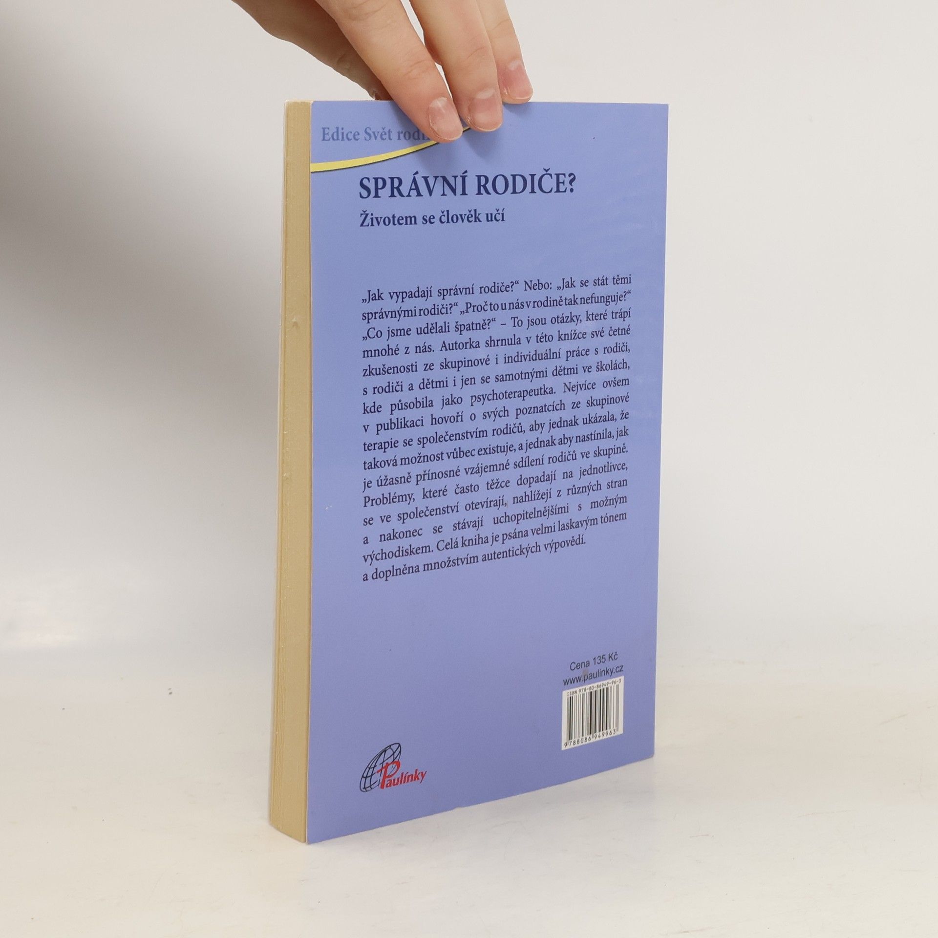 „Jak vypadají správní rodiče?“ Nebo: „Jak se stát těmi správnými rodiči?“ „Proč to u nás v rodině tak nefunguje?“ „Co jsme udělali špatně?“ – To jsou otázky, které trápí mnohé z nás. Autorka shrnula v této knížce své četné zkušenosti ze skupinové i individuální práce s rodiči, s rodiči a dětmi i jen se samotnými dětmi ve školách, kde působila jako psychoterapeutka. Nejvíce ovšem v publikaci hovoří o svých poznatcích ze skupinové terapie se společenstvím rodičů, aby jednak ukázala, že taková možnost vůbec existuje, a jednak aby nastínila, jak je úžasně přínosné vzájemné sdílení rodičů ve skupině. Problémy, které často těžce dopadají na jednotlivce, se ve společenství otevírají, nahlížejí z různých stran a nakonec se stávají uchopitelnějšími s možným východiskem. Celá kniha je psána velmi laskavým tónem a doplněna množstvím autentických výpovědí.