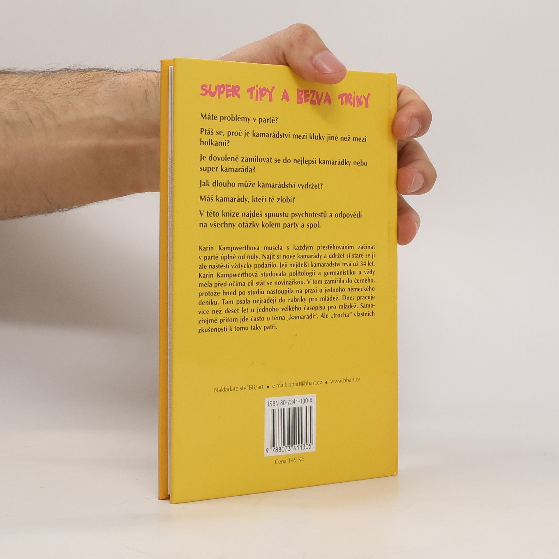 Jak si najít a udržet kamarády Karin Kampwerthová musela s každým přestěhováním začínat v partě úplně od nuly. Najít si nové kamarády a udržet si staré se jí ale naštěstí vždycky podařilo. Její nejdelší kamarádství trvá už 34 let. Karin Kampwerthová studovala politologii a germanistiku a vždy měla před očima cíl stát se novinářkou. V tom zamířila do černého, protože hned po studiu nastoupila na praxi u jednoho německého deníku. Tam psala nejraději do rubriky pro mládež. Dnes pracuje více než deset let u jednoho velkého časopisu pro mládež. Samozřejmě přitom jde často o téma „kamarádi“. Ale „trocha“ vlastních zkušeností k tomu taky patří. NAJÍT SI KAMARÁDY, ALE JAK? Můžou se holky kamarádit s kluky? Jak dlouho může kamarádství vydržet? Kdy je kamarád kamarádem? Tady najdeš odpovědi na tyhle i spoustu dalších otázek. Super tipy a bezva triky
