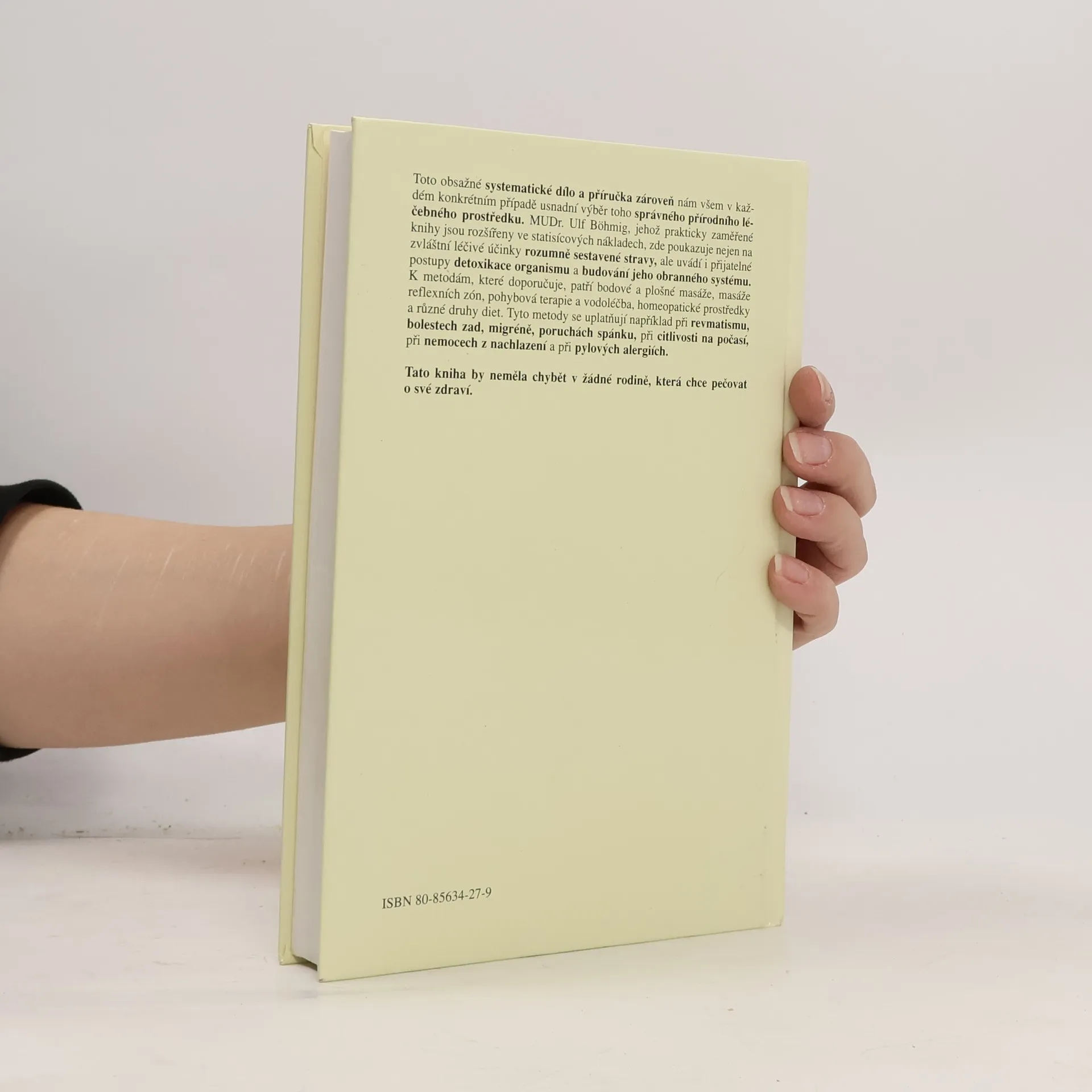 Toto obsažné systematické dílo a příručka zároveň nám všem v každém konkrétním případě usnadní výběr toho správného přírodního léčebného prostředku. MUDr. Ulf Böhmig, jehož prakticky zaměřené knihy jsou rozšířeny ve statisícových nákladech, zde poukazuje nejen na zvláštní léčivé účinky rozumně sestavené stravy, ale uvádí i přijatelné postupy detoxikace organismu a budování jeho obranného systému. K metodám, které doporučuje, patří bodové a plošné masáže, masáže reflexních zón, pohybová terapie a vodoléčba, homeopatické prostředky a různé druhy diet. Tyto metody se uplatňují například při revmatismu, bolestech zad, migréně, poruchách spánku, citlivosti na počasí, při nemocech z nachlazení a při pylových alergiích.... celý text