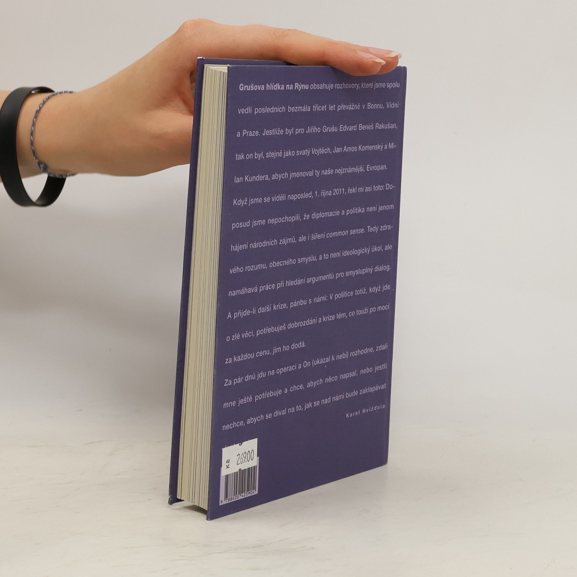 Rozhovory Po nedávném skonu Jiřího Gruši sestavil Karel Hvížďala knihu, kterou uvozuje takto: Grušova hlídka na Rýnu obsahuje rozhovory, které jsme spolu vedli posledních bezmála třicet let převážně v Bonnu, Vídni a Praze. Jestliže byl pro Jiřího Grušu Edvard Beneš Rakušan, tak on byl stejně jako svatý Vojtěch, Jan Amos Komenský a Milan Kundera, abych jmenoval ty naše nejznámější, Evropan. Když jsme se viděli naposled, 1. října 2011, řekl mi asi toto: Doposud jsme nepochopili, že diplomacie a politika není jenom hájení národních zájmů, ale i šíření common sense. Tedy zdravého rozumu, obecného smyslu, a to není ideologický úkol, ale namáhavá práce při hledání argumentů pro smysluplný dialog. A přijde-li další krize, pánbu s námi: V politice totiž, když jde o zlé věci, potřebuješ dobrozdání a krize těm, co touží po moci za každou cenu, jim ho dodá. Za pár dnů jdu na operaci a On (ukázal k nebi) rozhodne, jestli mne ještě potřebuje a chce, abych něco napsal, nebo jestli nechce, abych se díval na to, jak se nad námi bude zaklapávat vlast-past