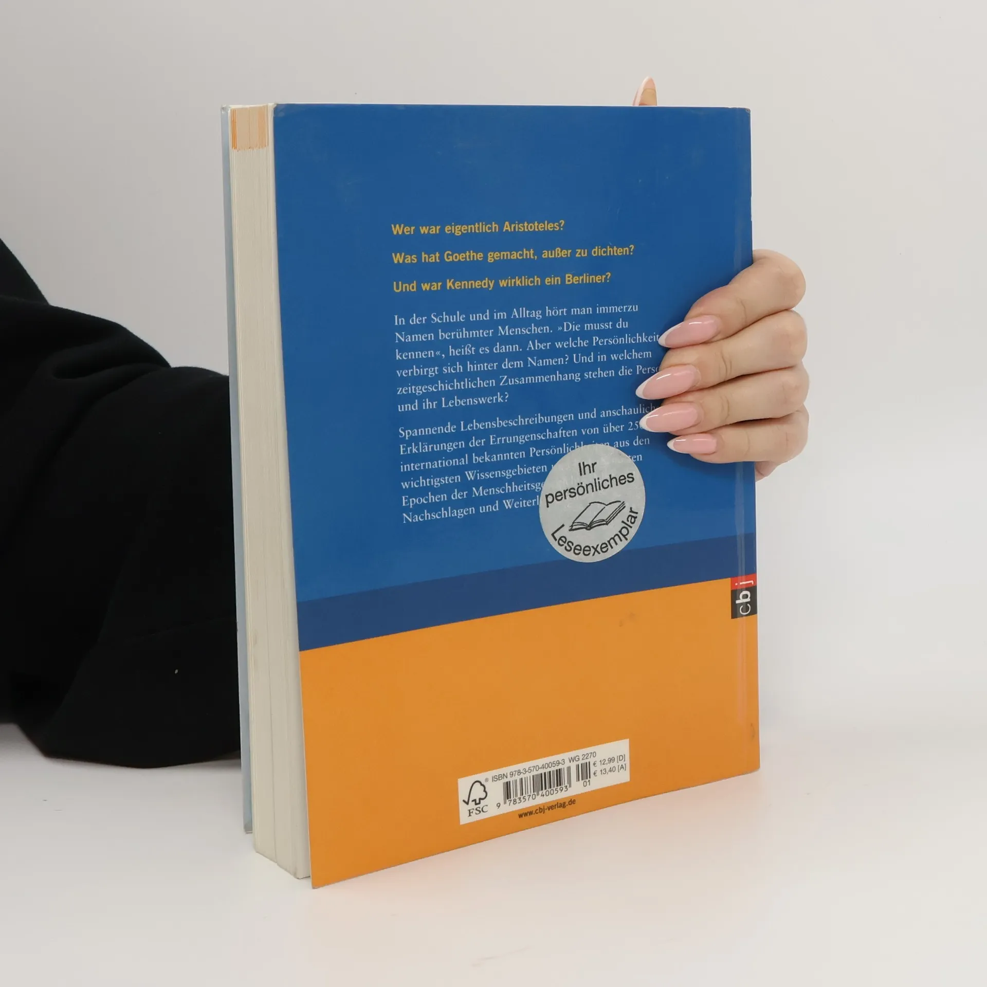 Die wichtigsten Persönlichkeiten der Weltgeschichte in einem Nachschlagewerk versammelt Dieses Nachschlagewerk für Kinder versammelt sie alle: die 250 wichtigsten und populärsten Wissenschaftler, Politiker, Künstler und Denker unserer Kulturgeschichte von der Antike bis in die Gegenwart. Kindgemäß und verständlich aufbereitet, bettet das Lexikon die ausgewählten Persönlichkeiten in ihre Zeit und Gesellschaftsordnung ein und präsentiert sie chronologisch geordnet in sieben großen Epochen. Ein profundes, großzügig und übersichtlich gestaltetes Nachschlagewerk – nicht nur für Schüler! Unter anderem mit folgenden Biografien: Kleopatra, Aristoteles, Karl der Große, Marco Polo, Galileo Galilei, Leonardo da Vinci, William Shakespeare, Immanuel Kant, Johann Wolfgang von Goethe, Karl Marx, Martin Luther King jun., Dalai Lama, Albert Einstein, Thomas Mann, Pablo Picasso, Beatles