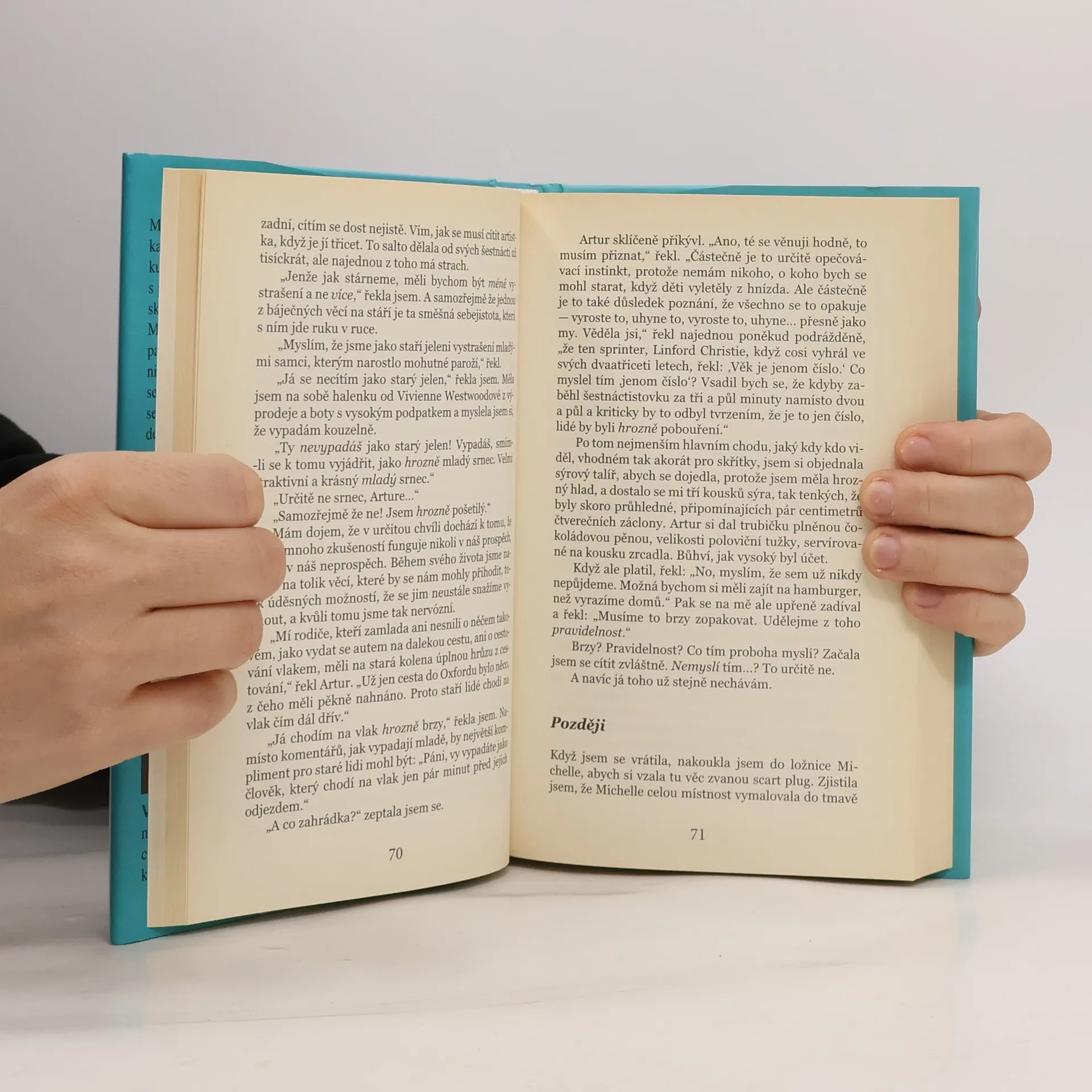 Kašlu na to! odpoví Marie Sharpová, když jí kamarádka navrhne, aby se - se šedesátkou na krku - přihlásila do čtenářského kroužku. Lidé v těchto kroužcích vždycky vypadají, že se musí prokousávat knihami jako Mandolína kapitána Corelliho. Mají pocit, že si neustále musí prošťuchovat mozek něčím špičatým, aby jim nepřestal fungovat. Člověk ale bystrý mozek buď má, nebo nemá. Hrdinka prohlašuje: A já stejně už nechci být mladá! Tyhle staré dámy, které v osmdesáti šlapou na kole napříč Mongolskem a v devadesáti se vrhnou na paragliding, nejsou žádné skvělé exempláře starého věku. Ne, jsou to jen tragické chudinky, které se nedokáží vyrovnat se stárnutím. Já chci začít dělat věci pro staré, nikoli pro mladé. Marie je stále příliš mladá, než aby toužila po domácím výtahu nebo si užívala pohodlí vany pro seniory (ale ne až tak moc, aby si neužívala pohodlné boty), přesto však stárne - a má z toho potěšení! Trochu moc se zaobírá tím, zda zanechat sexu - Ouvej! Ouvej! Jsou zde však kompenzace, jako třeba znovu se až po uši zamilovat- tentokrát ale do malého vnuka.