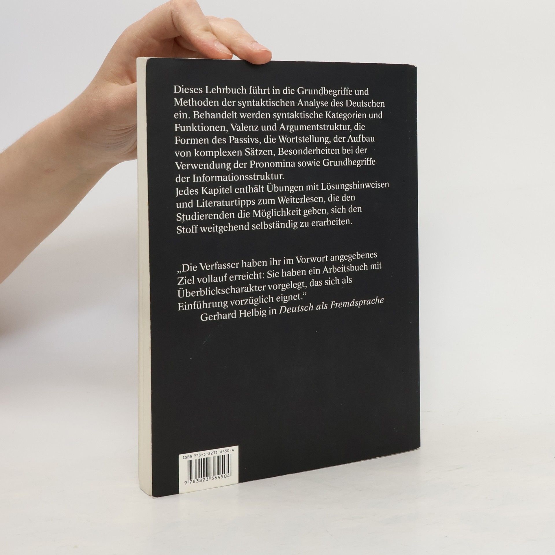 Dieses Lehrbuch führt in die Grundbegriffe und Methoden der syntaktischen Analyse des Deutschen ein. Behandelt werden syntaktische Kategorien und Funktionen, Valenz und Argumentstruktur, die Formen des Passivs, die Wortstellung, der Aufbau von komplexen Sätzen, Besonderheiten bei der Verwendung der Pronomina sowie Grundbegriffe der Informationsstruktur. Jedes Kapitel enthält Übungen mit Lösungshinweisen und Literaturtipps zum Weiterlesen, die den Studierenden die Möglichkeit geben, sich den Stoff weitgehend selbständig zu erarbeiten.