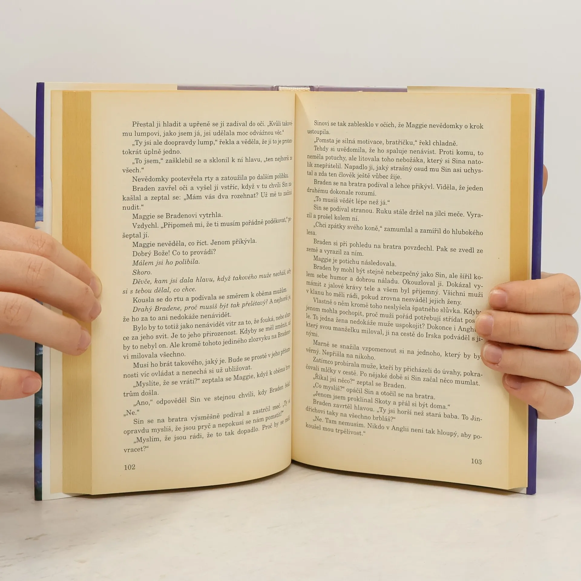 O slavném skotském bojovníkovi Brandonu MacAllisterovi se říká, že umí skolit nepřítele jedinou ranou a svést ženu jediným polibkem. Jeho mužnému kouzlu dokáže odolat jen jediná, Maggie. Půvabná rusovláska se totiž rozhodla ukončit nesmyslnou válku mezi dvěma klany typicky ženským způsobem: dokud muži nepřestanou bojovat, ženy jim nebudou vařit, prát... ani uspokojovat jejich tělesné touhy. Brandon je odhodlán uplatnit veškeré své svůdnické umění, jen aby Maggii zradil od jejího záměru. Dovolí jí poznat objetí svých silných paží, nechá ji ochutnat sladkost svých polibků, ale všechno marně, Maggie se stále drží svého předsevzetí. Ačkoli o Brandonovi odjakživa snila a už pouhá jeho přítomnost ji rozechvívá, je rozhodnuta dosáhnout svého cíle a ukončit krveprolití. Kromě toho ví, že Brandon sice dobyl mnoho ženských srdcí, ale to své žádné nedal. V koutku duše ovšem Maggie spřádá smělé plány: mohlo by se jí podařit uzavřít mír a poté svést nejobletovanějšího muže v celém Skotsku?