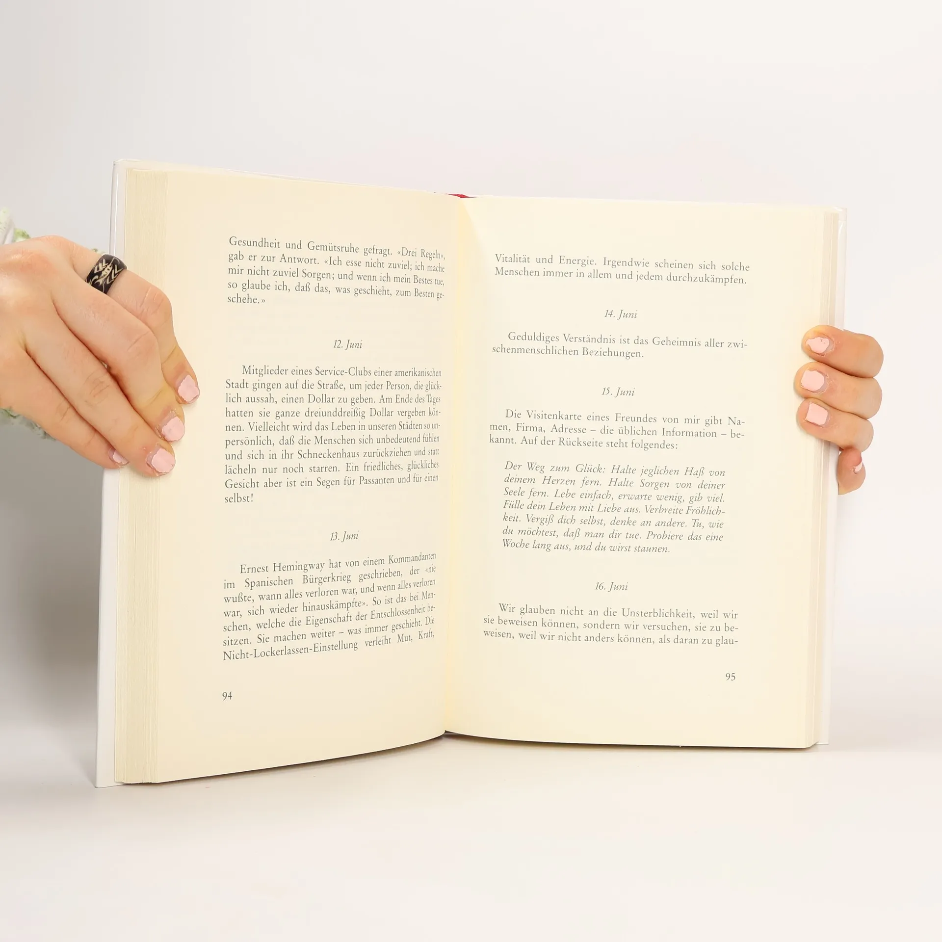 Für uns Menschen gibt es kein grösseres Glück, als mit uns selbst und mit unserer Umwelt in Frieden zu leben, unerschrocken und frei von Angst. Jeder kann seines eigenen Glückes Schmied werden – höchstens fünf Minuten kostet Sie dieses Buch täglich, ein ganzes Jahr lang. Fünf Minuten, die sich lohnen.Peale legt in diesem Buch 366 ermunternde und positive Gedanken vor – einer für jeden Tag des Jahres –, die helfen sollen, jeden Tag zu einem guten Tag zu machen.