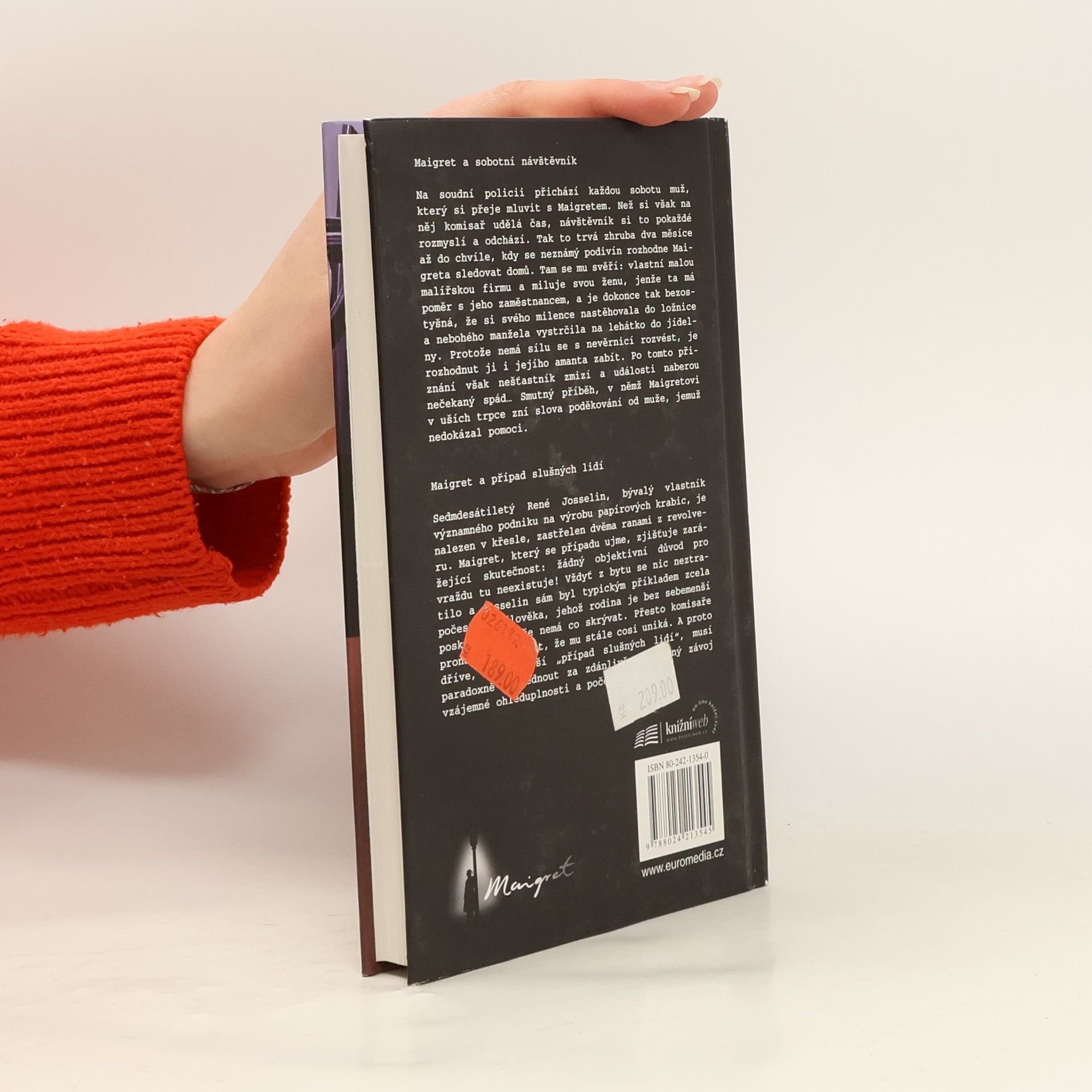 Maigret a sobotní návštěvník – Na soudní policii přichází každou sobotu muž, který si přeje mluvit s Maigretem. Než si však na něj komisař udělá čas, návštěvník si to pokaždé rozmyslí a odchází. Tak to trvá zhruba dva měsíce až do chvíle, kdy se neznámý podivín rozhodne Maigreta sledovat domů. Tam se mu svěří: vlastní malou malířskou firmu a miluje svou ženu, jenže ta má poměr s jeho zaměstnancem, a je dokonce tak bezostyšná, že si svého milence nastěhovala do ložnice a nebohého manžela vystrčila na lehátko do jídelny. Protože nemá sílu se s nevěrnicí rozvést, je rozhodnut ji i jejího amanta zabít. Po tomto přiznání však nešťastník zmizí a události naberou nečekaný spád… Smutný příběh, v němž Maigretovi v uších trpce zní slova poděkování od muže, jemuž nedokázal pomoci. Maigret a případ slušných lidí – Sedmdesátiletý René Josselin, bývalý vlastník významného podniku na výrobu papírových krabic, je nalezen v křesle, zastřelen dvěma ranami z revolveru. Maigret, který se případu ujme, zjišťuje zarážející skutečnost: žádný objektivní důvod pro vraždu tu neexistuje! Vždyť z bytu se nic neztratilo a Josselin sám byl typickým příkladem zcela počestného člověka, jehož rodina je bez sebemenší poskvrnky, takže nemá co skrývat. Přesto komisaře pronásleduje pocit, že mu stále cosi uniká. A proto dříve, než vyřeší „případ slušných lidí“, musí paradoxně nahlédnout za zdánlivě průzračný závoj vzájemné ohleduplnosti a počestnosti.