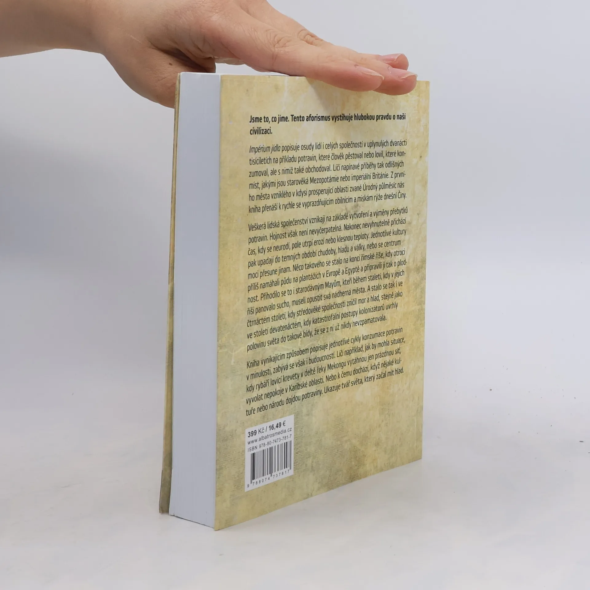 Jsme to, co jíme. Tento aforismus odhaluje hlubokou pravdu o naší civilizaci, která hrála klíčovou roli v dějinách lidstva. Kniha, založená na barvitých úryvcích deníku šestnáctého století, živě popisuje osudy lidí a společností za posledních dvanáct tisíc let prostřednictvím potravin, které pěstovali, lovili, obchodovali a konzumovali. Publikace nabízí fascinující, ale pesimistický pohled na budoucnost. Autoři energicky líčí příběhy z různých míst, od starověké Mezopotámie po imperiální Británii. Čtenář je přenášen z kdysi prosperujícího Úrodného půlměsíce k moderním čínským obilnicím, ukazujíc, jak potraviny formovaly města, kulturu, umění a vlády. Vyspělé civilizace vznikaly díky výměně potravin, avšak nevyhnutelně přichází časy krize, kdy se úroda nedaří, což vede k úpadku kultur do chudoby a války. Dnes je náš přístup k potravinám ohrožen, i v době vysoké zemědělské produktivity. Kniha zkoumá cykly konzumace potravin a naznačuje, jak by mohly ekologické krize vyvolat nepokoje. Autoři ukazují důsledky nedostatku potravin a přinášejí analýzu dnešního světa, což je v době globálního oteplování a potravinových krizí zvlášť důležité.