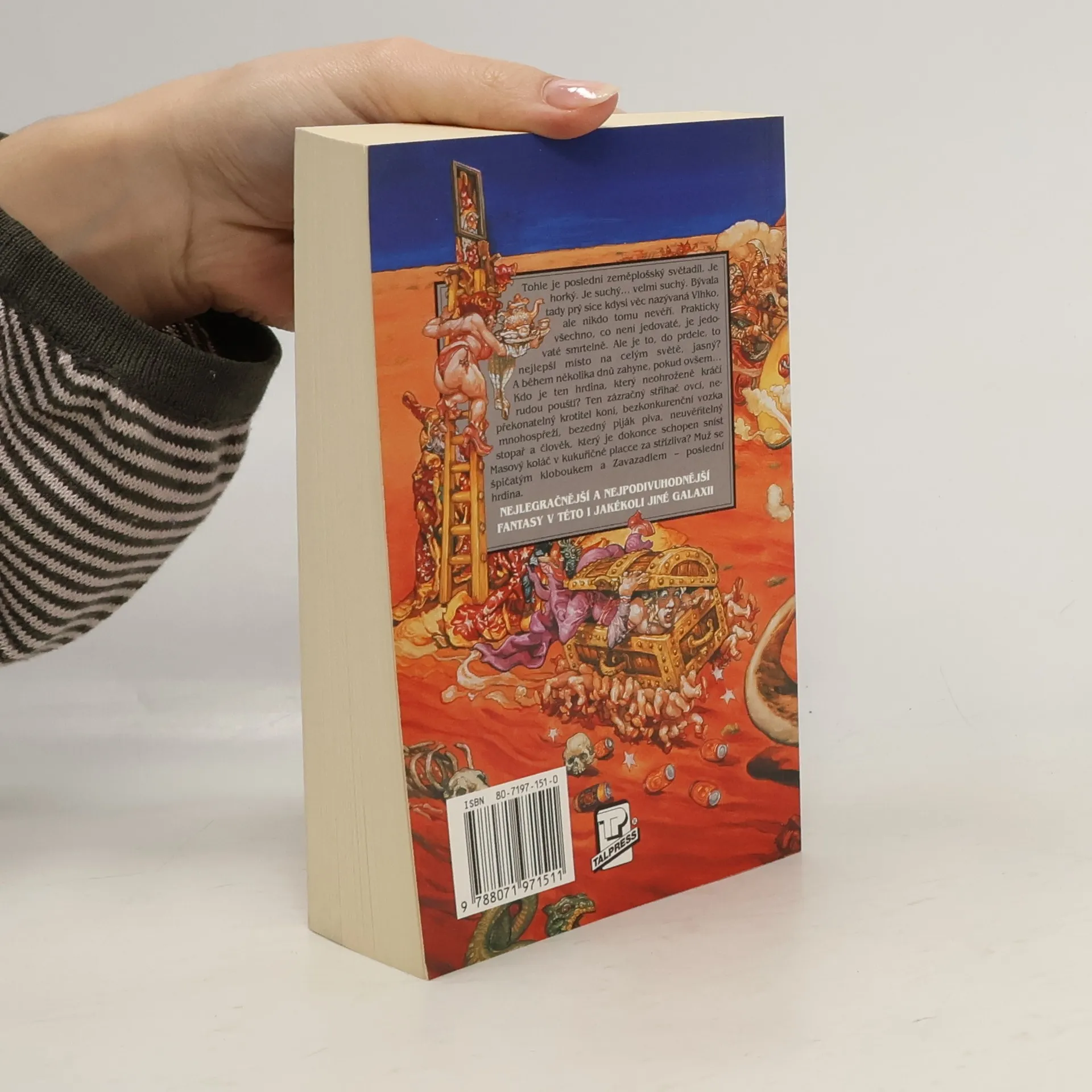 Tohle je poslední zeměplošský světadíl. Je horký. Je suchý… velmi suchý. Bývala tady prý sice kdysi věc nazývaná Vlhko, ale nikdo tomu nevěří. Prakticky všechno, co není jedovaté, je jedovaté smrtelně. Ale je to, do prdele, to nejlepší místo na celým světě, jasný? A během několika dnů zahyne, pokud ovšem… Kdo je ten hrdina, který neohroženě kráčí rudou pouští? Ten zázračný střihač ovcí, nepřekonatelný krotitel koní, bezkonkurenční vozka mnohospřeží, bezedný piják piva, neuvěřitelný stopař a člověk, který je dokonce schopen sníst Masový koláč v kukuřičné placce za střízliva? Muž se špičatým kloboukem a Zavazadlem – poslední hrdina. Úžasná Zeměplocha, kniha 22., přeložil Jan Kantůrek.