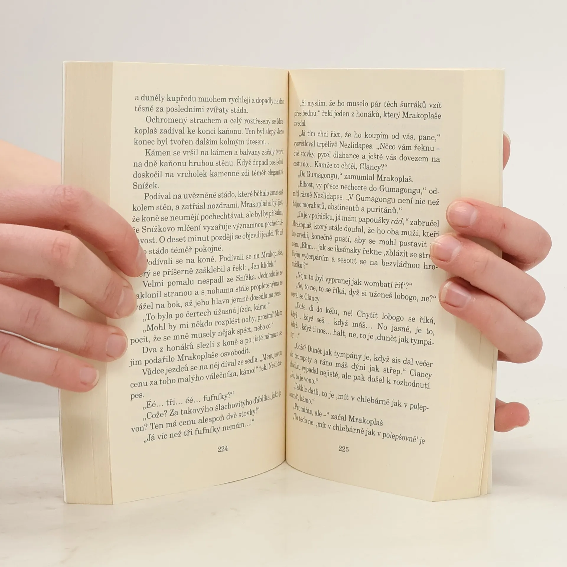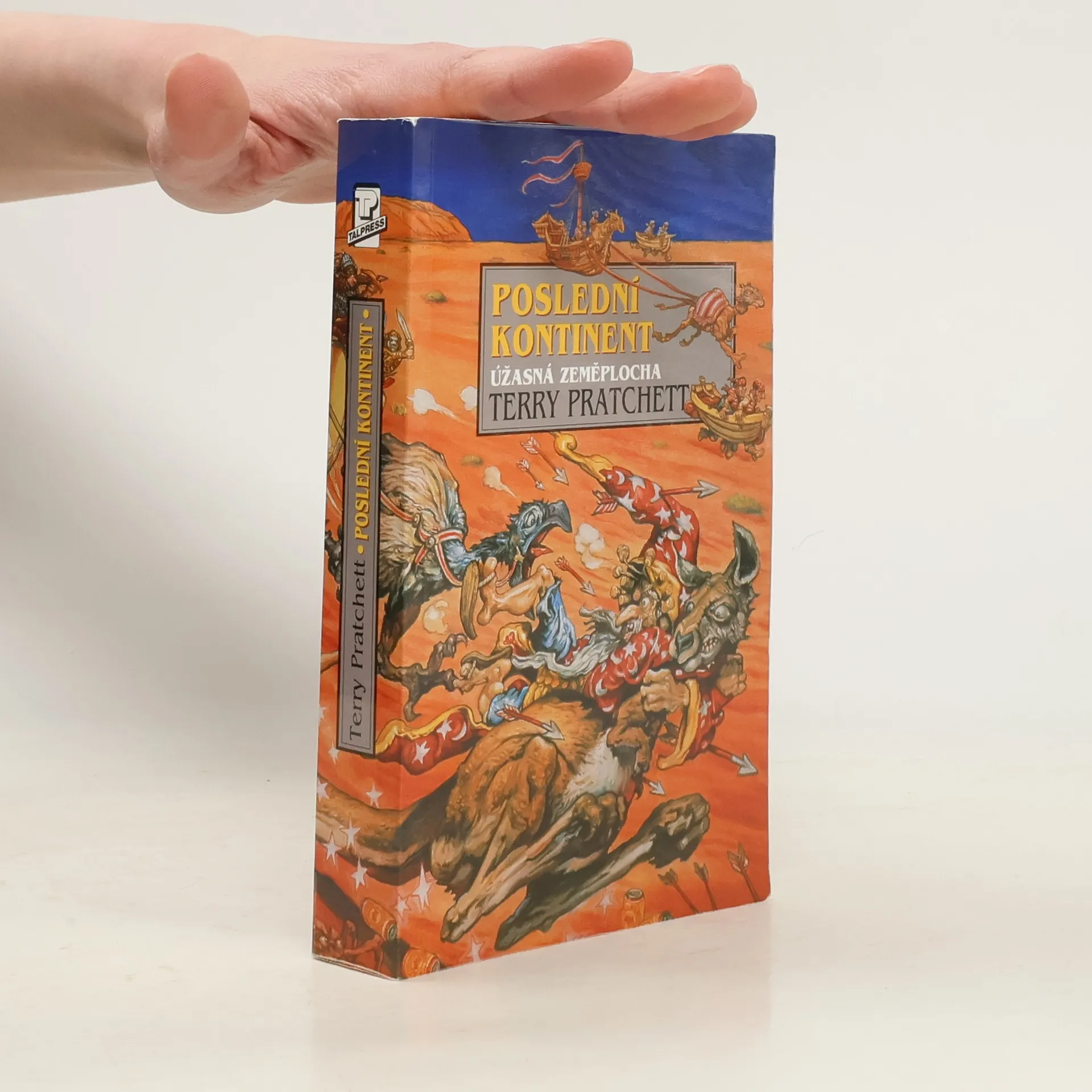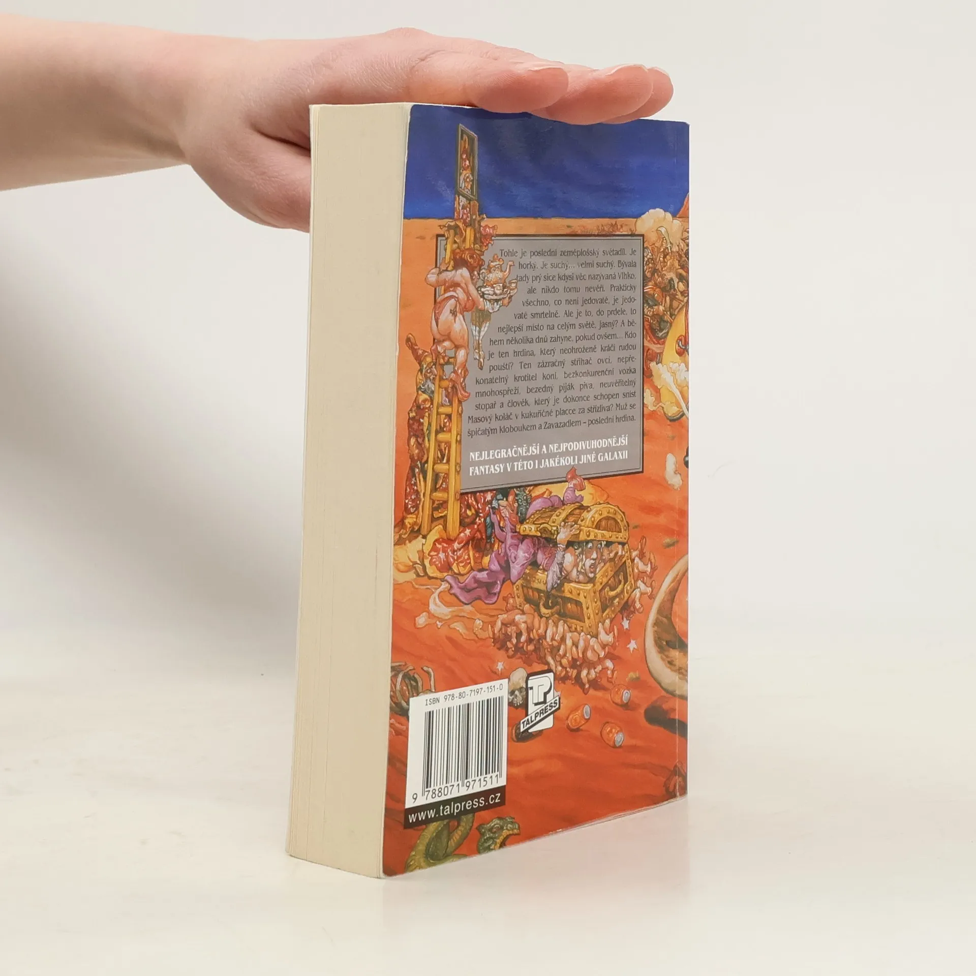 Tohle je poslední zeměplošský světadíl. Je horký. Je suchý… velmi suchý. Bývala tady prý sice kdysi věc nazývaná Vlhko, ale nikdo tomu nevěří. Prakticky všechno, co není jedovaté, je jedovaté smrtelně. Ale je to, do prdele, to nejlepší místo na celým světě, jasný? A během několika dnů zahyne, pokud ovšem… Kdo je ten hrdina, který neohroženě kráčí rudou pouští? Ten zázračný střihač ovcí, nepřekonatelný krotitel koní, bezkonkurenční vozka mnohospřeží, bezedný piják piva, neuvěřitelný stopař a člověk, který je dokonce schopen sníst Masový koláč v kukuřičné placce za střízliva? Muž se špičatým kloboukem a Zavazadlem – poslední hrdina. Úžasná Zeměplocha, kniha 22., přeložil Jan Kantůrek.