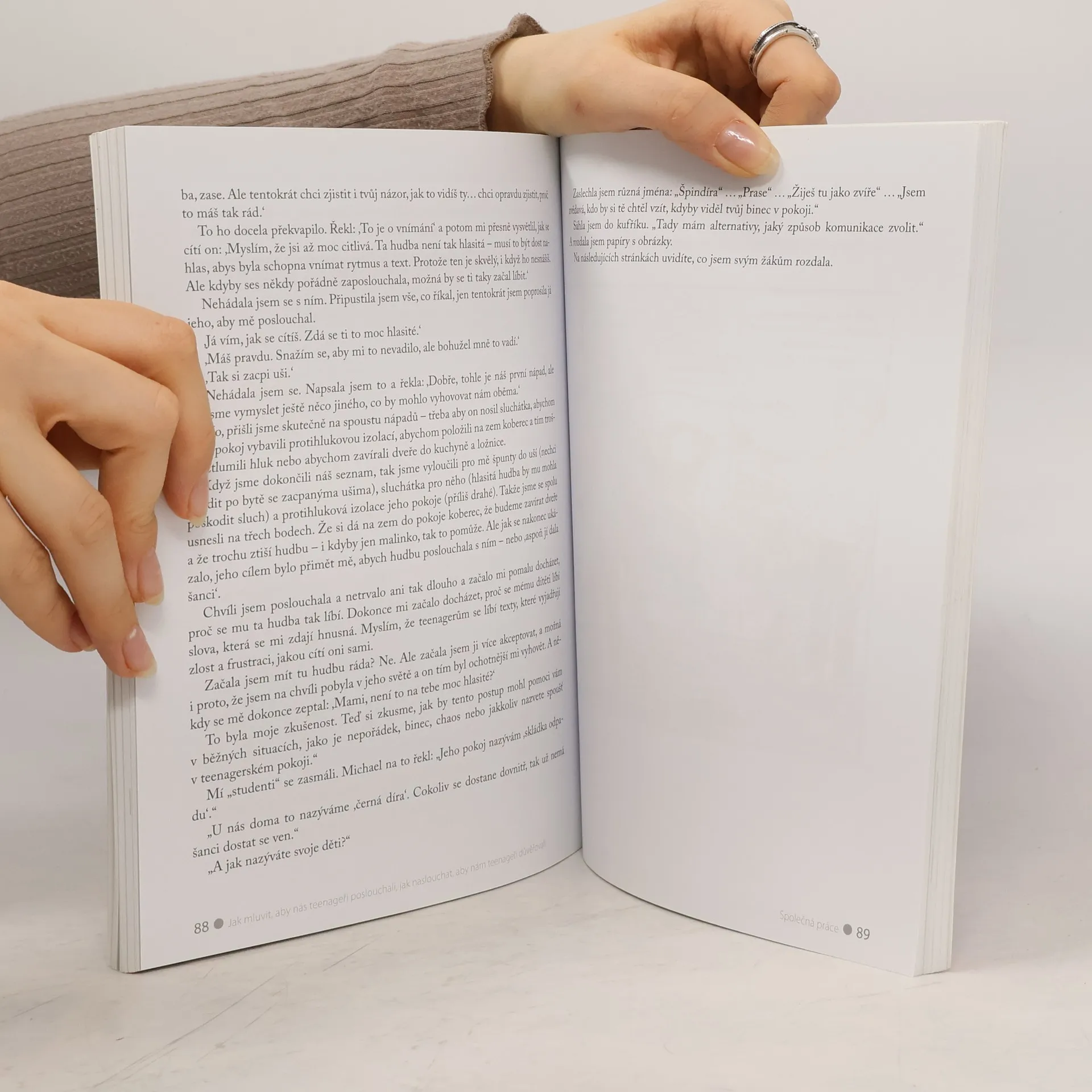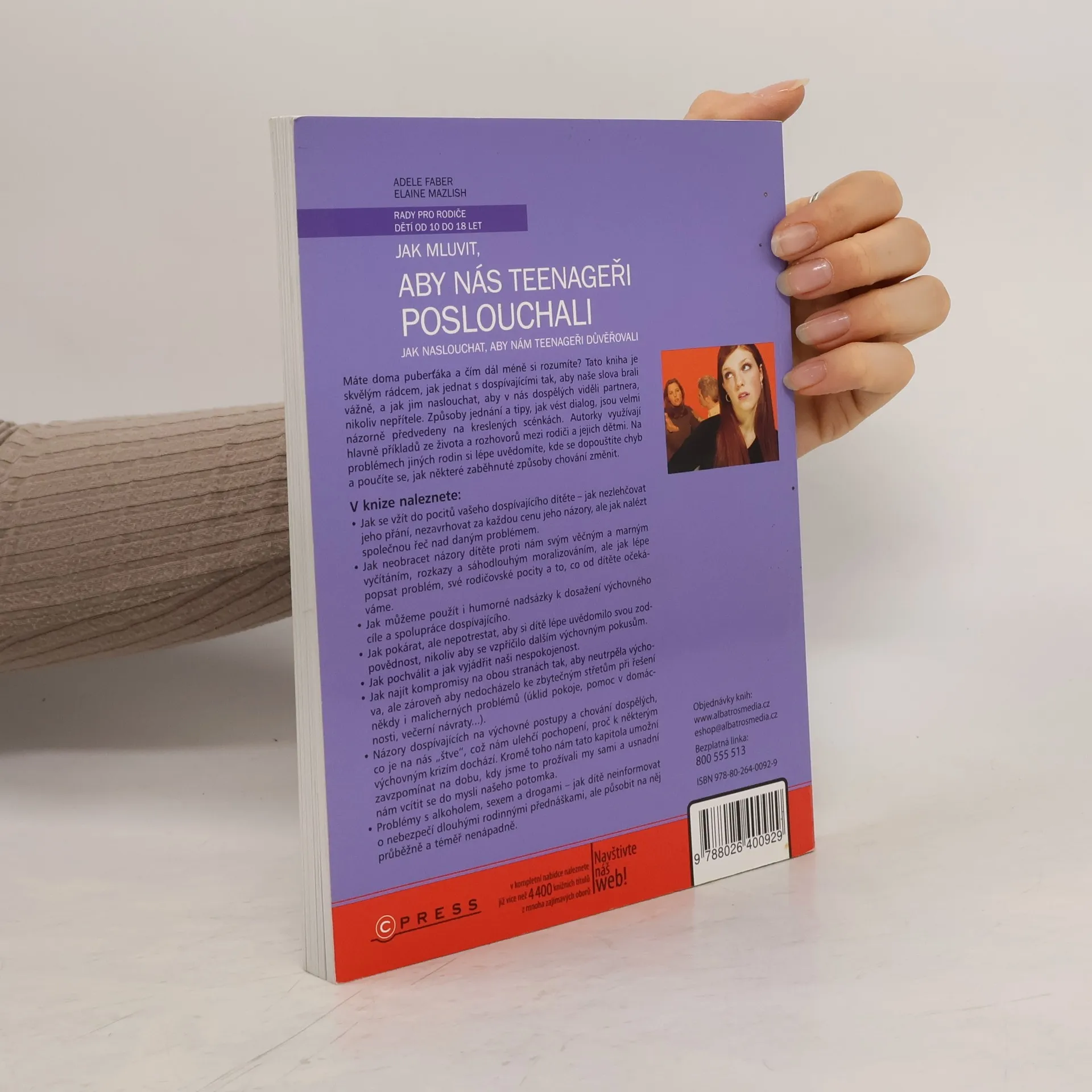 Máte doma puberťáka a čím dál méně si rozumíte? Tato kniha nabízí praktické rady, jak jednat s dospívajícími, aby vás brali vážně, a jak jim naslouchat jako partnerům, nikoli jako nepřátelům. Způsoby jednání a tipy na dialog jsou ilustrovány kreslenými scénkami, přičemž autorky čerpají z reálných rozhovorů mezi rodiči a dětmi. Na příkladech jiných rodin si uvědomíte, kde děláte chyby, a naučíte se měnit zaběhnuté vzorce chování. Kniha se zaměřuje na to, jak se vcítit do pocitů dospívajícího, nezlehčovat jeho přání a nalézt společnou řeč. Dále se dozvíte, jak neobracet názory dítěte proti sobě a lépe popsat své pocity a očekávání. Autorky také ukazují, jak využít humor pro spolupráci s teenagerem a jak pokárat bez trestání, aby dítě lépe chápalo svou zodpovědnost. Zjistíte, jak chválit a vyjadřovat nespokojenost, a jak najít kompromisy, aby nedocházelo ke zbytečným konfliktům. Kniha také přináší názory dospívajících na výchovné metody a problémy s alkoholem, sexem a drogami, přičemž doporučuje nenásilné a průběžné informování o nebezpečích.