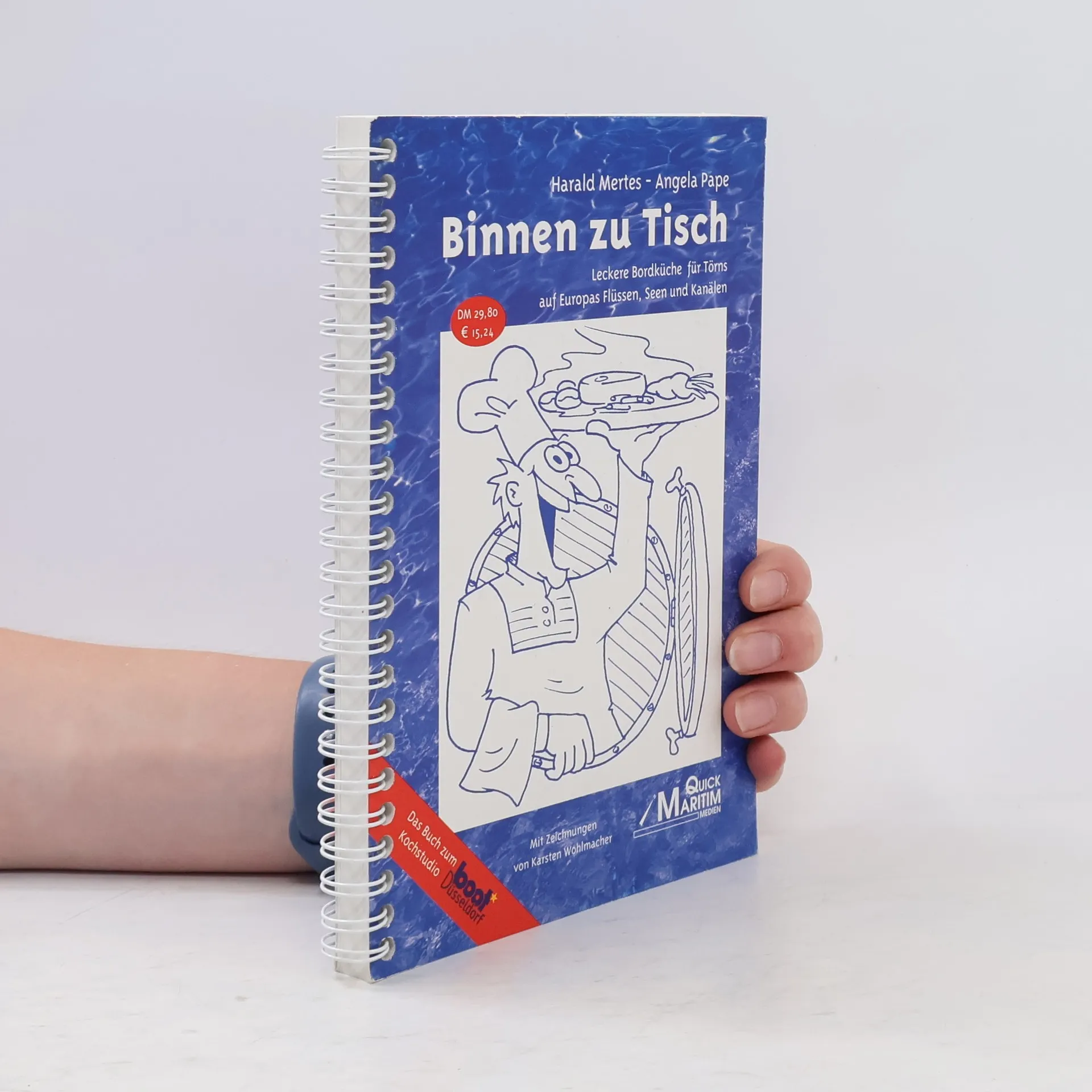 Kochen unter Bordbedingungen: „Keine leichte Sache, aber auch kein unlösbares Problem.“ Das meint jedenfalls Harald Mertes, der in „Binnen zu Tisch“, dem neuen Kochbuch von Quick Maritim Medien viele Tricks und Rezepte aus seiner großen Küchenkiste verrät. „Nur eine Crew, die satt und glücklich ist, kann die besonderen Anforderungen des Bordalltags bestehen“, meint der erfahrene Journalist, Hobbykoch und Skipper. Wie man dieses Ziel im wahrsten Sinne des Wortes mit Bordmitteln erreicht, schildern Mertes und seine Mitautorin Angela Pape auf 140 Seiten wasseresistenten Papiers. Nach den Einkaufsmöglichkeiten der Reviere Frankreich, Holland, Irland und Deutschland geordnet findet man 100 Rezepte, die ohne aufwändige Einkäufe oder stundenlange Vorbereitungen in einer Hausbootküche zu verwirklichen sind. Illustriert sind die Rezepte mit Zeichnungen aus der liebevollen aber spitzen Feder von Karsten Wohlmacher. Übrigens: Binnen zu Tisch ist das offizielle Buch zum Kochstudio der boot Düsseldorf. Dreisprachiger Einkaufsdolmetscher
