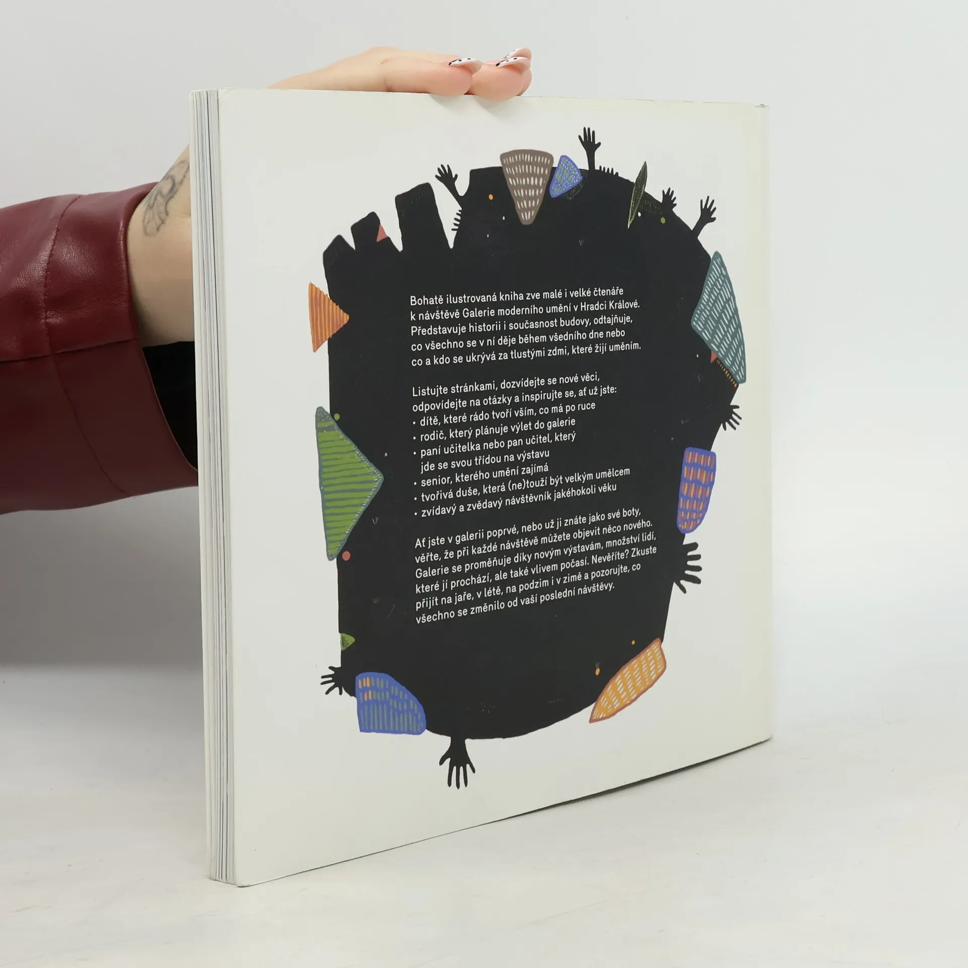 Jak to chodí v galerii, jaký je její každodenní provoz a jak je třeba se o umění starat? Jak se na umění dívat a najít si k němu cestu? Publikace s bohatými ilustracemi Marie Juklíkové přináší v šesti kapitolách seznámení s Galerií moderního umění v Hradci Králové. Kniha je určena především dětem od dvanácti let, ale nové informace, vědomosti a poznatky z ní načerpá i dospělý člověk. Může take fungovat jako cenný materiál pro studenty nebo pedagogy výtvarných oborů. Dozvíte se, jaký je každodenní život galerie a seznámíte se s profesemi, které byste v takovém prostředí možná nečekali. Poznáte galerii jako místo pro společný dialog, kladení otázek, poznávání a seznamování se s (č)uměním na umění, které je pro všechny.