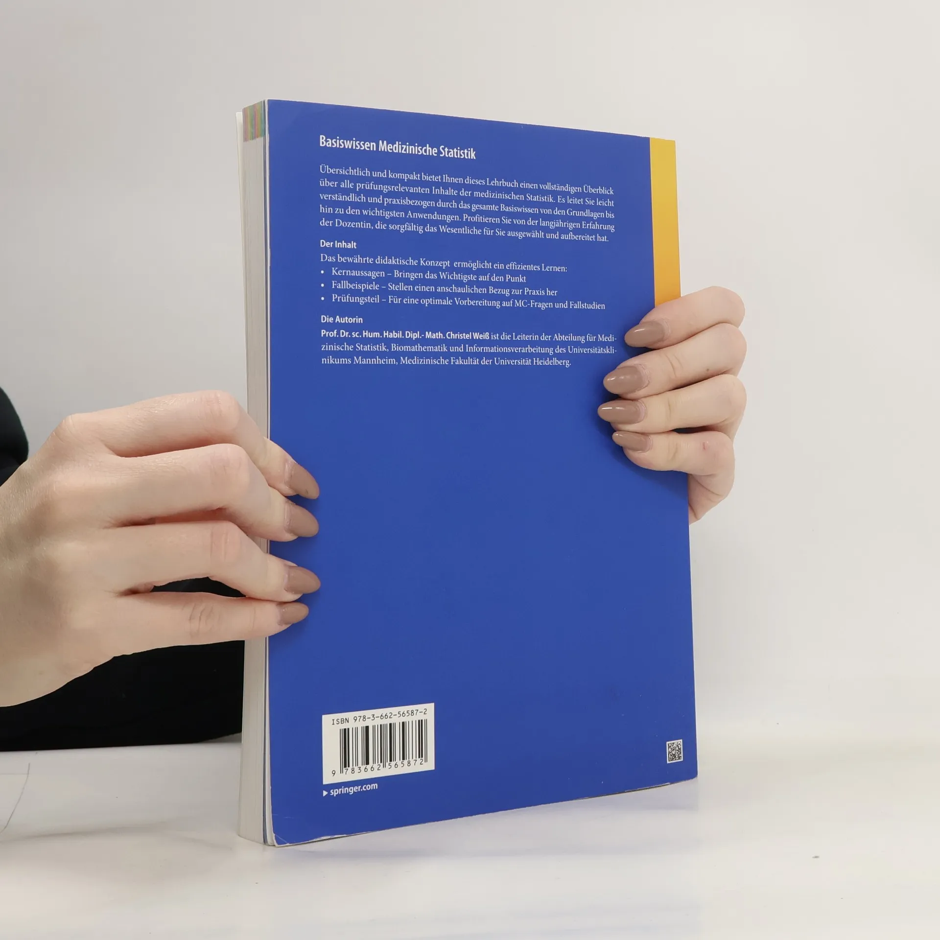 Übersichtlich und kompakt bietet Ihnen dieses Lehrbuch einen vollständigen Überblick über alle prüfungsrelevanten Inhalte der medizinischen Statistik. Es leitet Sie leicht verständlich und praxisbezogen durch das gesamte Basiswissen von den Grundlagen bis hin zu den wichtigsten Anwendungen. Profitieren Sie von der langjährigen Erfahrung der Dozentin, die sorgfältig das Wesentliche für Sie ausgewählt und aufbereitet hat. Der Inhalt Das bewährte didaktische Konzept ermöglicht ein effizientes Lernen: Kernaussagen – Bringen das Wichtigste auf den Punkt Fallbeispiele – Stellen einen anschaulichen Bezug zur Praxis her Prüfungsteil – Für eine optimale Vorbereitung auf MC-Fragen und mündliche Prüfungen Die Autorin Prof. Dr. sc. Hum. Habil. Dipl.- Math. Christel Weiß ist die Leiterin der Abteilung für Medizinische Statistik, Biomathematik und Informationsverarbeitung des Universitätsklinikums Mannheim, Medizinische Fakultät der Universität Heidelberg.