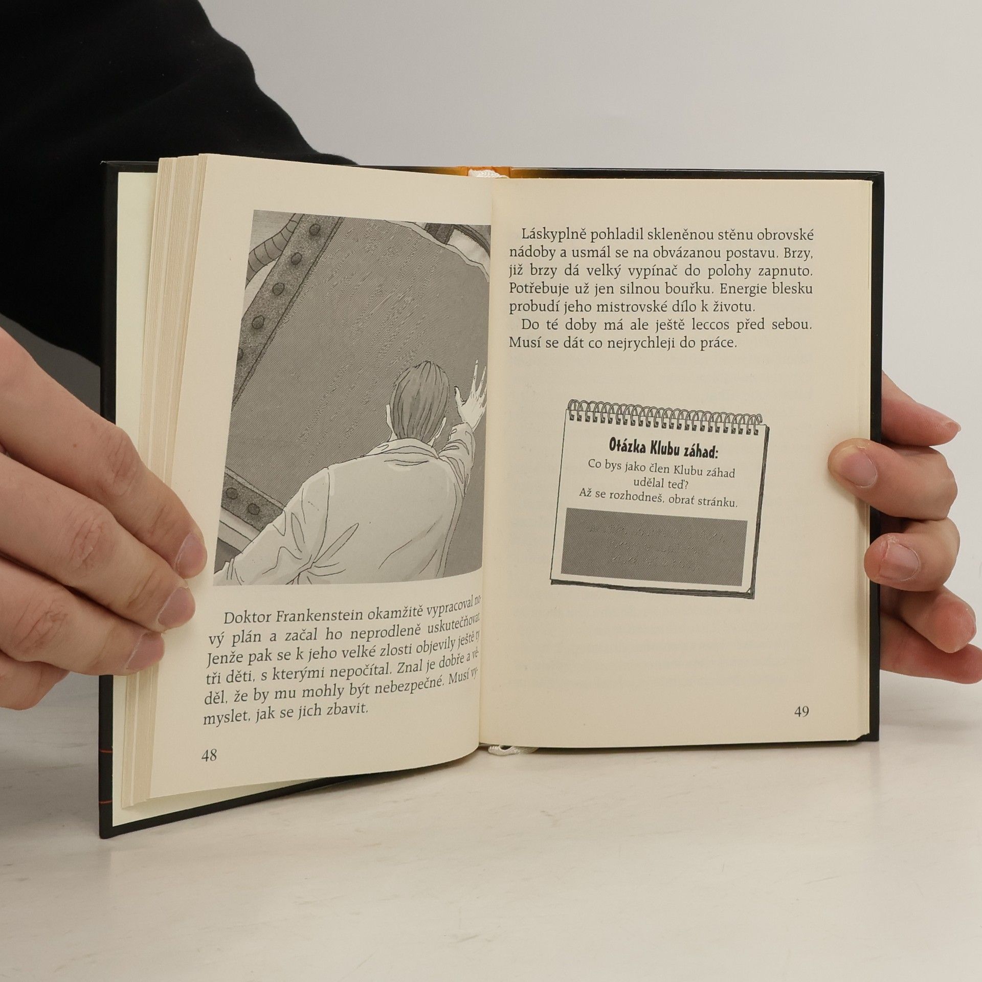 Po škole se šíří neuvěřitelná fáma: Jupiterův nový učitel se prý v noci potlouká po hřbitovech, kde krade části mrtvých těl a potají z nich sestavuje příšery - stejně jako nechvalně proslulý dr. Frankenstein. Je něco takového opravdu možné? Setkal se snad Klub záhad s Frankensteinovým potomkem? Klub záhad zahajuje pátrání. A ty jsi při tom!