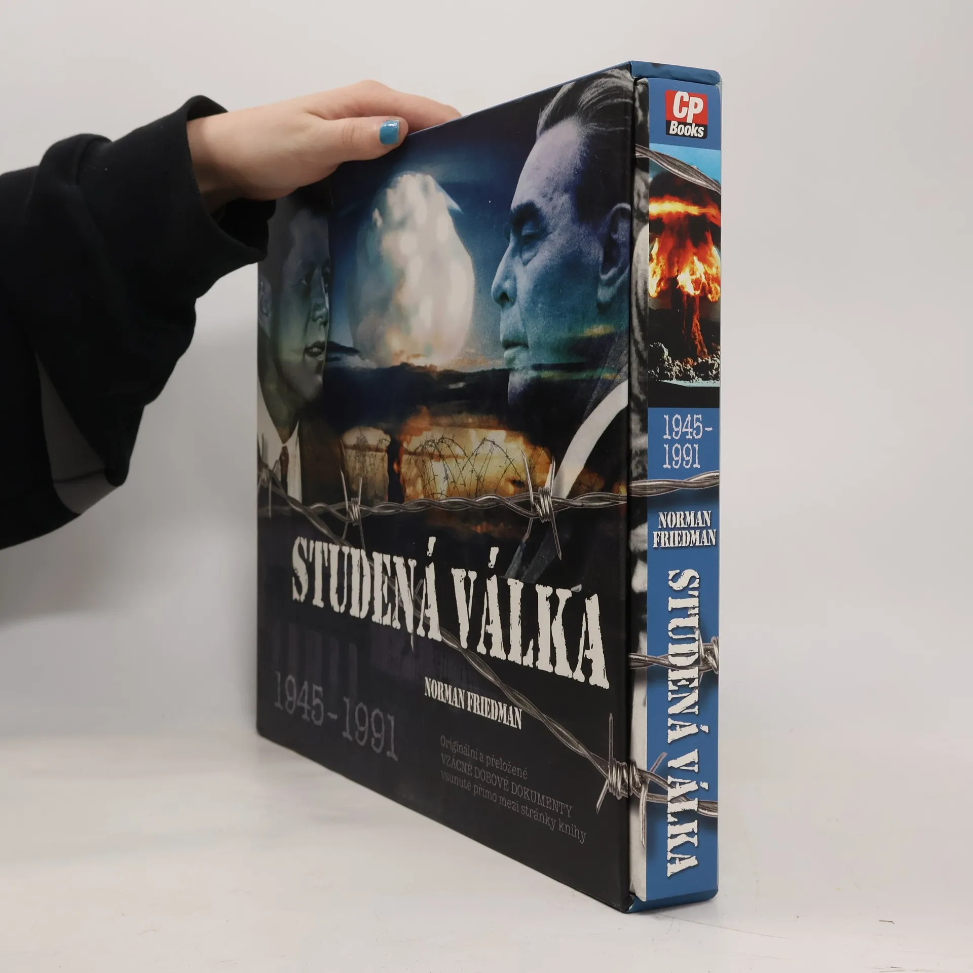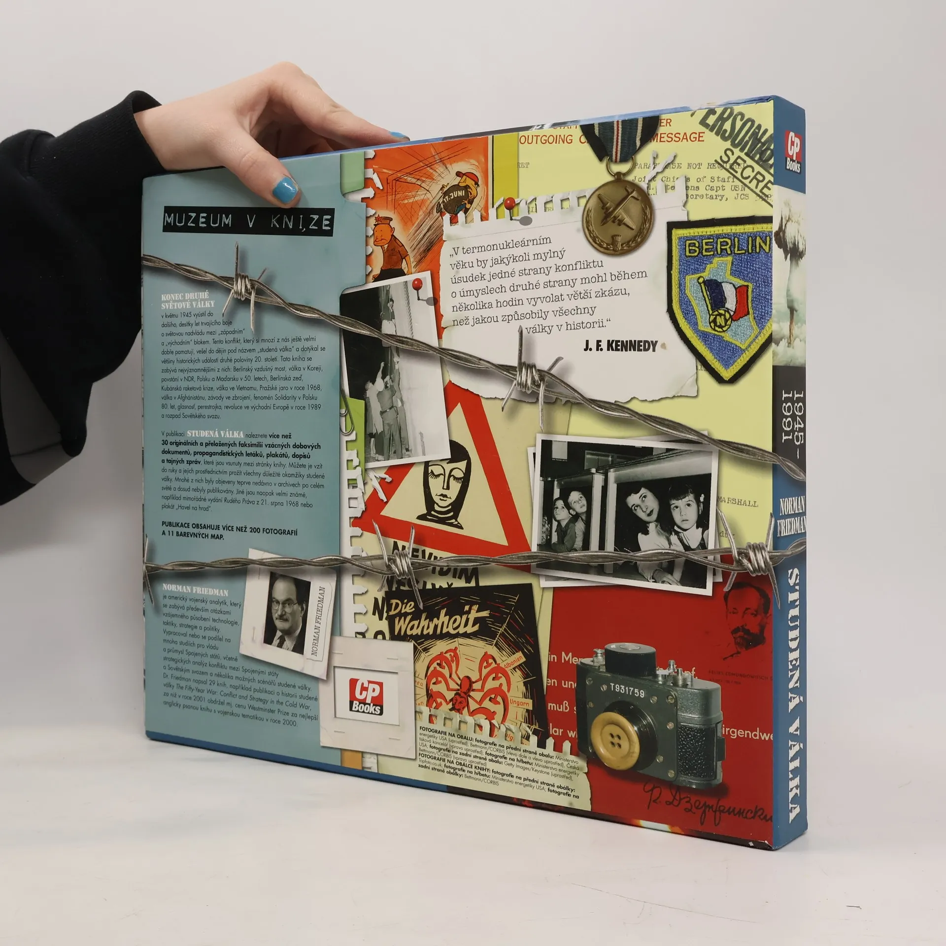 Historie pokračuje. Konflikt Východ vs. Západ v dobových dokumentech. Po úspěchu bestselleru Západní fronta přicházíme s novým titulem Studená válka opět jako "muzeum v knize". Tato unikátní a zcela ojedinělá publikace zachycuje výpravnou formou období od konce 2. světové války až do roku 1991. Konec druhé světové války v květnu 1945 vyústil do dalšího, desítky let trvajícího boje o světovou nadvládu mezi „západním“ a „východním“ blokem. Tento konflikt, který si mnozí z nás ještě velmi dobře pamatují, vešel do dějin pod názvem „studená válka“ a dotýkal se většiny historických událostí druhé poloviny 20. století. Tato kniha se zabývá nejvýznamnějšími z nich: Berlínský vzdušný most, válka v Koreji, povstání v NDR, Polsku a Maďarsku v 50. letech, Berlínská zeď, Kubánská raketová krize, válka ve Vietnamu, Pražské jaro v roce 1968, válka v Afghánistánu, závody ve zbrojení, fenomén Solidarity v Polsku 80. let, glasnosť, perestrojka, revoluce ve východní Evropě v roce 1989 a rozpad Sovětského svazu. V kartonovém pouzdru. Na volných přílohách jsou faksimile originálních dobových dokumentů ve vlepených papírových obálkách