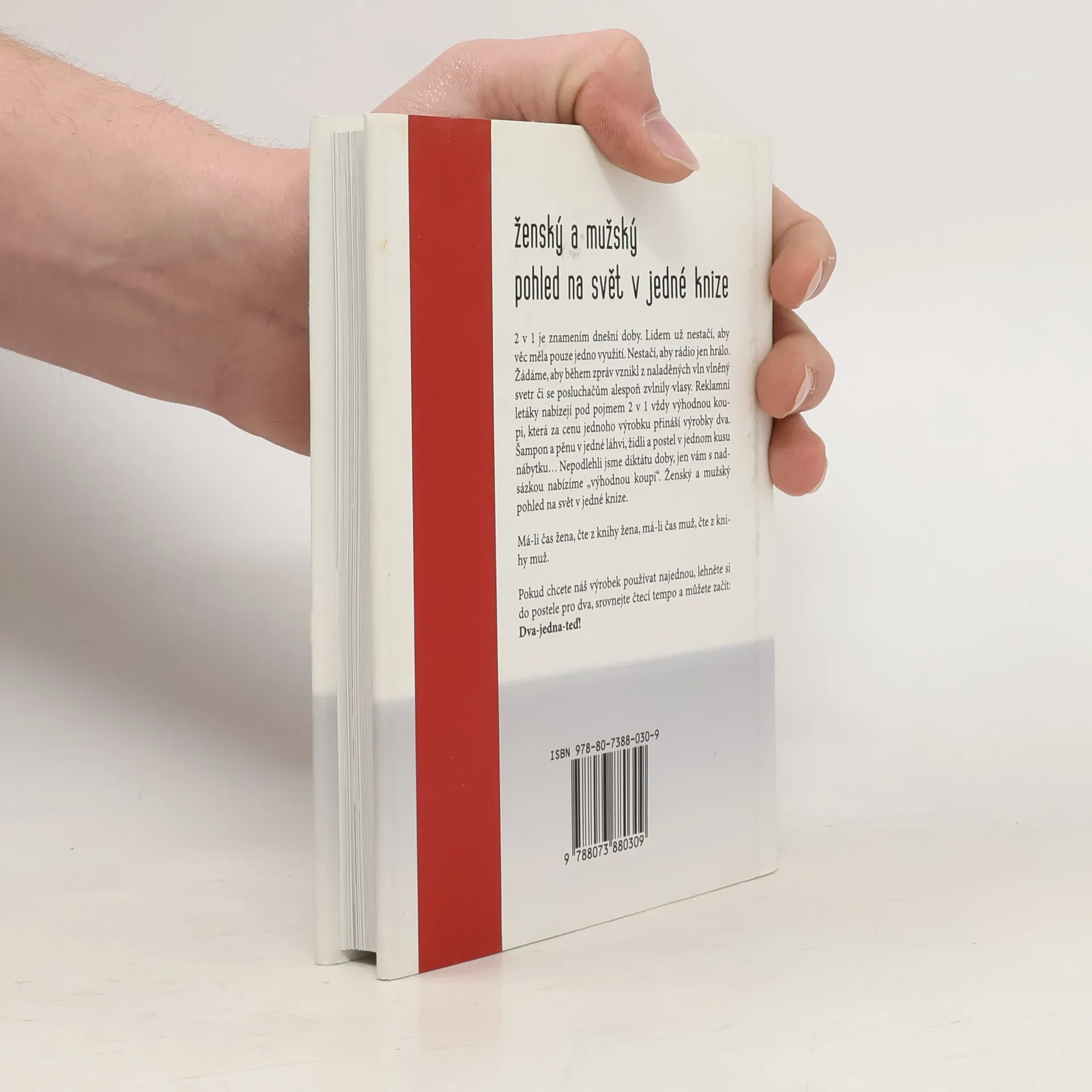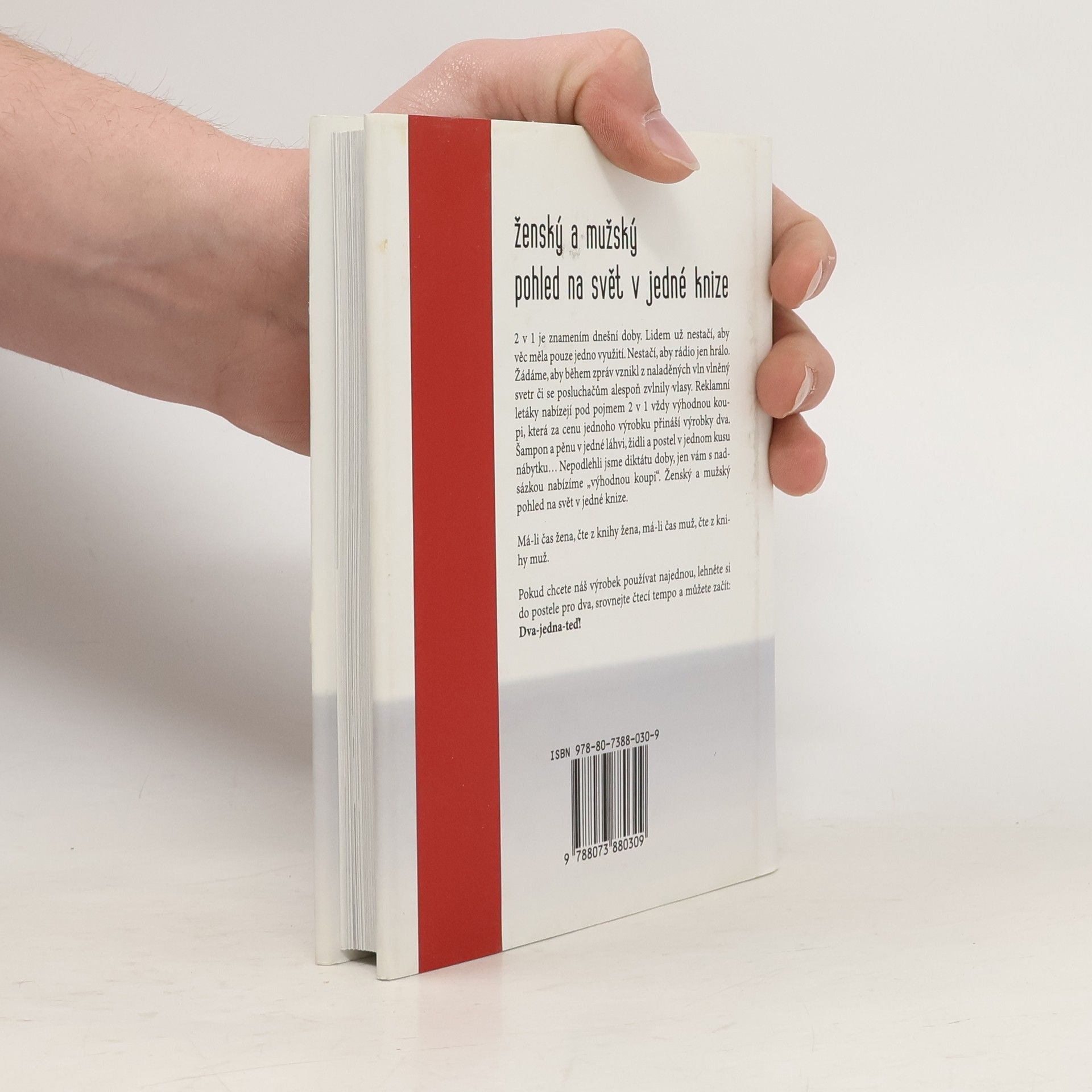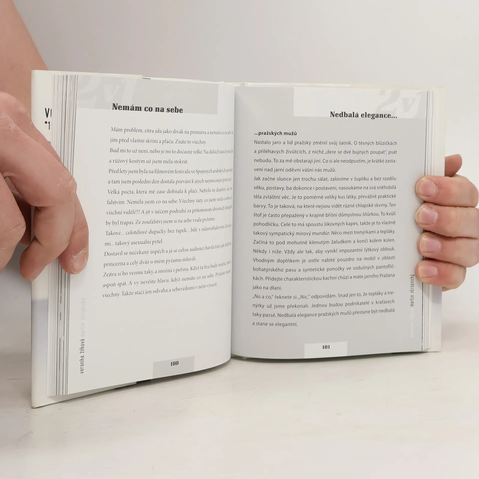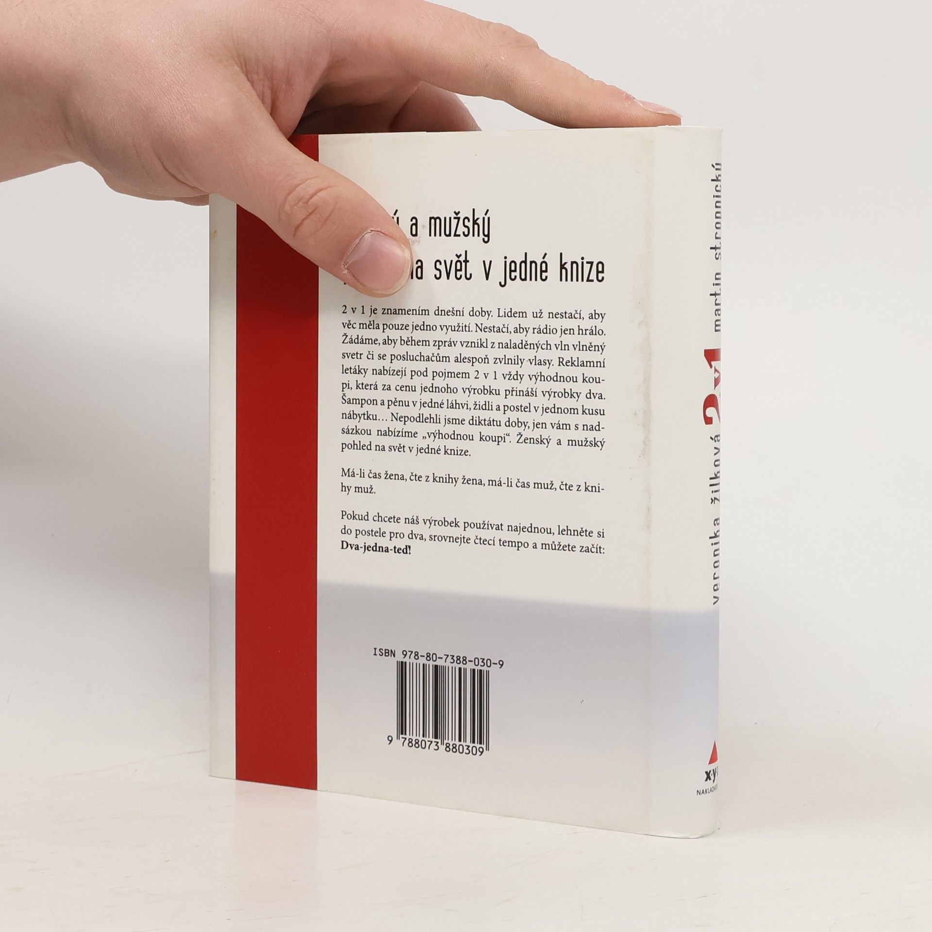 Soubor sloupků Veroniky Žilkové a Martina Stropnického. „2 v 1“ je znamením dnešní doby. Lidem už nestačí, aby věc měla jen jedno využití. Reklamy nabízejí pod pojmem 2 v 1 vždy výhodnou koupi, která za cenu jednoho výrobku přináší výrobky dva. Nepodlehli jsme diktátu doby, jen s nadsázkou nabízíme „výhodnou koupi“ – ženský a mužský pohled na svět v jedné knize.