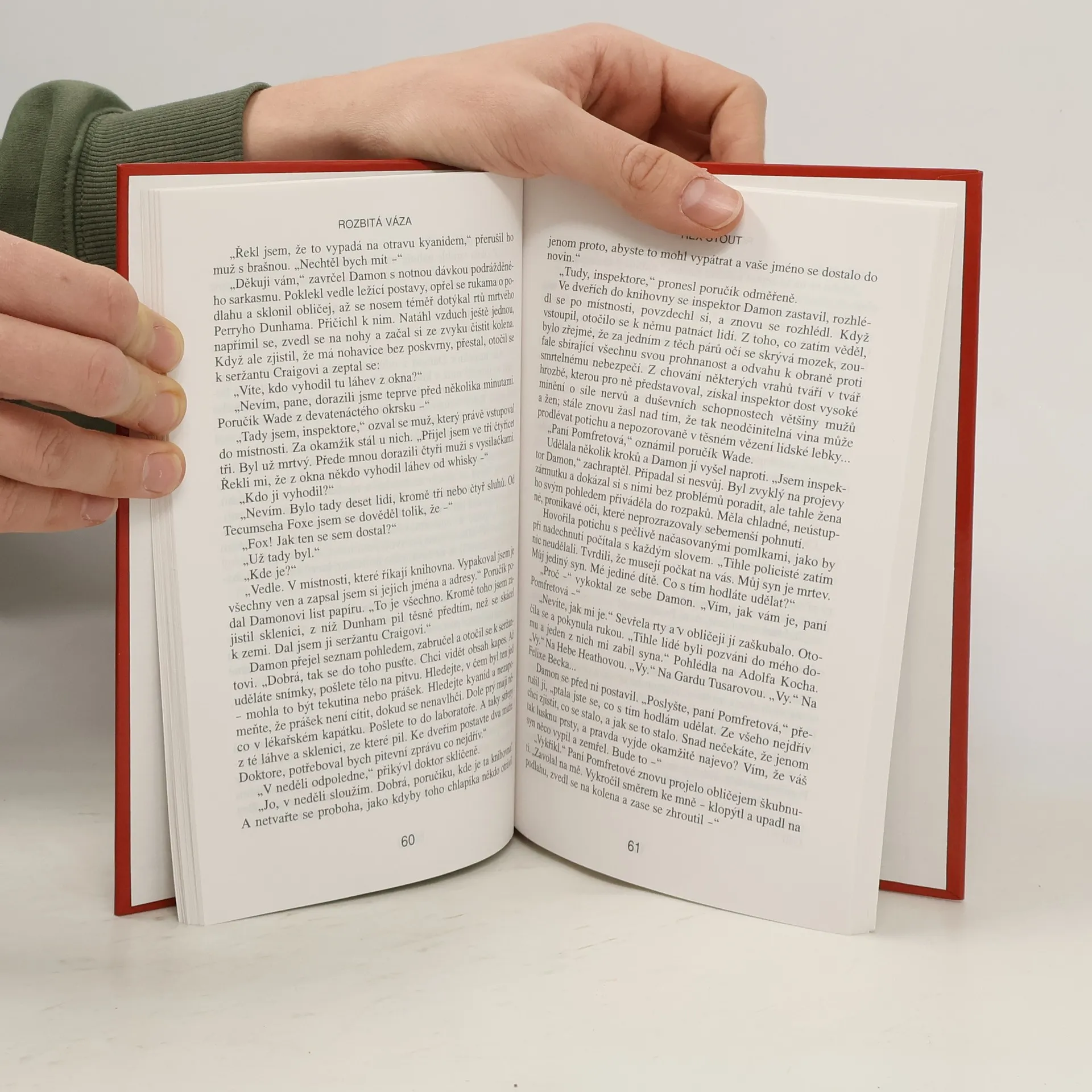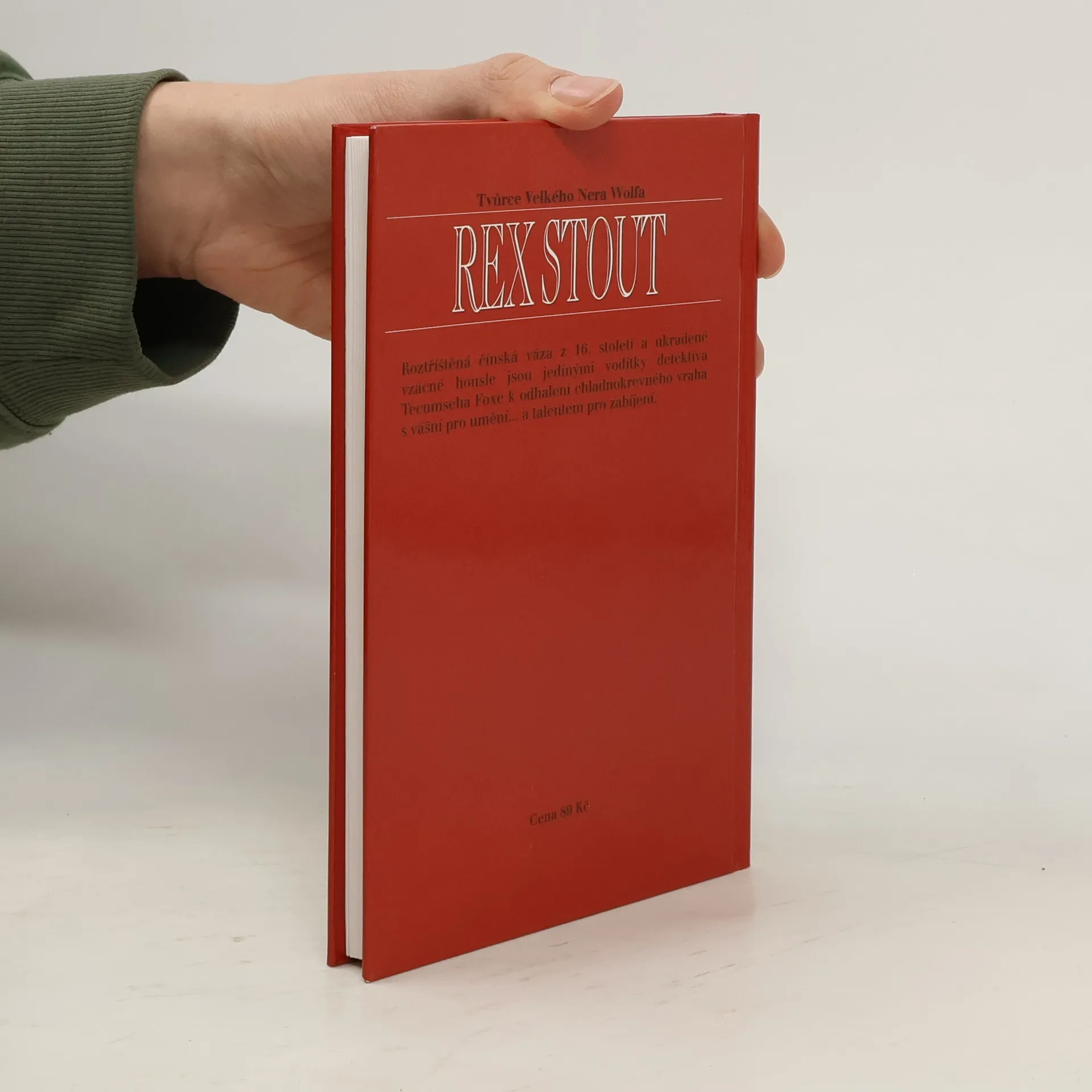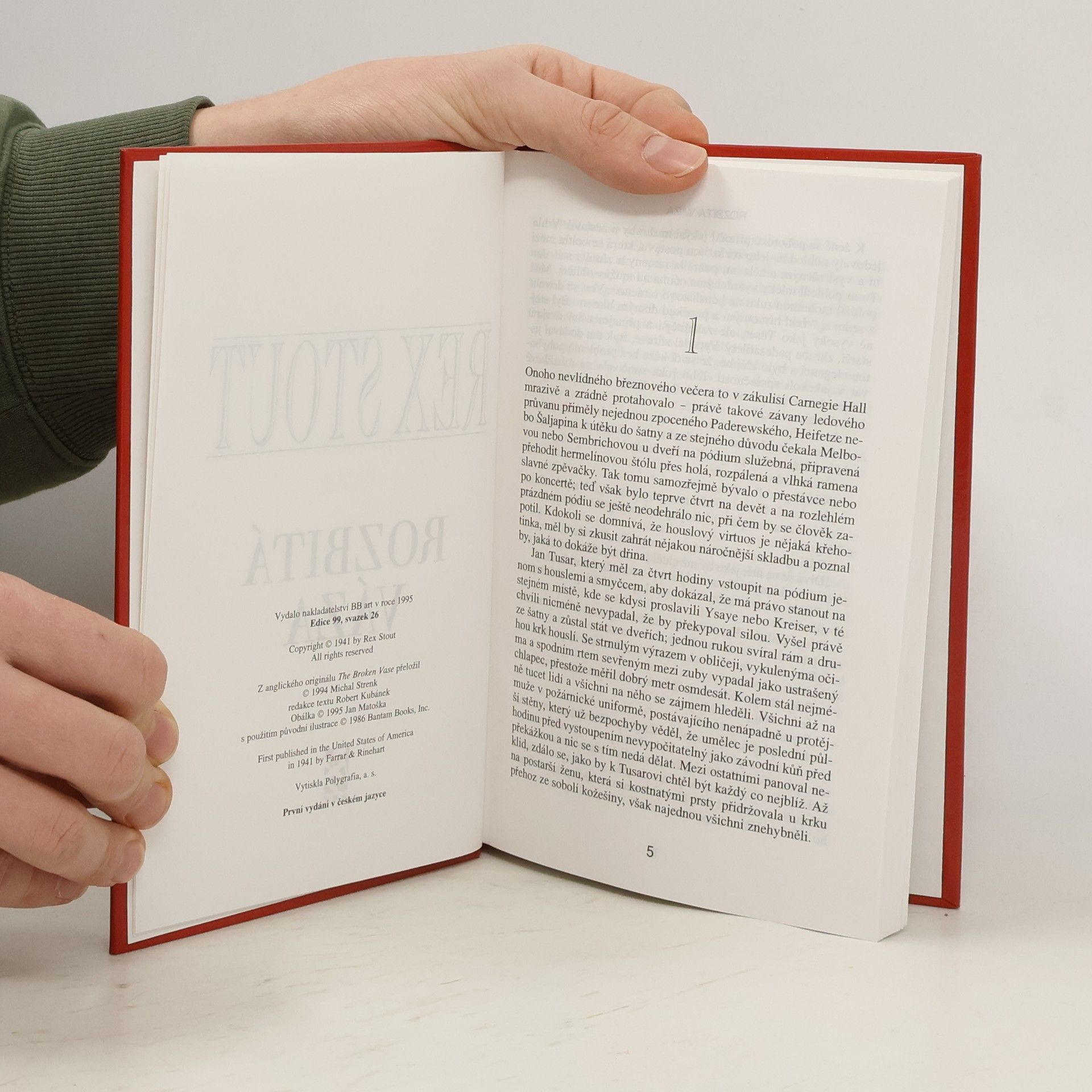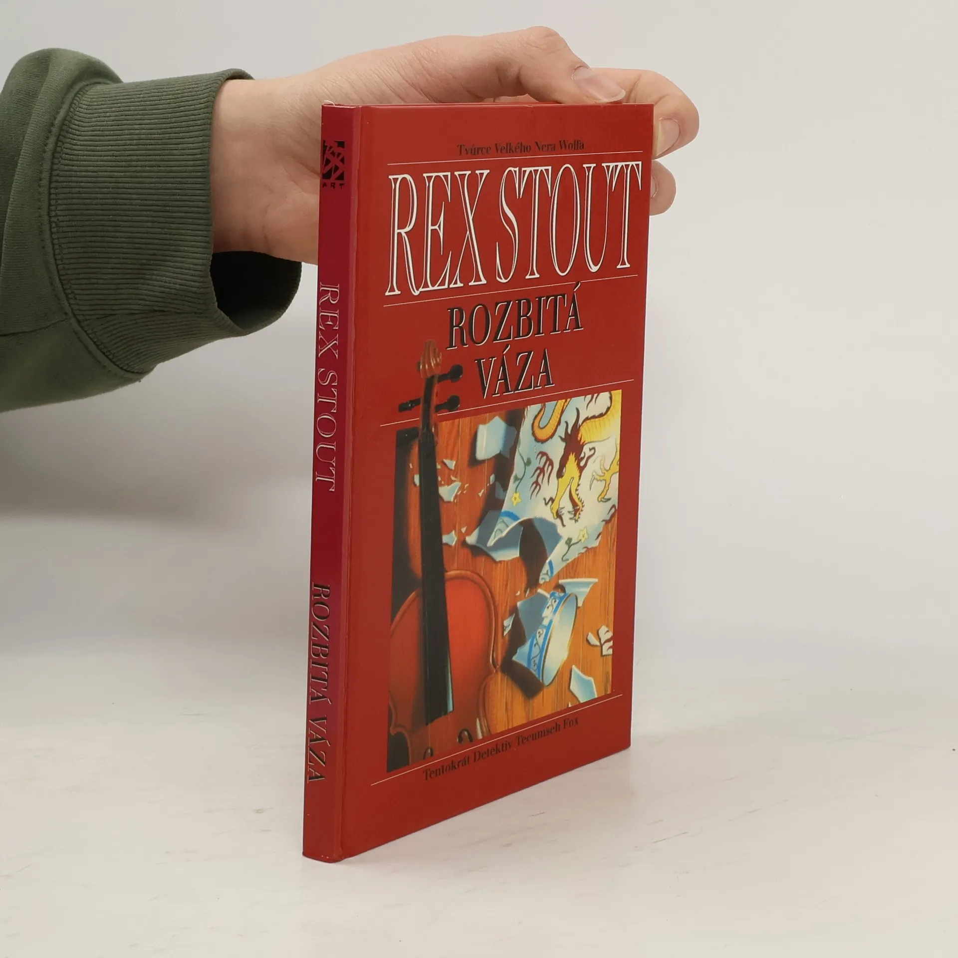 Podtitul: „Tentokrát Detektiv Tecumseh Fox“. Roztříštěná čínská váza z 16.století a poškozené vzácné housle jsou jedinými vodítky detektiva Foxe k odhalení chladnokrevného vraha s vášní pro umění. Z anglického originálu „The Broken Vase“ (First published in the United states ofAmerica in 1941 by Farrar Rinehart) přeložil © Michal Strenk. Grafická úprava obálky Jan Matoška, Robin Brichta s použitím původní ilustrace ©1986 Bantam Books, Inc. Lesklé tvrdé laminované desky.