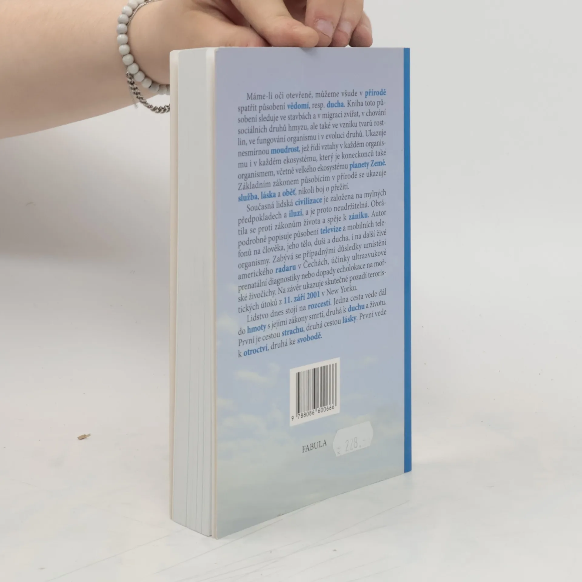 I v přírodě, nejen v lidské společnosti, působí velká inteligence a moudrost. Při pozornějším pohledu navíc zjistíme, že základním zákonem přírody není boj o přežití, nýbrž symbióza a vzájemná služba, láska a oběť. Lidská společnost však uvěřila, že konkurence a boj povedou k pokroku a obecnému blahu, postavila se proti zákonitosti řádu a spěje nutně ke svému zániku. Na příkladech televize, mobilních telefonů, instrumentalizovaného porodu nebo událostí z 11. září 2001 autor ukazuje rozcestí, na němž se dnes lidstvo jako celek i každý z nás nachází: jedna cesta, cesta strachu, vede k otroctví, druhá, cesta lásky, ke svobodě.