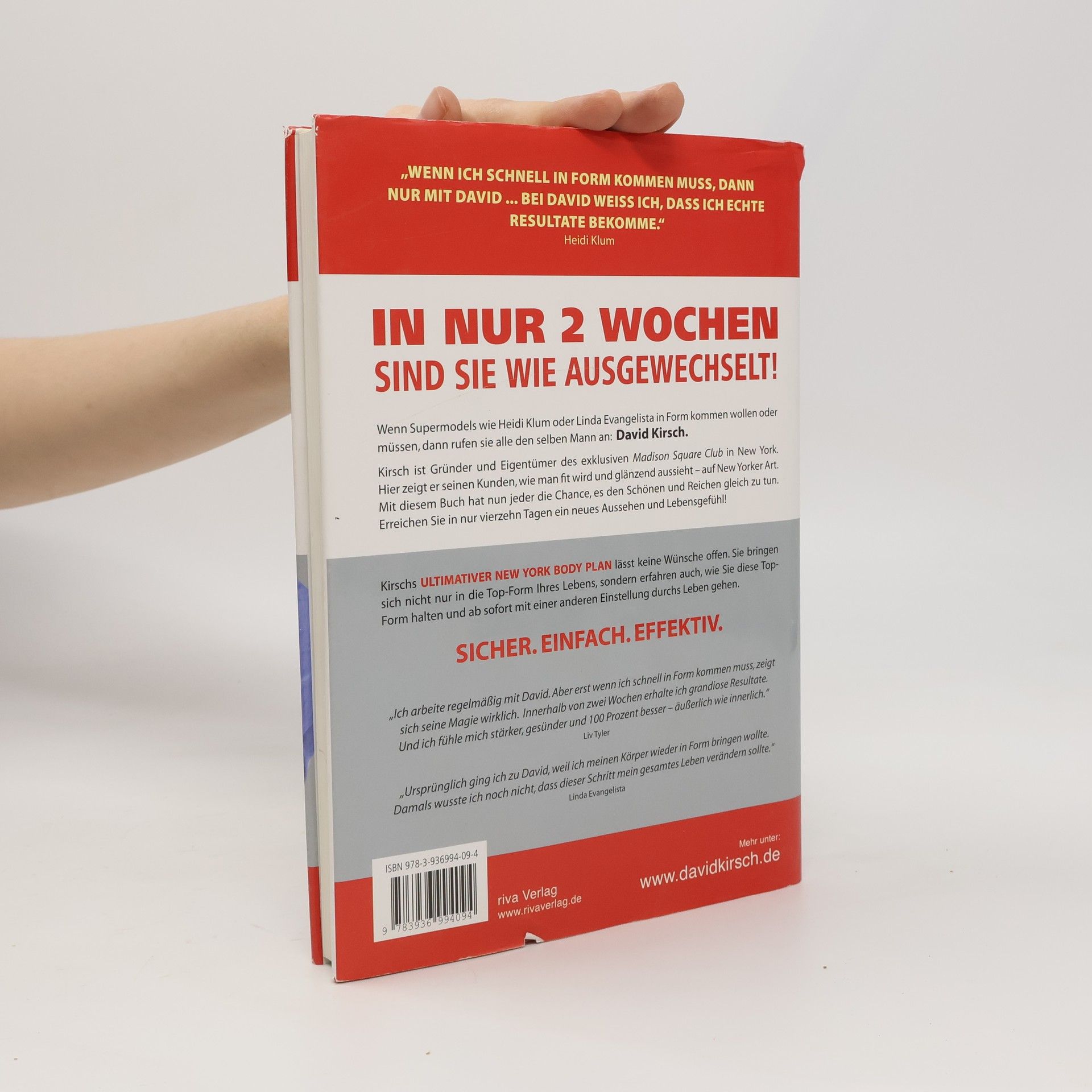 Fit und schön - in nur 14 Tagen Wenn Supermodells wie Heidi Klum oder Bridget Hall in Form kommen wollen oder müssen, dann rufen sie alle den selben Mann an: David Kirsch. Kirsch ist Gründer und Eigentümer des exklusiven Madison Square Club in New York. Hier zeigt er seinen Kunden, wie man fit wird. Auf New Yorker Art. Kirsch kombiniert 3 Faktoren zu seinem "New York Body Plan": Körperliche Anstrengung, Ernährung und Motivation. Und bisher hat er immer gehalten, was er verspricht: Die totale Transformation in nur zwei Wochen. Mit diesem Buch hat nun jeder die Chance, es den Schönen und Reichen gleich zu tun. Durch eine ausgewogene Ernährung (alle wohlschmeckende Rezepte finden sich im Anhang), mehrere kurze Trainingseinheiten pro Tag und vielen Fakten, die den Leser immer wieder motivieren, erreicht man mit dem Buch schnell sein Ziel. In nur vierzehn Tagen wieder fit und in Form.