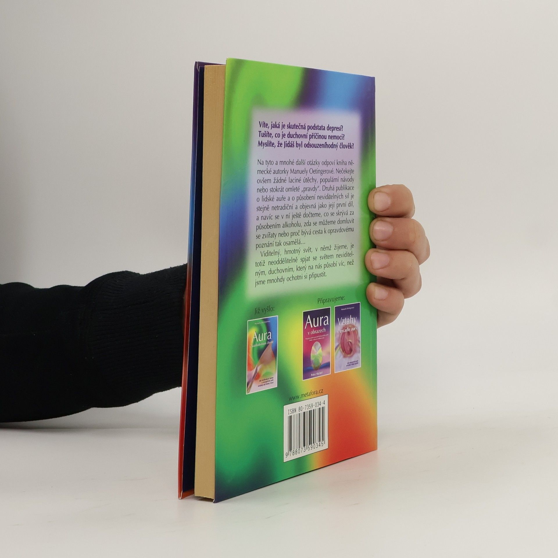 Víte, jaká je skutečná podstata depresí? Tušíte, co je duchovní příčinou nemoci? Myslíte, že Jidáš byl odsouzeníhodný člověk? Na tyto a mnohé další otázky odpoví kniha německé autorky Manuely Oetingerové. Nečekejte ovšem žádné laciné útěchy, populární návody nebo stokrát omleté „pravdy“. Druhá publikace o lidské auře a o působení neviditelných sil je stejně netradiční a objevná jako její první díl, a navíc se v ní ještě dočteme, co se skrývá za působením alkoholu, zda se můžeme domluvit se zvířaty nebo proč bývá cesta k opravdovému poznání tak osamělá… Viditelný, hmotný svět, v němž žijeme, je totiž neoddělitelně spjat se světem neviditelným, duchovním, který na nás působí víc, než jsme mnohdy ochotni si připustit.