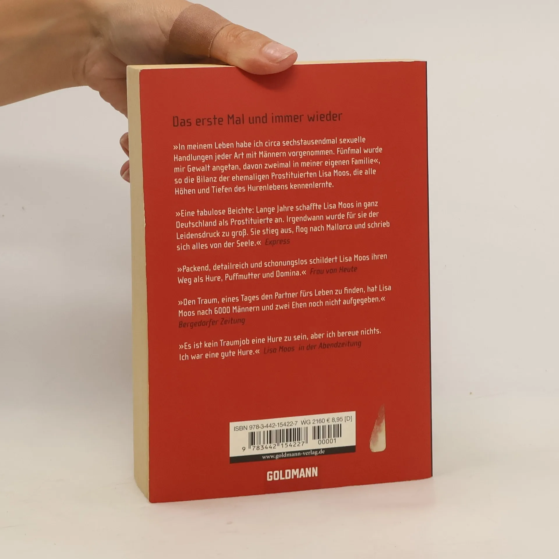 Lisa Moos arbeitete mehr als zwanzig Jahre als Hure. Das hat sie sich nicht ausgesucht – Not und enttäuschte Liebe haben sie auf diesen Weg gebracht. Bis heute hat Lisa Moos alle Spielarten der Leidenschaft erfahren: Perversion und Erniedrigung, aber auch Freundschaft und Liebe in einer Welt, die ihren eigenen Regeln und Gesetzen folgt. Das erste Mal und immer wieder beschreibt den Liebes- und Leidensweg einer Prostituierten. Detailliert und in klaren Worten erzählt Lisa Moos von ihrem Leben als Straßenhure und Edeldirne, von schönen und erschreckenden Erfahrungen aus dem Rotlichtmilieu und der Welt der käuflichen Liebe, aber auch von ihren Wünschen und Träumen und den Bemühungen, sich ein eigenes Leben aufzubauen…