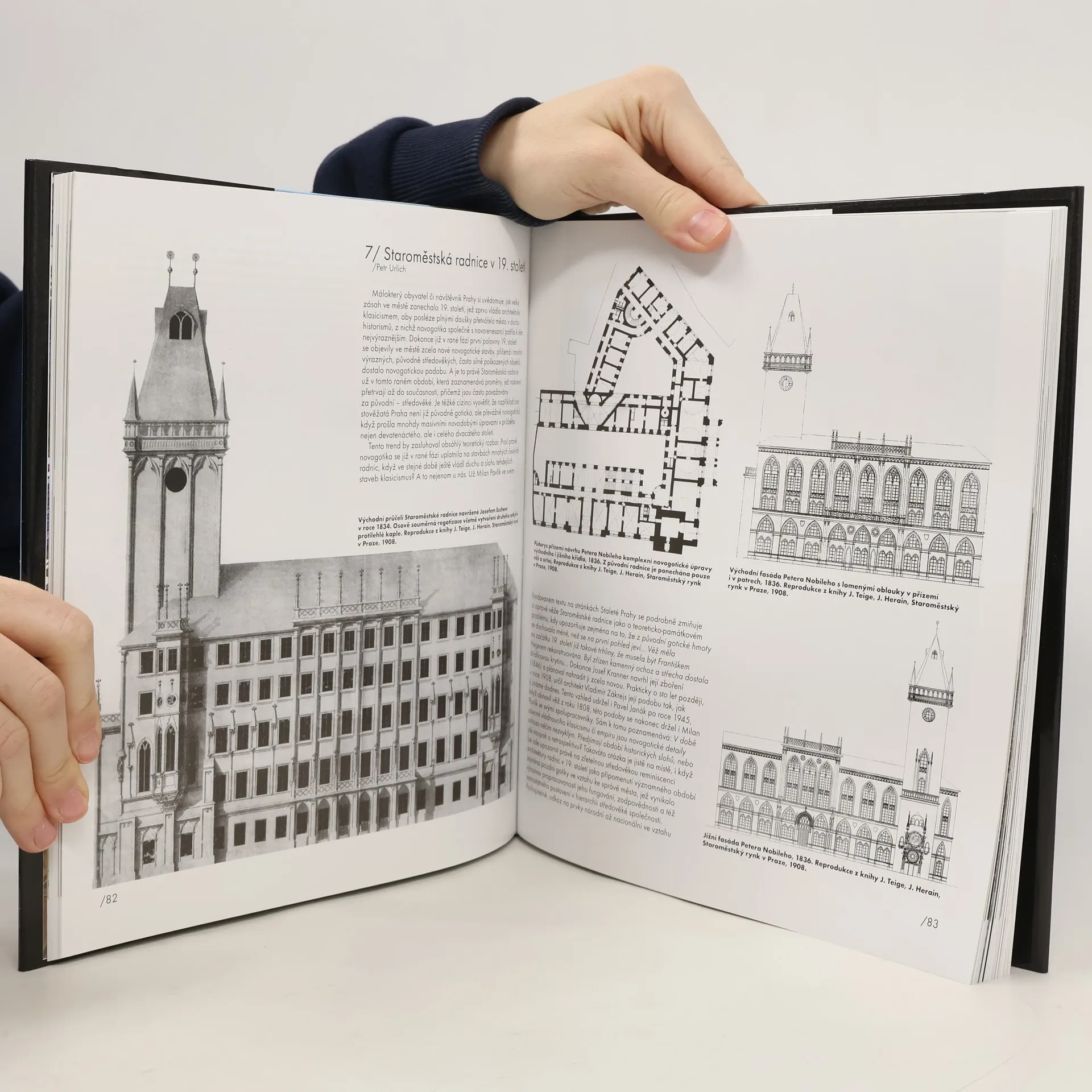 Samostatnou kapitolu dějin radnice, ale také rozsáhlou, bohatě dokumentovanou kapitolu publikace představuje historie staroměstského orloje a jeho výzdoba. Publikace prochází architektonickým vývojem radnice, jeho historickými sály, představuje sochařskou a uměleckou výzdobu a také představuje významné pražské purkmistry, starosty a primátory. Zajímavou kapitolou je procházka osmi architektonickými soutěžemi na přestavby a dostavbu Staroměstské radnice, které proběhly mezi léty 1901 až 1987. Seznam autorů: Pavel Vlček (ed.), Zdeněk Dragoun, Václav Ledvinka, Klára Benešovská, Jan Chlíbec, Jiří Roháček, Petr Urlich, Katarína Mašterová, Josef Hájek, Petr Skála, Petr Malinský, René Tikal, Vladimír Šlapeta