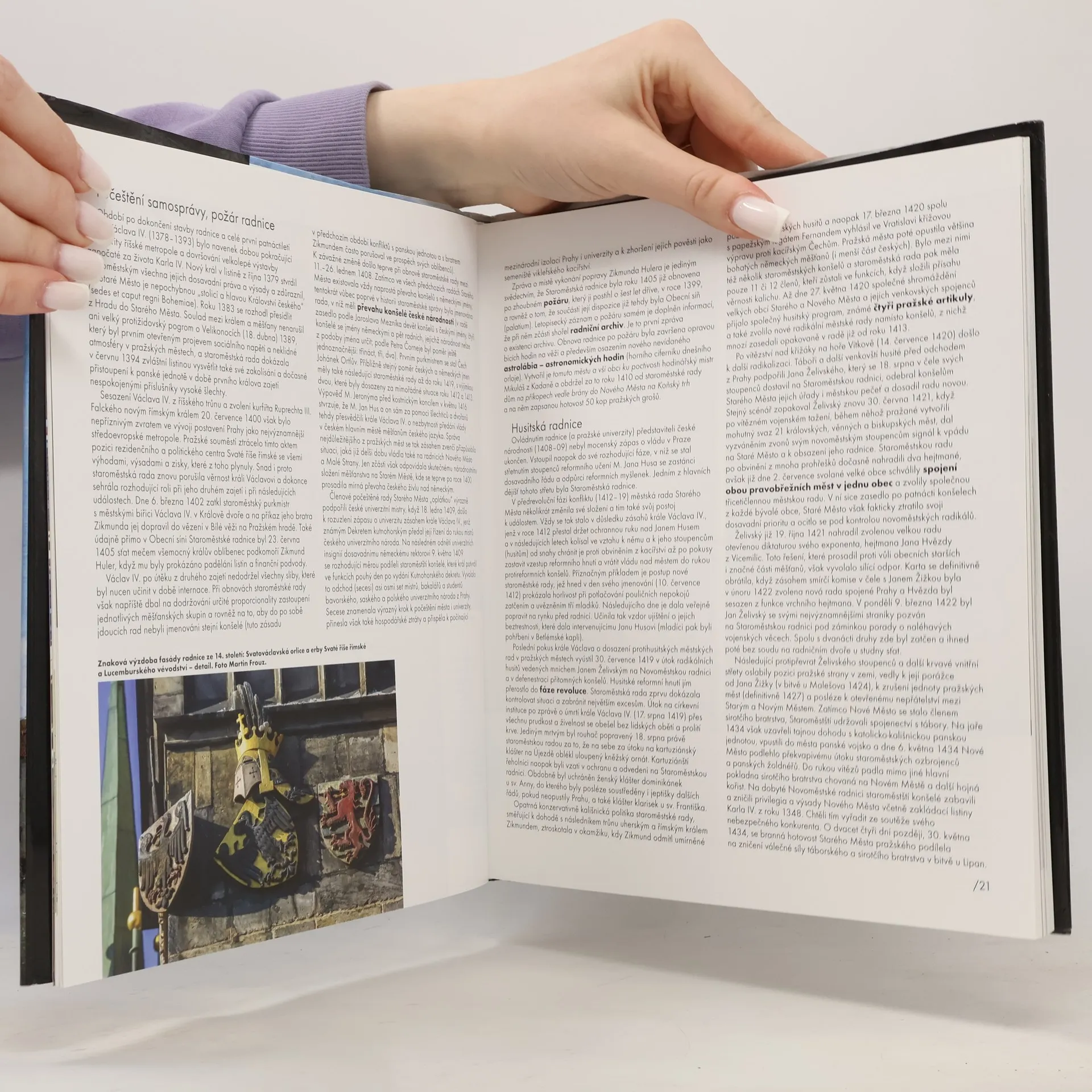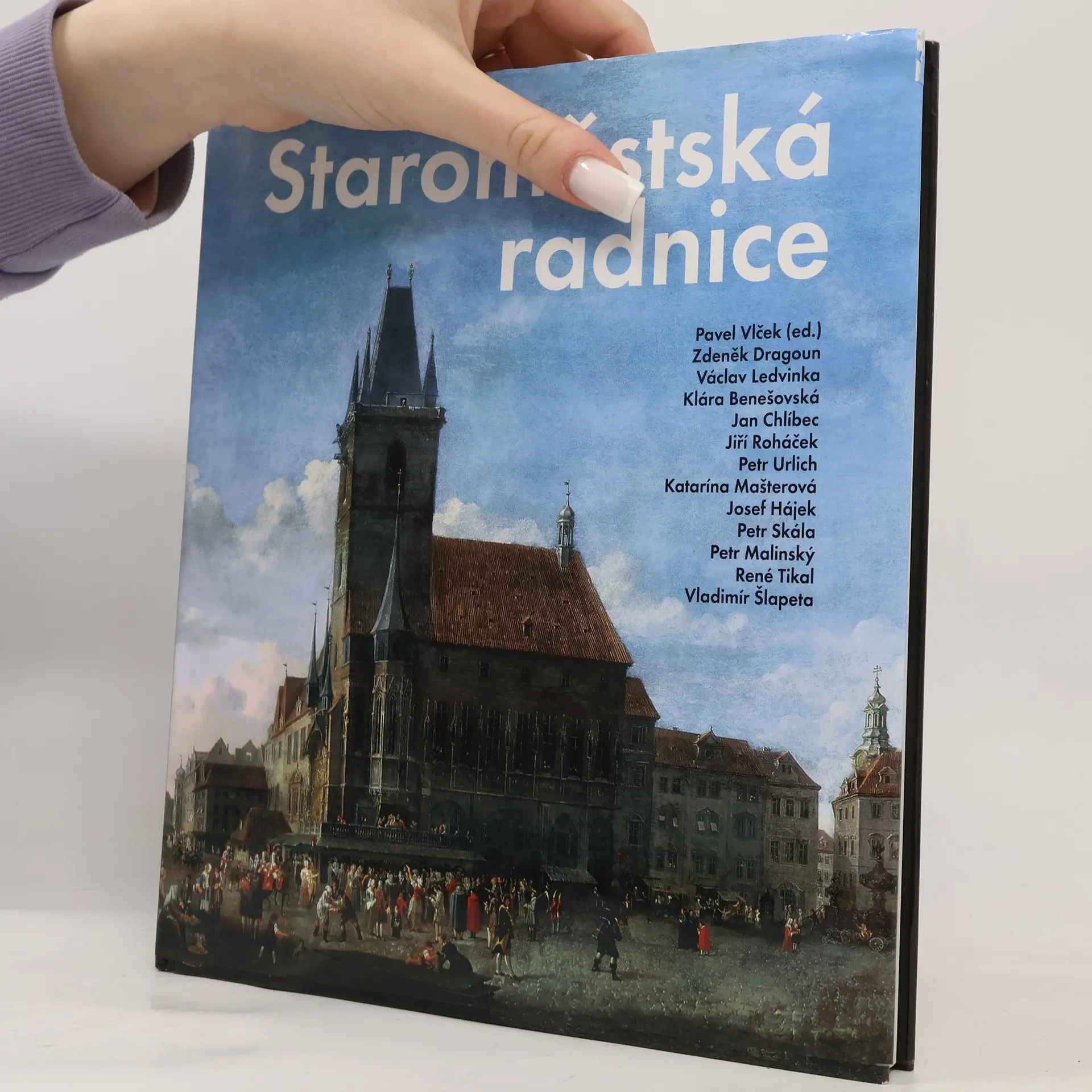Samostatnou kapitolu dějin radnice, ale také rozsáhlou, bohatě dokumentovanou kapitolu publikace představuje historie staroměstského orloje a jeho výzdoba. Publikace prochází architektonickým vývojem radnice, jeho historickými sály, představuje sochařskou a uměleckou výzdobu a také představuje významné pražské purkmistry, starosty a primátory. Zajímavou kapitolou je procházka osmi architektonickými soutěžemi na přestavby a dostavbu Staroměstské radnice, které proběhly mezi léty 1901 až 1987. Seznam autorů: Pavel Vlček (ed.), Zdeněk Dragoun, Václav Ledvinka, Klára Benešovská, Jan Chlíbec, Jiří Roháček, Petr Urlich, Katarína Mašterová, Josef Hájek, Petr Skála, Petr Malinský, René Tikal, Vladimír Šlapeta