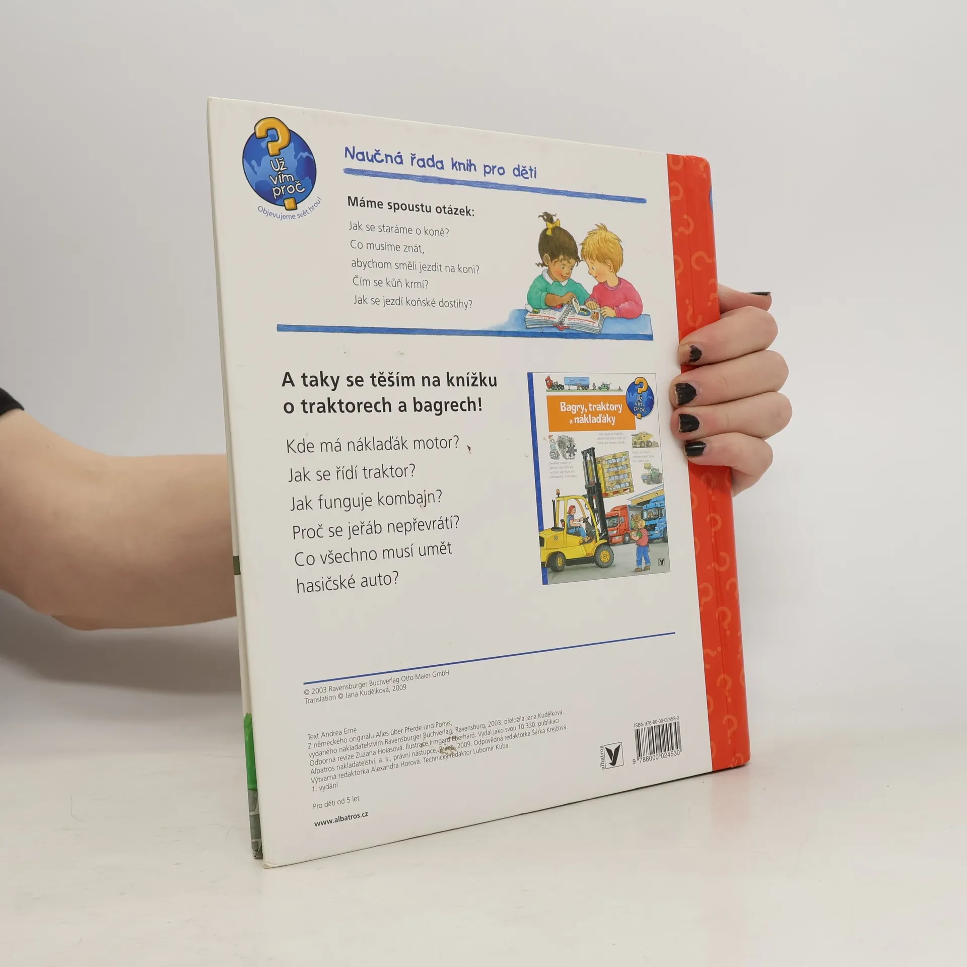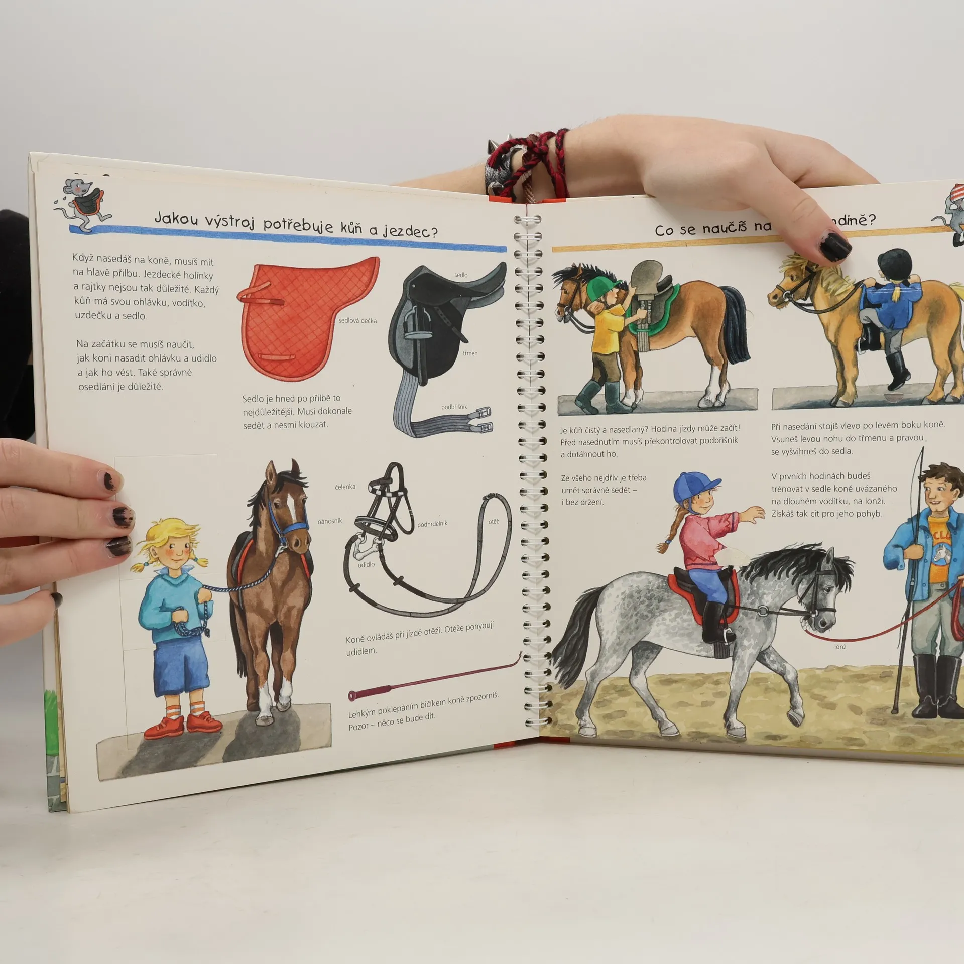 Na několika stránkách mnoho informací podaných slovy, a především obrázky! Dítě se dostane na jízdárnu i do přírody, naučí se pojmenovat každou část koňského těla a rozeznat druhy koní, dozví se, co mají koně rádi, kdy se cítí dobře a jak to poznáme. Najde tu i celou řadu zajímavostí. Zkrátka vše o koních a ponících v důsledném propojení textu s ilustracemi.