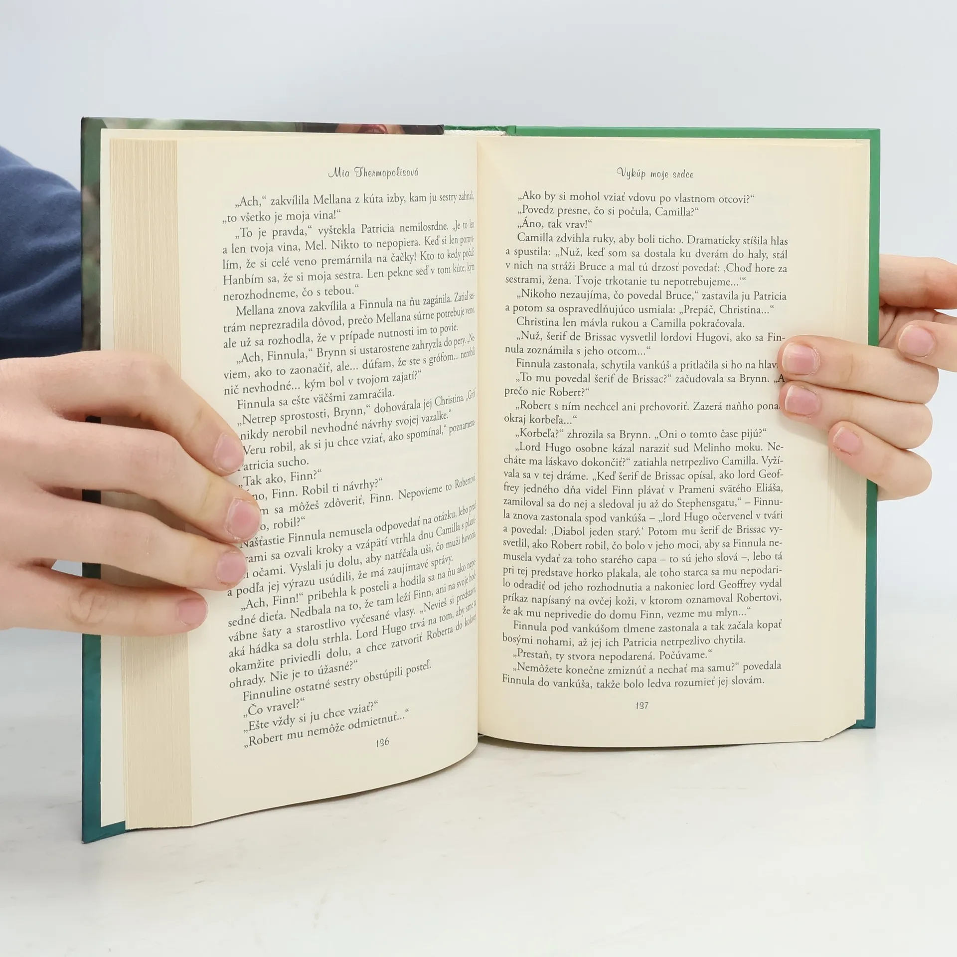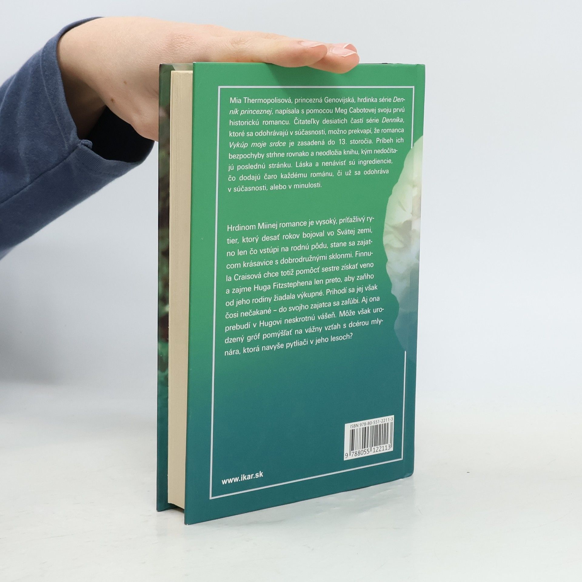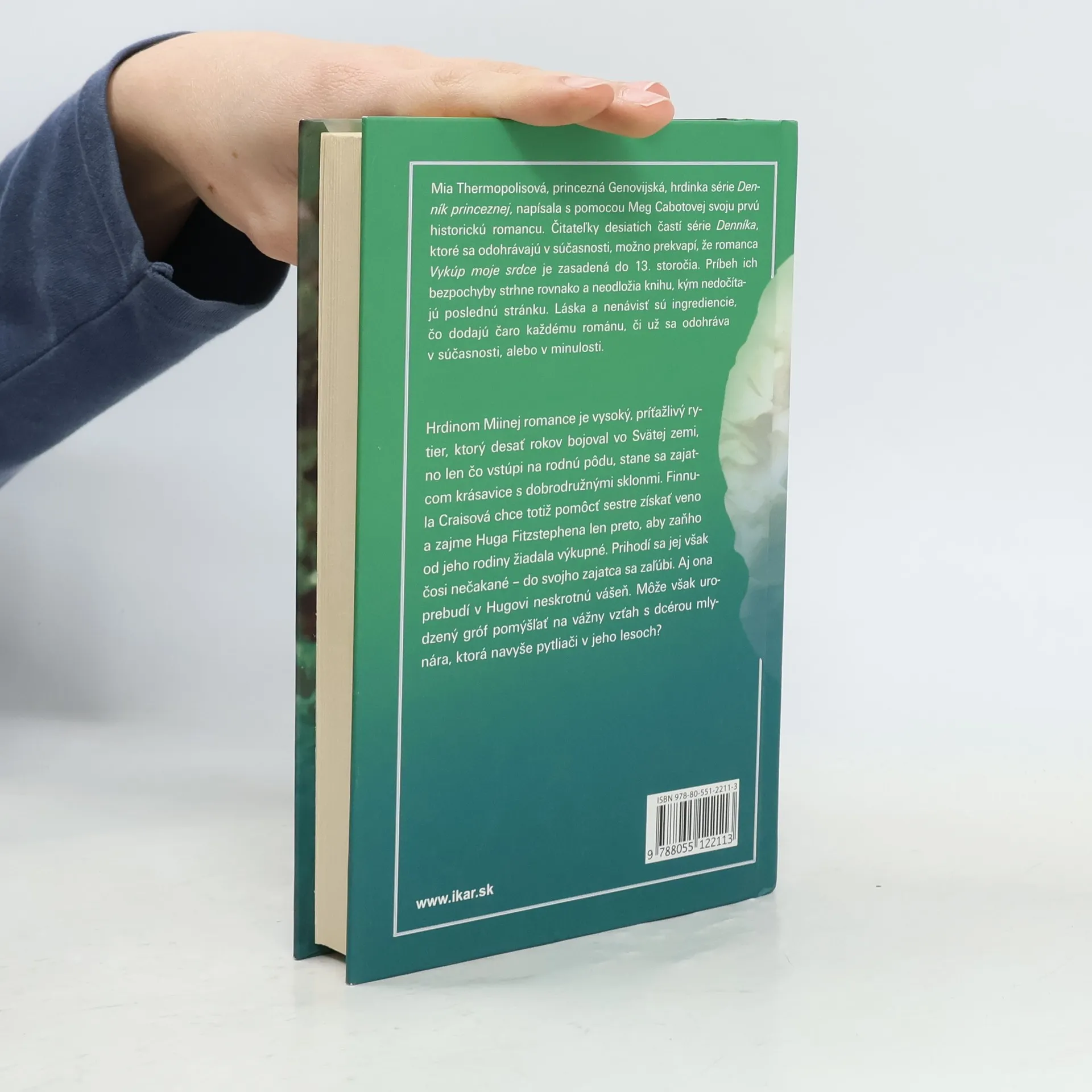 Mia Thermopolisová, princezná Genovijská, hrdinka série Denník princeznej, napísala s pomocou Meg Cabotovej svoju prvú historickú romancu. Čitateľky desiatich častí série Denníka, ktoré sa odohrávajú v súčasnosti, možno prekvapí, že romanca Vykúp moje srdce je zasadená do 13. storočia. Príbeh ich bezpochyby strhne rovnako a neodložia knihu, kým nedočítajú poslednú stránku. Láska a nenávisť sú ingrediencie, čo dodajú čaro každému románu, či už sa odohráva v súčasnosti, alebo v minulosti. Hrdinom Miinej romance je vysoký, príťažlivý rytier, ktorý desať rokov bojoval vo Svätej zemi, no len čo vstúpi na rodnú pôdu, stane sa zajatcom krásavice s dobrodružnými sklonmi. Finnula Craisová chce totiž pomôcť sestre získať veno a zajme Huga Fitzstephena len preto, aby zaňho od jeho rodiny žiadala výkupné. Prihodí sa jej však čosi nečakané – do svojho zajatca sa zaľúbi. Aj ona prebudí v Hugovi neskrotnú vášeň. Môže však urodzený gróf pomýšľať na vážny vzťah s dcérou mlynára, ktorá navyše pytliači v jeho lesoch?