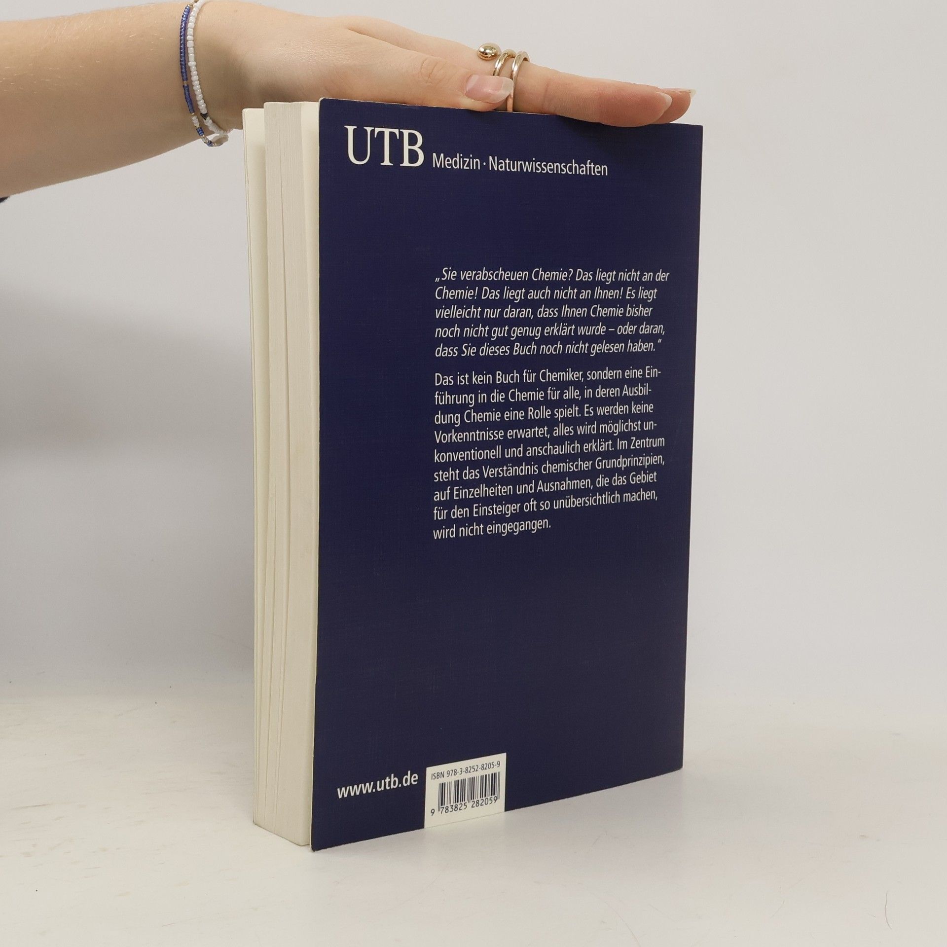 "Sie verabscheuen Chemie? Das liegt nicht an der Chemie! Das liegt auch nicht an Ihnen! Es liegt vielleicht nur daran, dass Ihnen Chemie bisher noch nicht gut genug erklärt wurde - oder daran, dass Sie dieses Buch noch nicht gelesen haben." Das ist kein Buch für Chemiker, sondern eine Einführung in die Chemie für alle, in deren Ausbildung Chemie eine Rolle spielt. Es werden keine Vorkenntnisse erwartet, alles wird möglichst unkonventionell und anschaulich erklärt. Im Zentrum steht das Verständnis chemischer Grundprinzipien, auf Einzelheiten und Ausnahmen, die das Gebiet für den Einsteiger oft so unübersichtlich machen, wird nicht eingegangen.