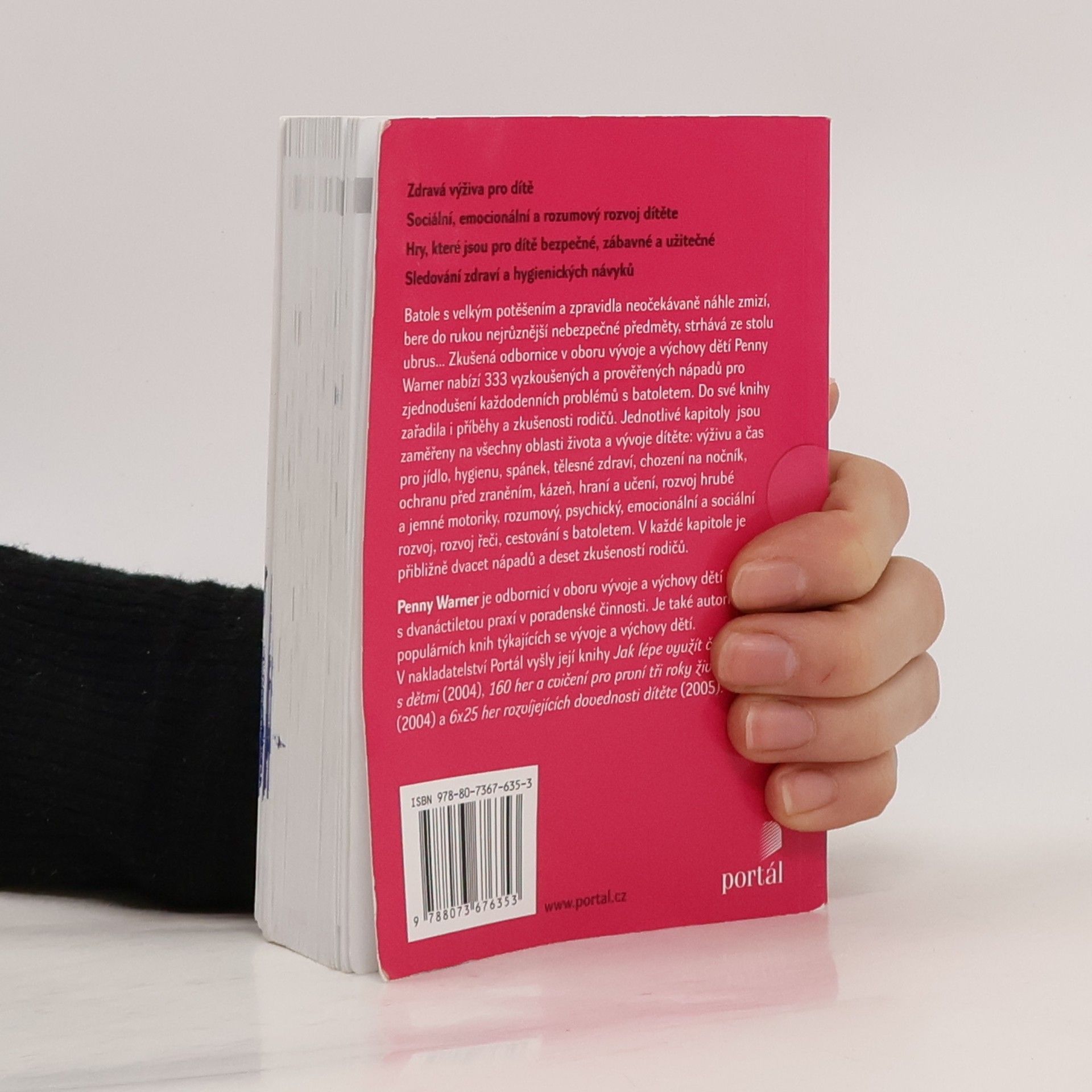 Osvědčené tipy a rady pro rodiče dětí ve věku od 1 do 3 let* Zdravá výživa pro dítě* Sociální, emocionální a rozumový rozvoj dítěte* Rozvoj jazykových a pohybových dovedností* Hry, které jsou pro dítě bezpečné, zábavné a užitečné* Cestování bez stresu* Sledování zdraví a hygienických návykůBatole s velkým potěšením zpravidla neočekávaně náhle zmizí, bere do rukou nejrůznější nebezpečné předměty, které si pak většinou dává i do pusy, strhává ze stolu ubrus i s nádobím... Jako rodiče batolete máte mnoho úloh: anděla strážného, živitele, učitele, šéfa, spoluhráče a další. Zkušená odbornice v oboru vývoje P. Warner nabízí 333 vyzkoušených a prověřených nápadů pro zjednodušení každodenních starostí. Nabízí i příběhy a zkušenosti mnoha rodičů batolat. Kapitoly jsou zaměřeny na všechny oblasti života a vývoje dítěte: výživa a čas pro jídlo, hygiena, spánek, tělesné zdraví, chození na nočník, ochrana před zraněním, kázeň, hraní a učení, rozvoj hrubé a jemné motoriky, rozumový, psychický, emocionální a sociální rozvoj, rozvoj řeči, cestování s batoletem. V každé kapitole je dvacet nápadů a deset zkušeností některého rodiče batolete.