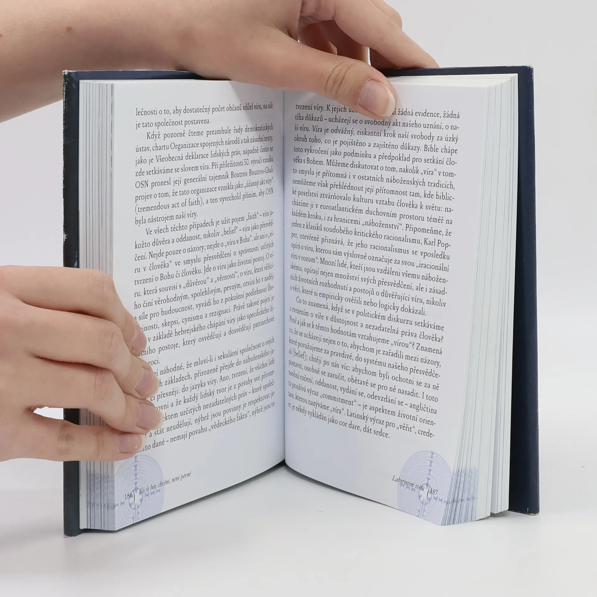 Zkušenosti z cest po všech šesti kontinentech Země i z hledání vlastního místa v náboženském a občansko-politickém životě jsou autorovi východiskem pro čtrnáct úvah o stěžejních duchovních a civilizačních problémech naší doby. Na cestě labyrintem dnešního světa, labyrintem vlastního osudu i labyrintem soudobého filozofického a náboženského myšlení autor rozvíjí trvalý dialog víry a pochybnosti jako dvou sester, které se vzájemně potřebují a doplňují.